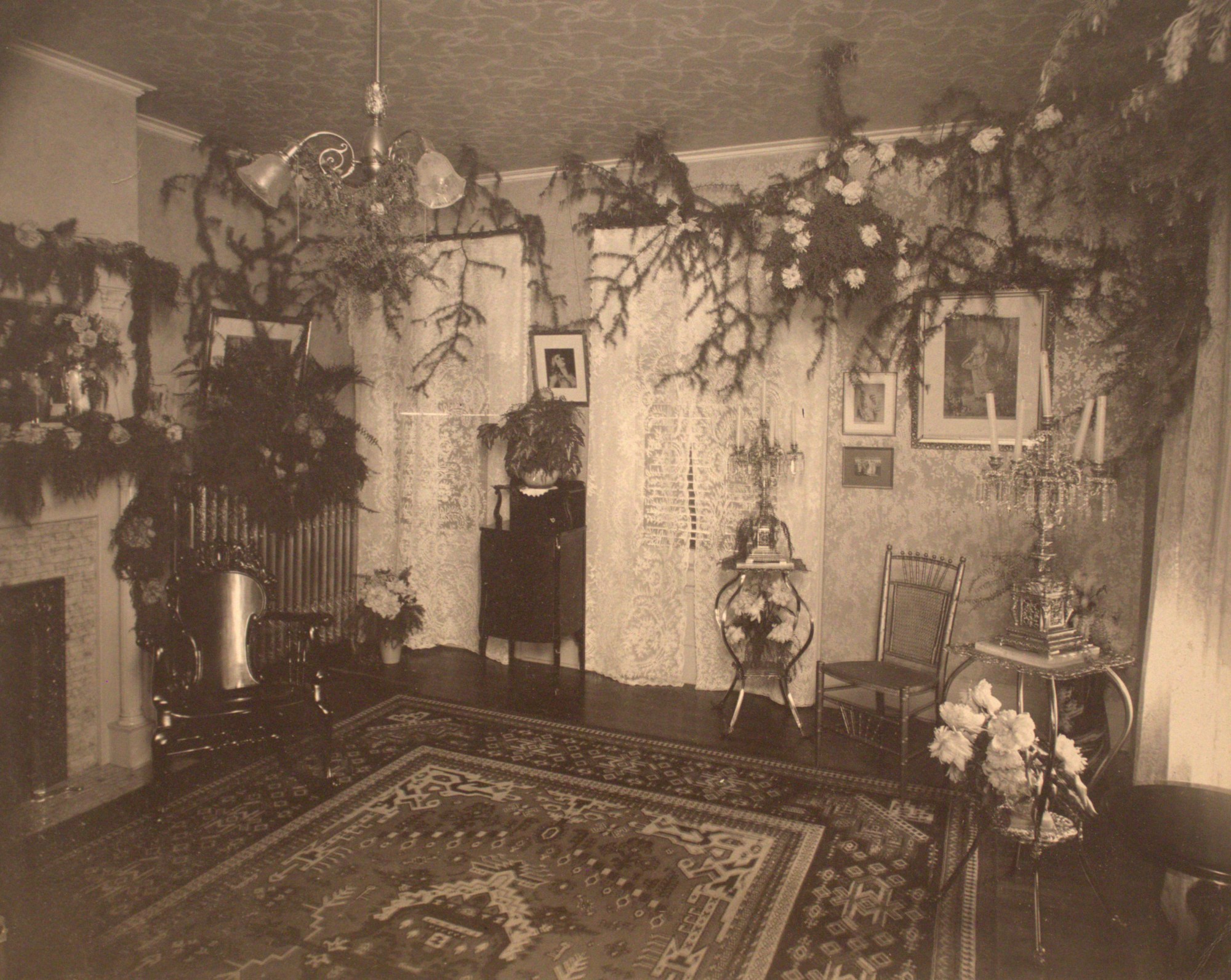 Depicts a parlor decorated with floral sprays and branches in the vicinity of Dolgeville or Little Falls, New York. A Stickley-Brandt chair is visible near the fireplace.