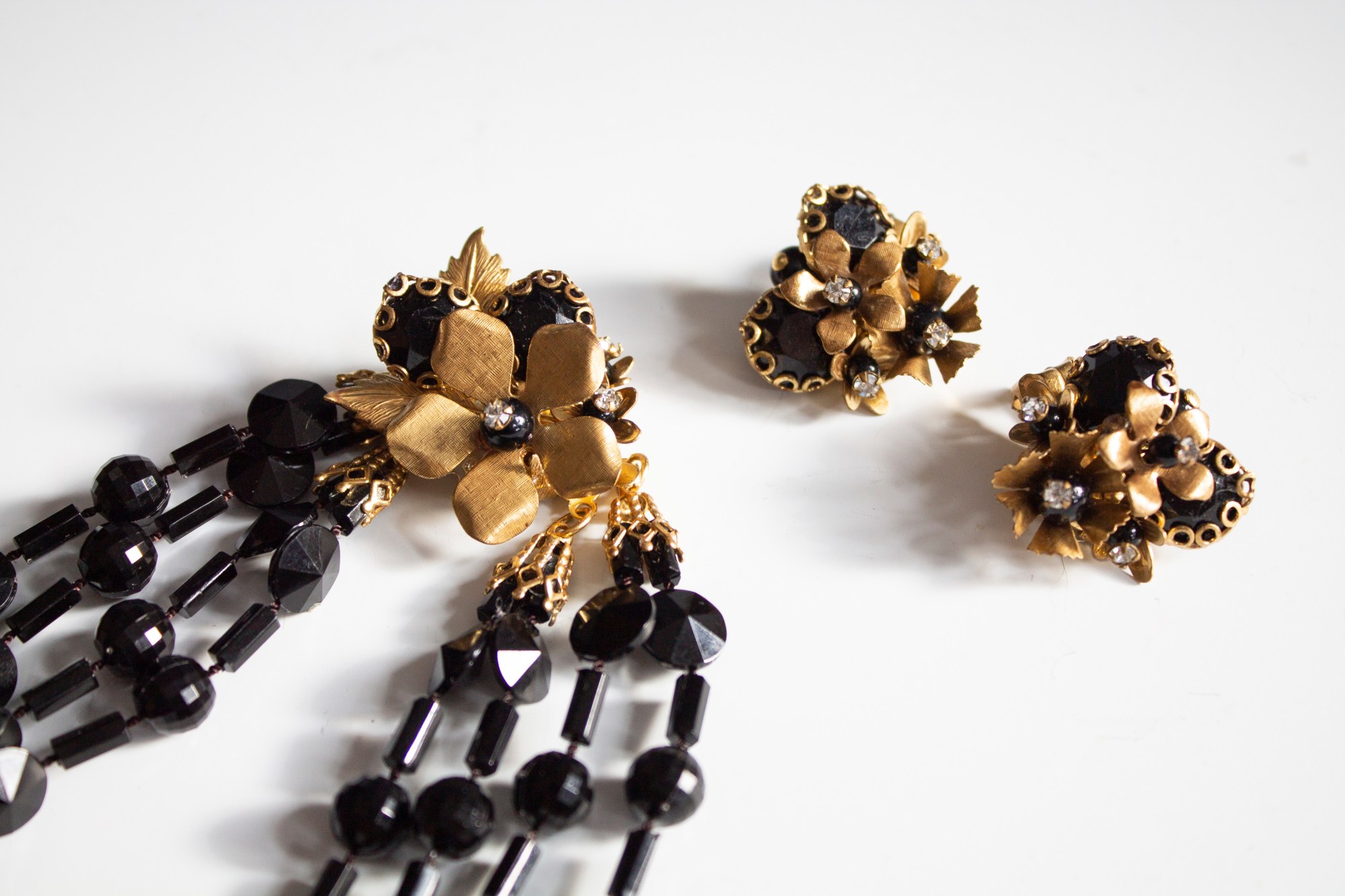 Multi-strand necklace with elaborate floral clasp and matching clip-on earrings.