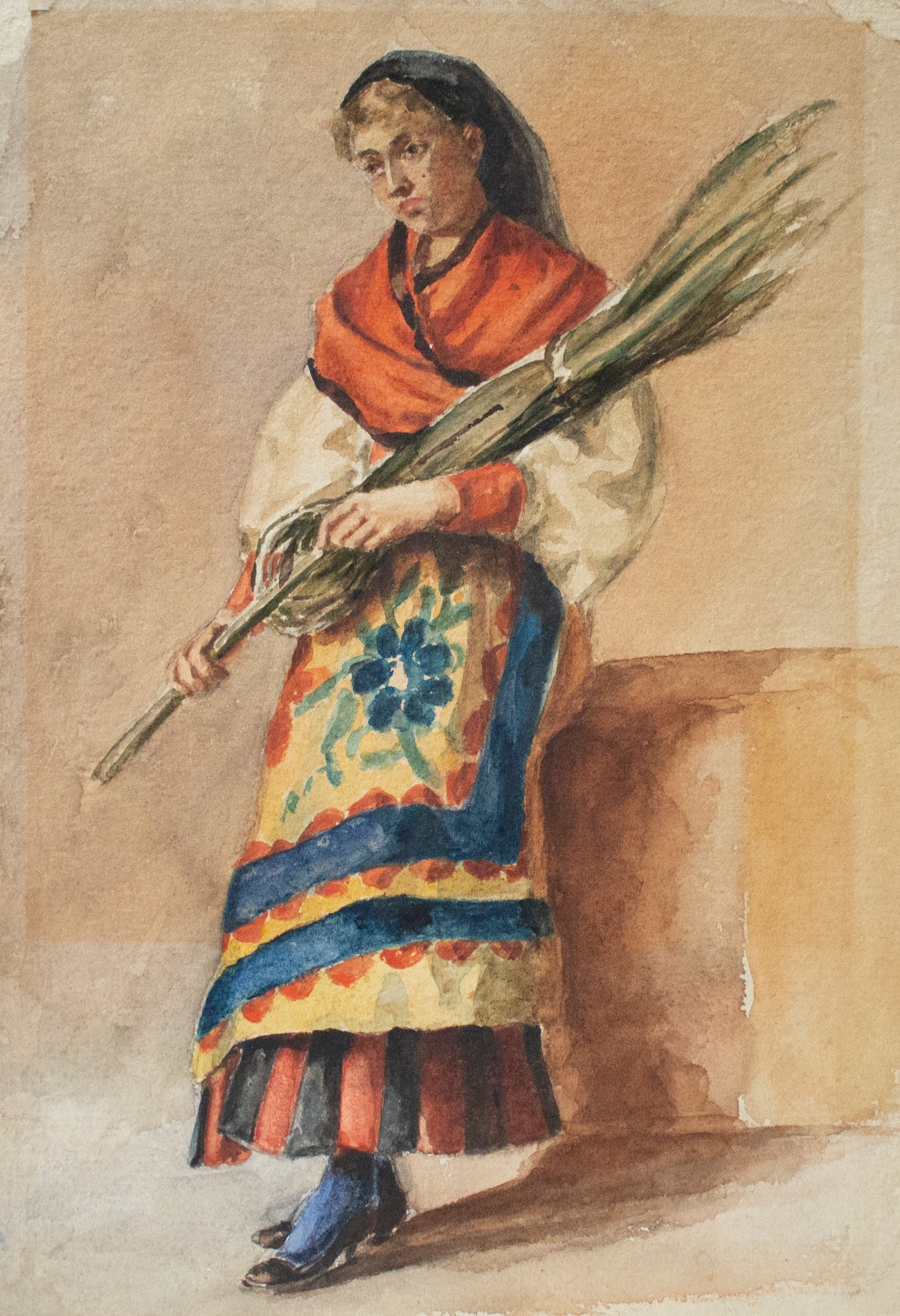 Depicts an Italian peasant girl holding a dried palm frond.
