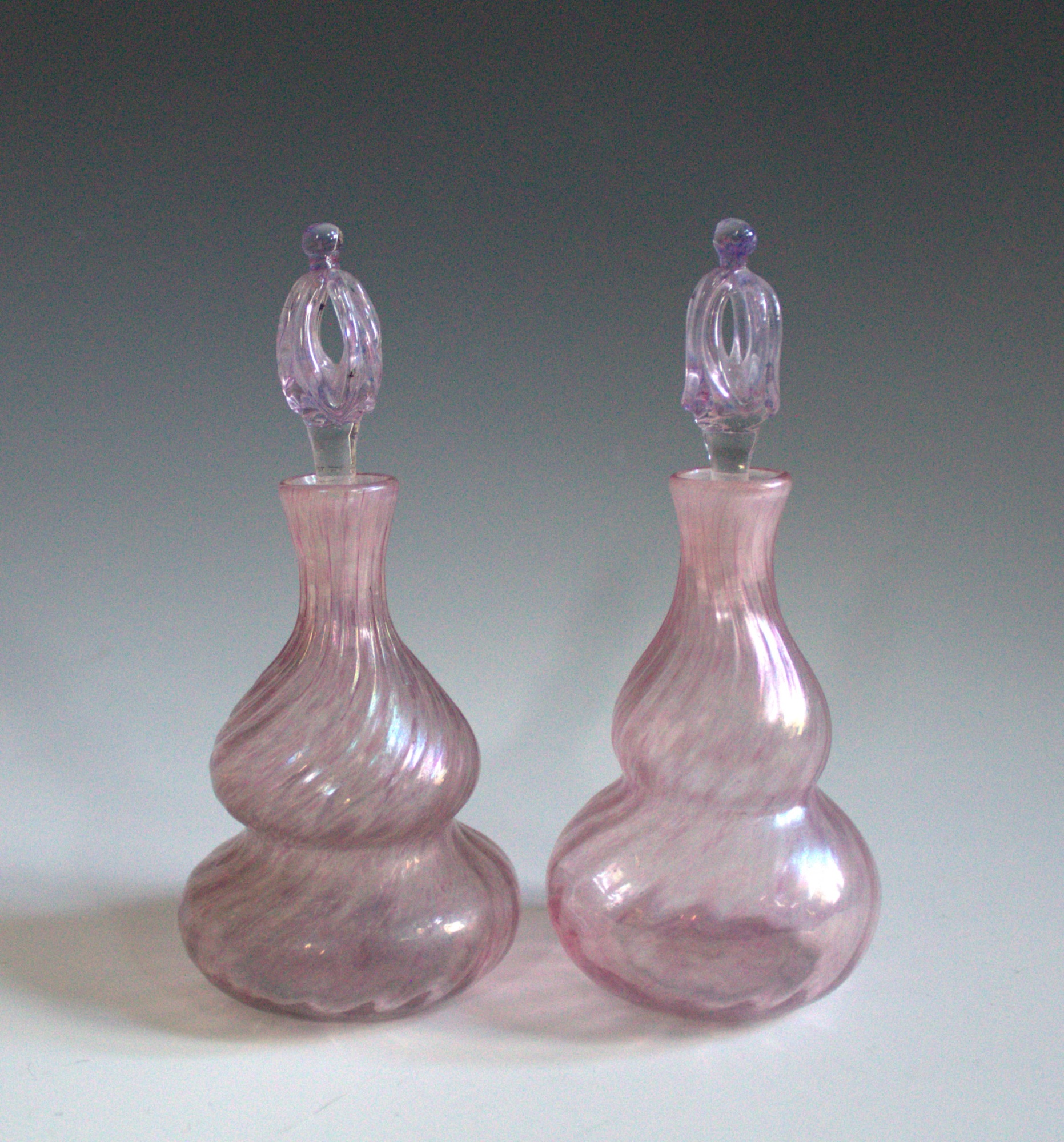 Pair of purple blown and molded glass perfume bottles with lampwork stoppers.