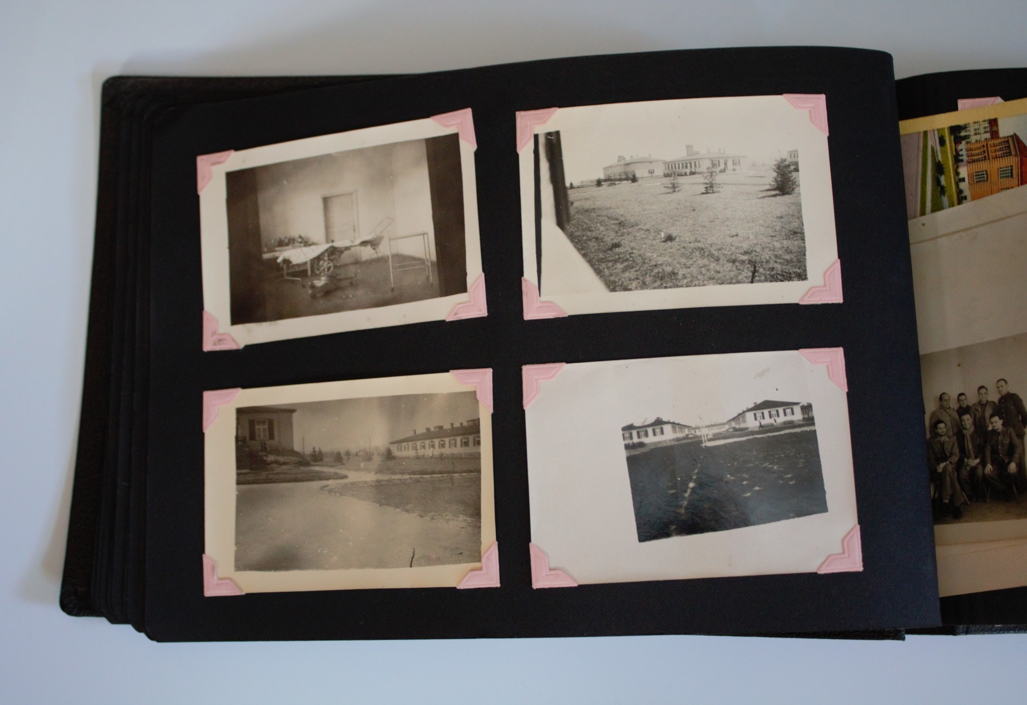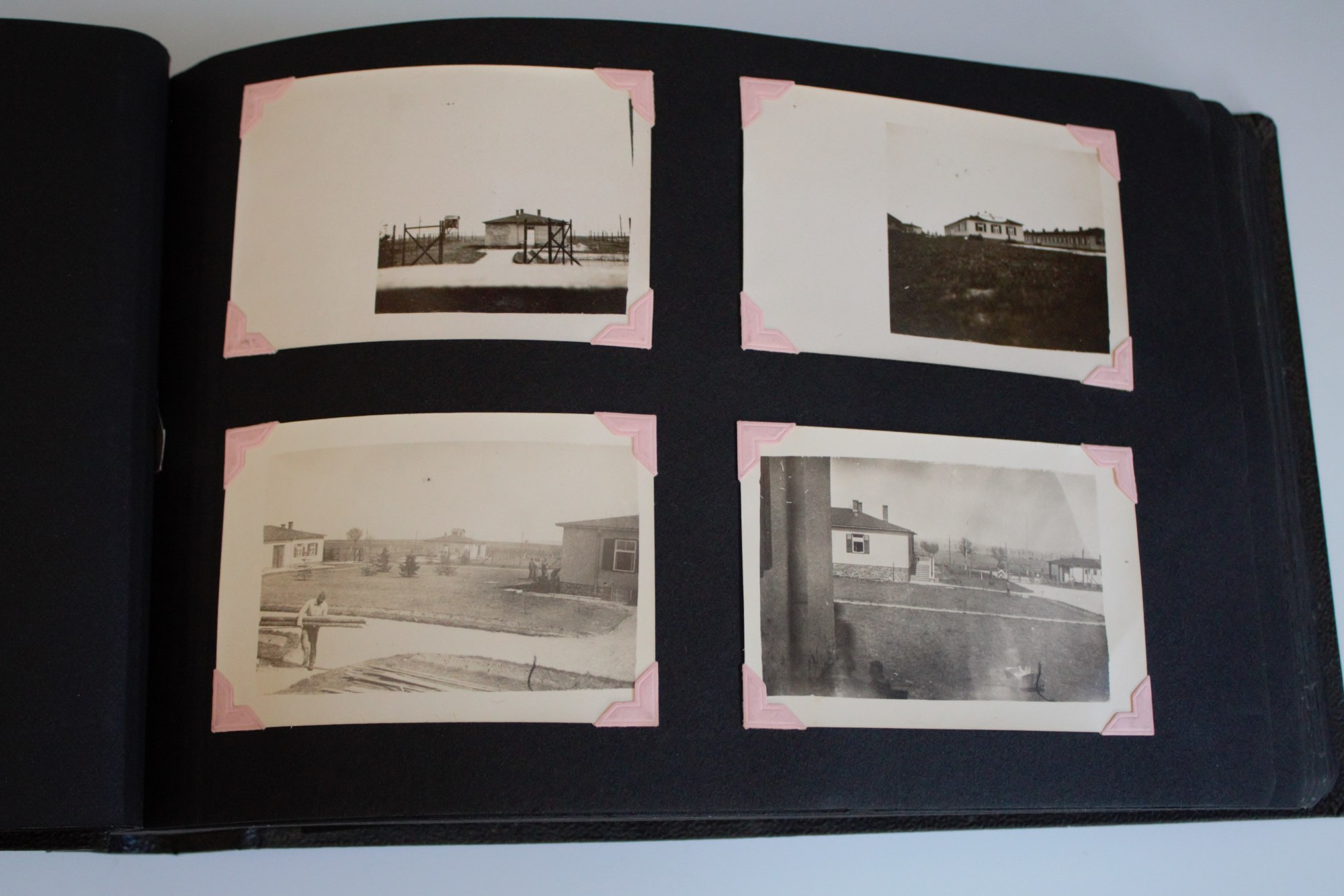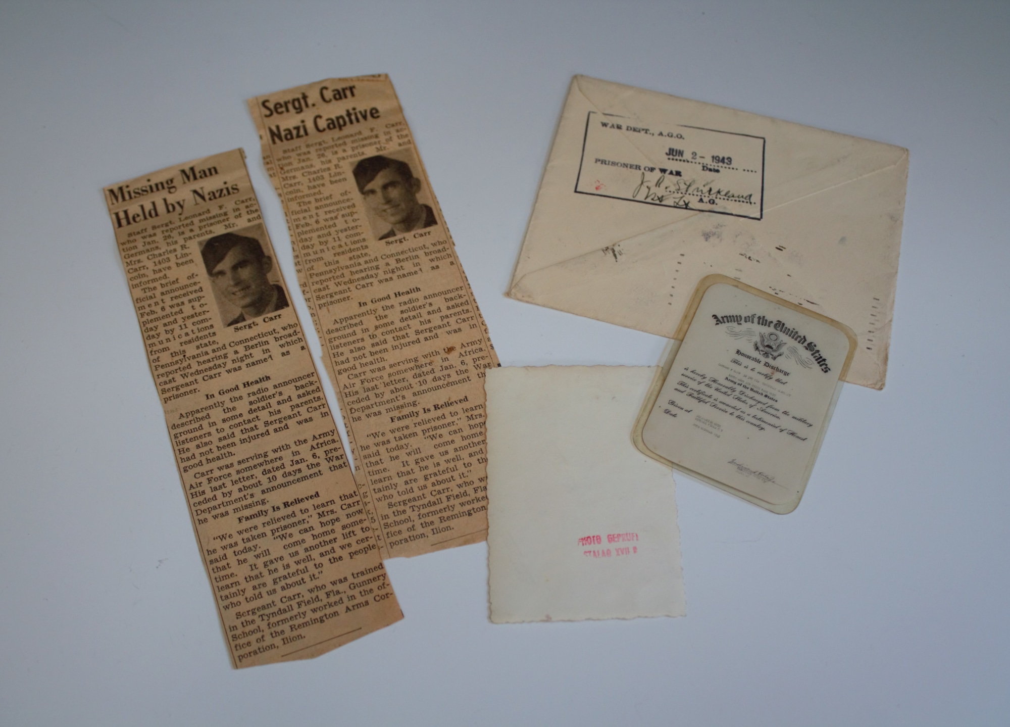 Photo album belonging to Leonard F. Carr (32369912) of 1403 Lincoln Ave., Utica, New York. The album contains photographs from Carr's early days of service in the Army, including his time captured by the Germans. Grouping includes Carr's discharge certificate and a letter addressed to him stating that he was a POW. Remainder of the album contains post-war photographs, including a large fire in downtown Utica.