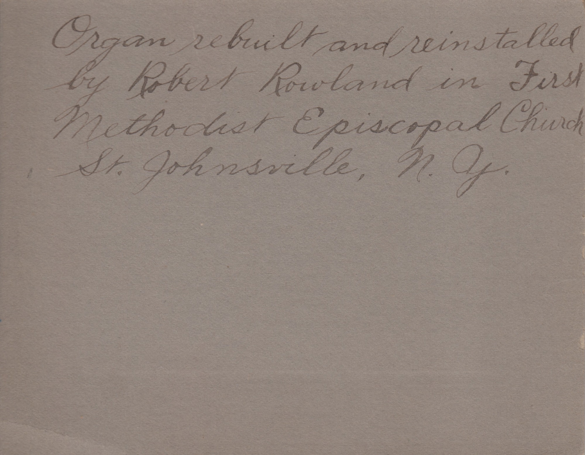 Organ rebuilt and reinstalled by Robert Rowland in First Methodist Episcopal Church, St. Johnsville, New York. The organ was originally built by William Price & Co., New York. It was sold secondhand to the St. Johnsville church in 1898 from the Methodist Church of Hancock, New York and rebuilt by Rowland in 1918-19. Rowland noted the good quality of the Price manual and pedal organ. He was later hired to replace the organ altogether in 1952 with an electric version. The old Price organ was given to Bob Palmatier of Pine Plains, New York. It was then transferred to a Massachusetts museum.