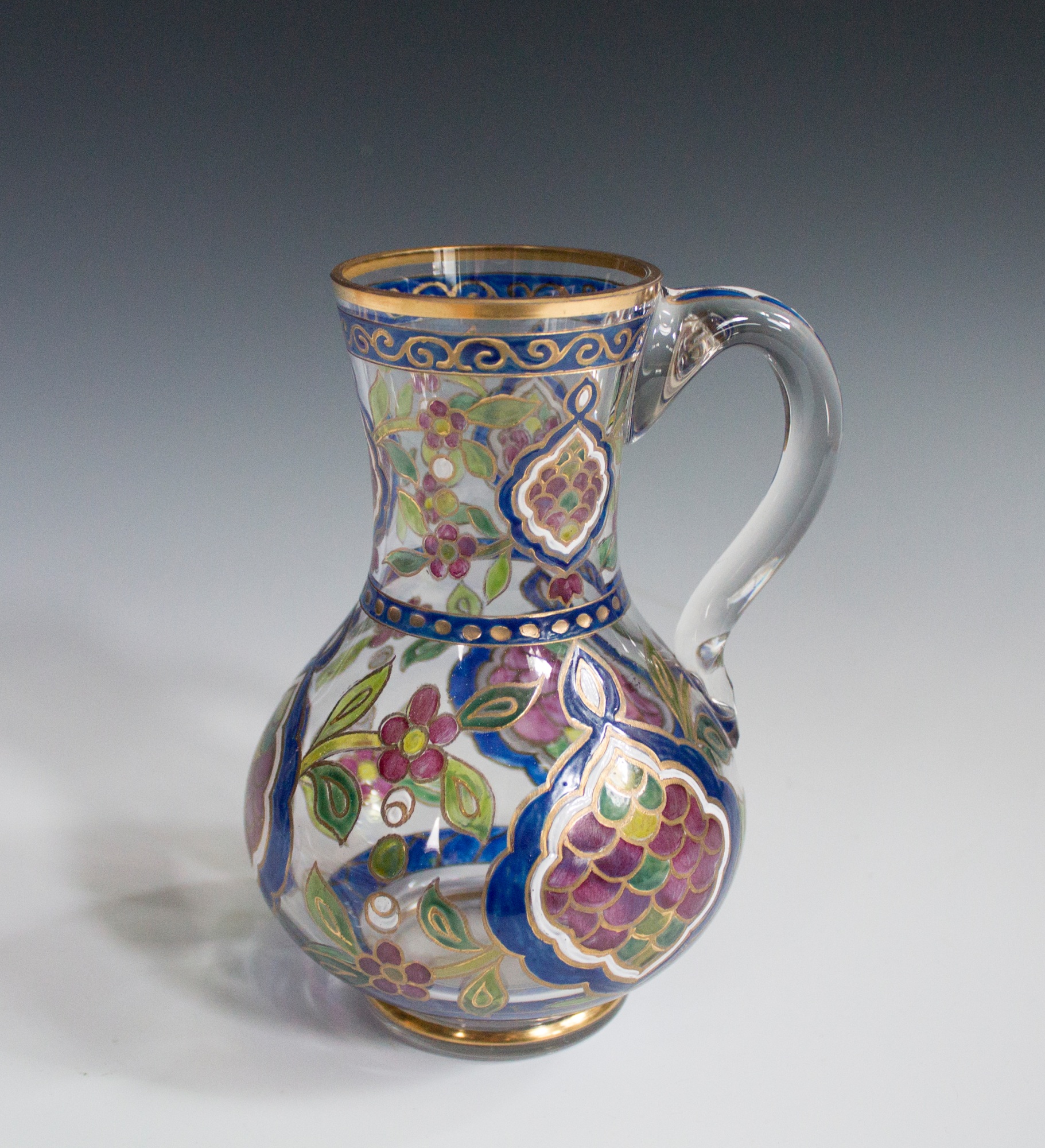Blown and cut glass with applied handle and polychrome decoration, possibly Austrian (similar to Fritz Heckert’s “Jodhpur”). Inspired by 14th-15th century Middle Eastern motifs.