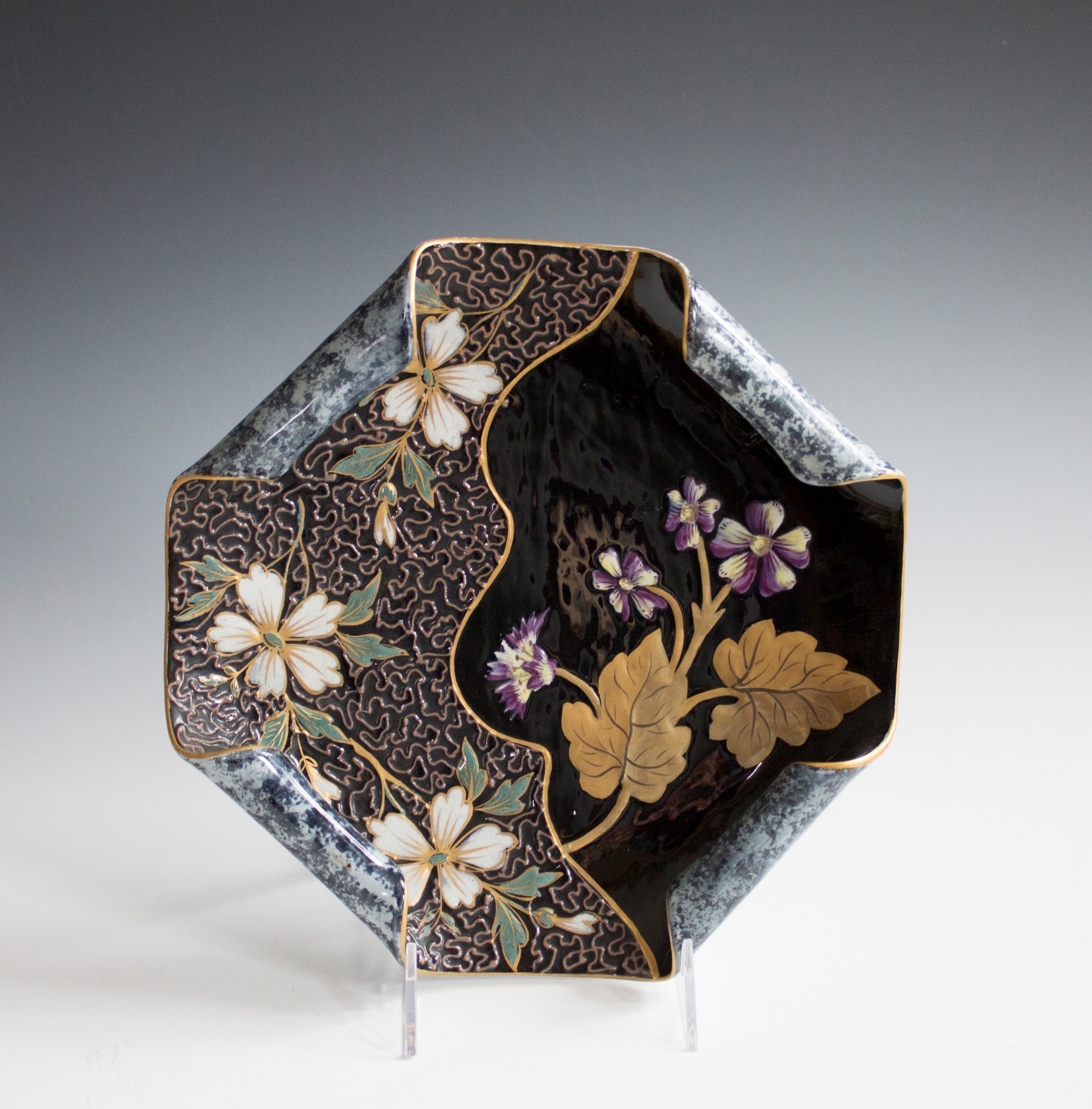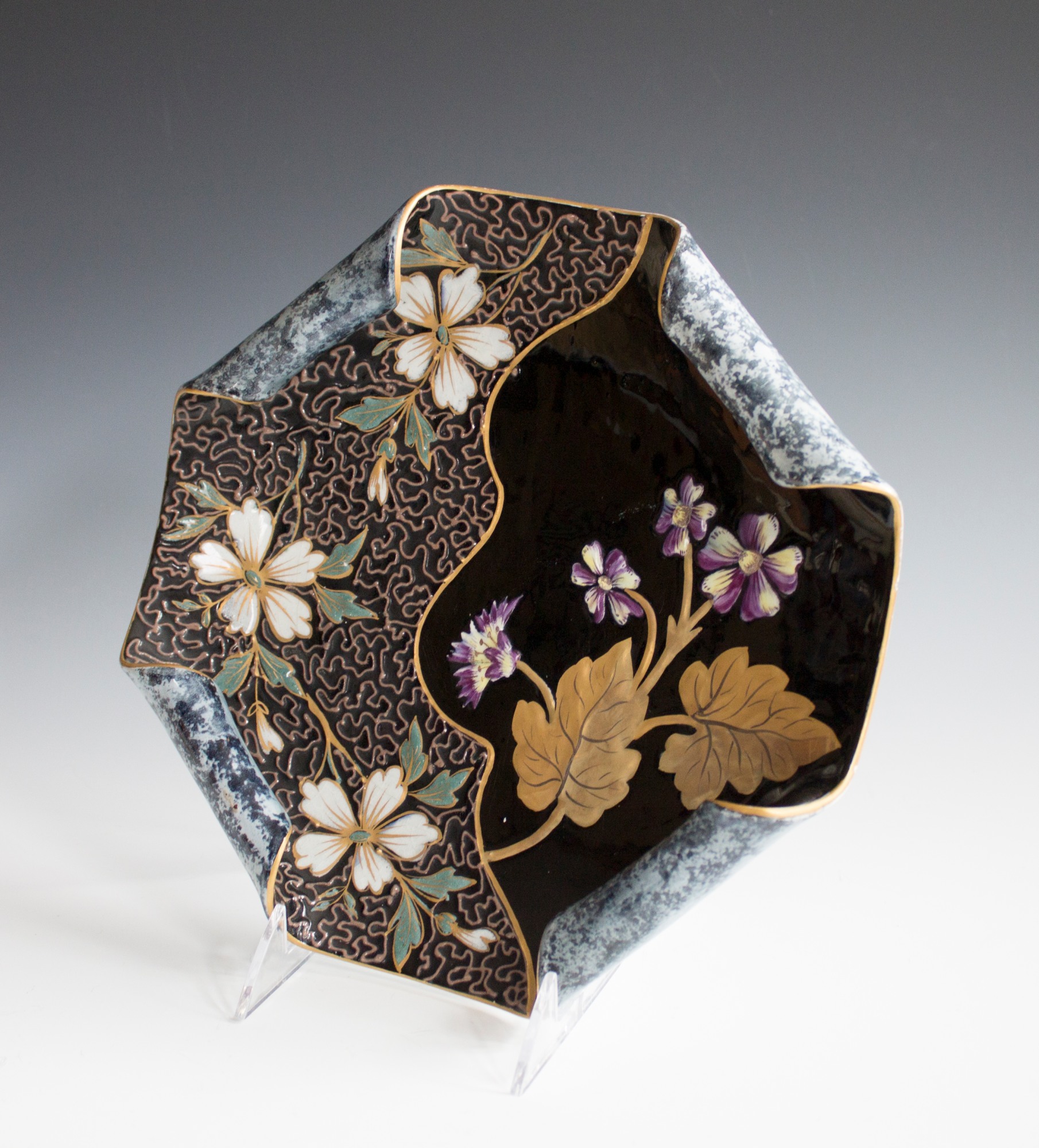 Napkin-fold plate made of hand-modeled faience. Decoration possibly by Keller & Guerin.