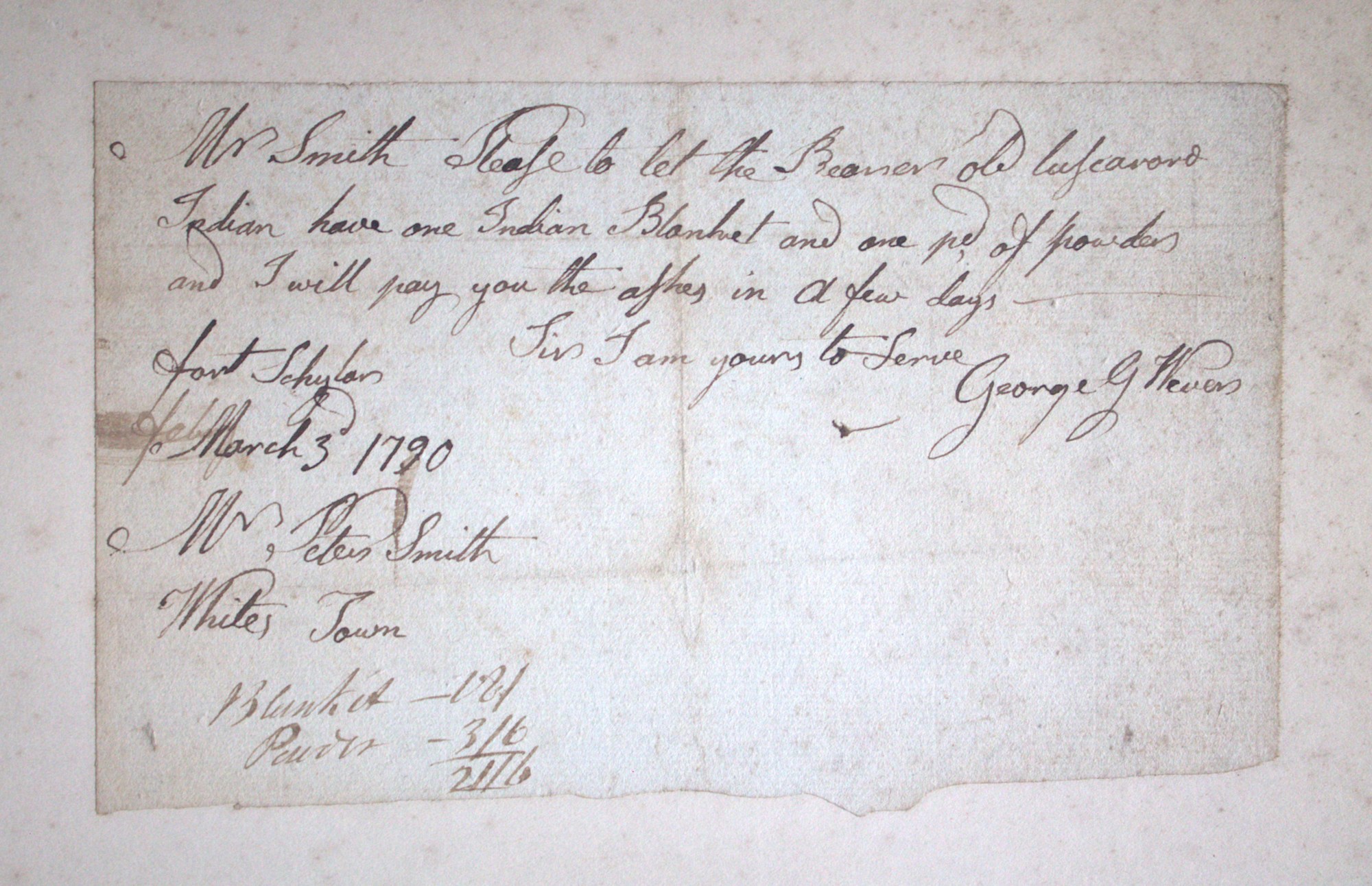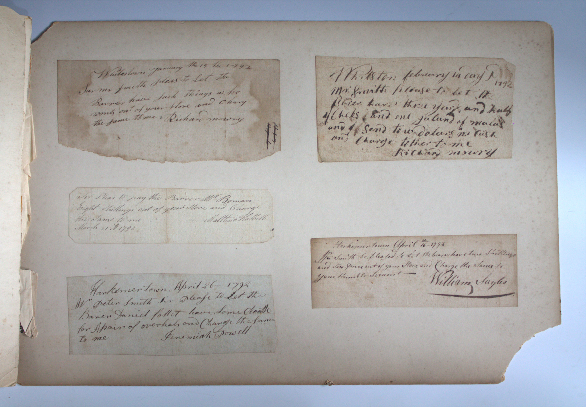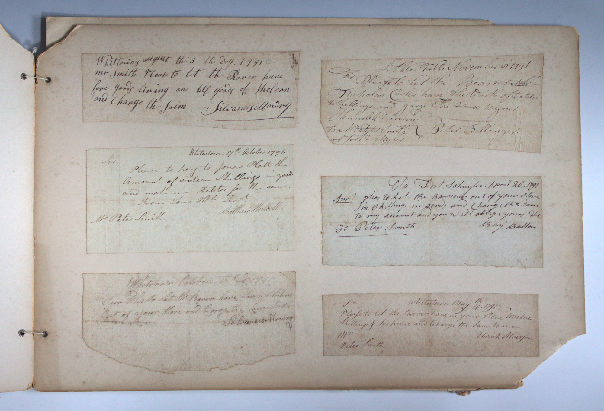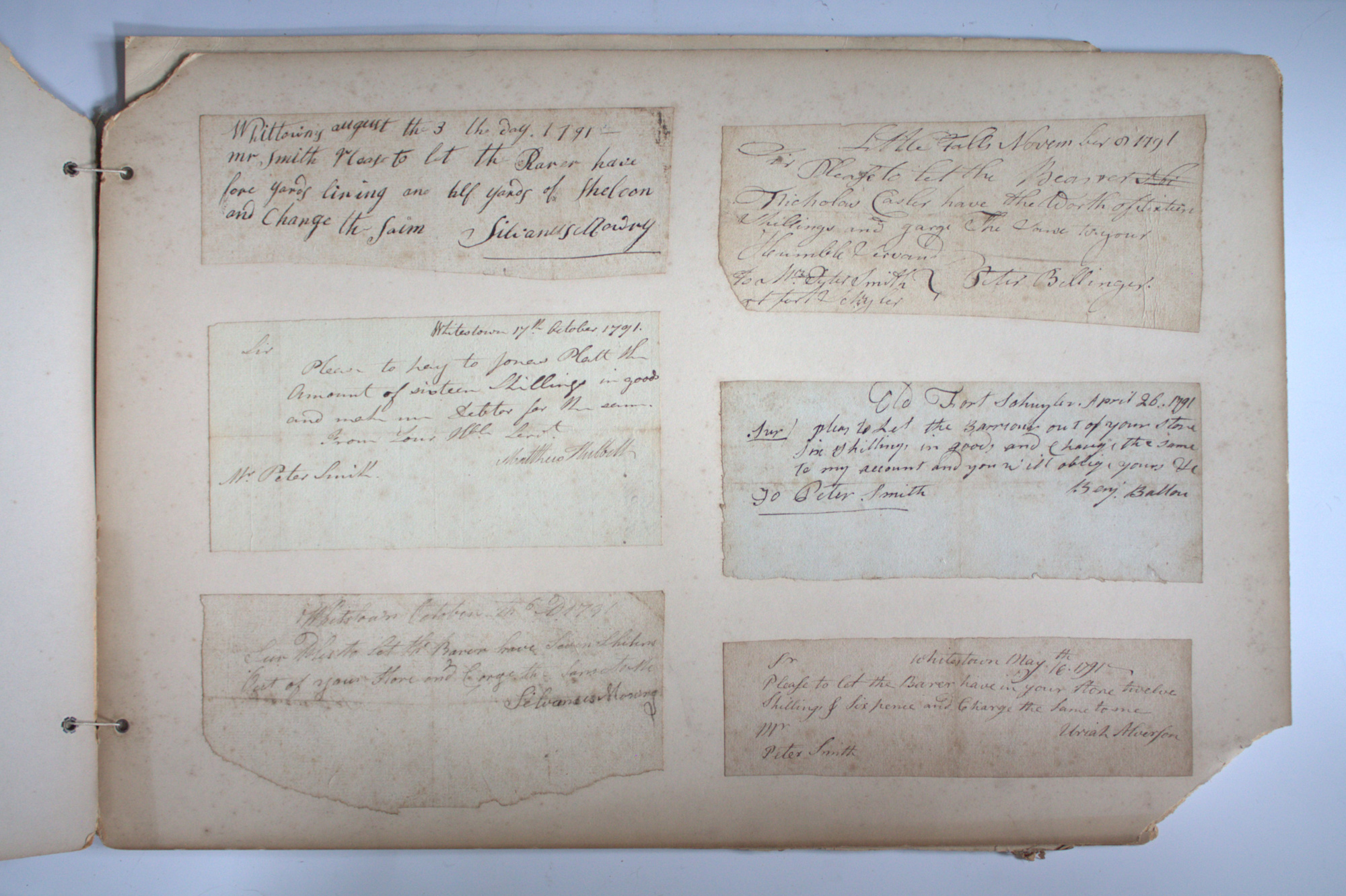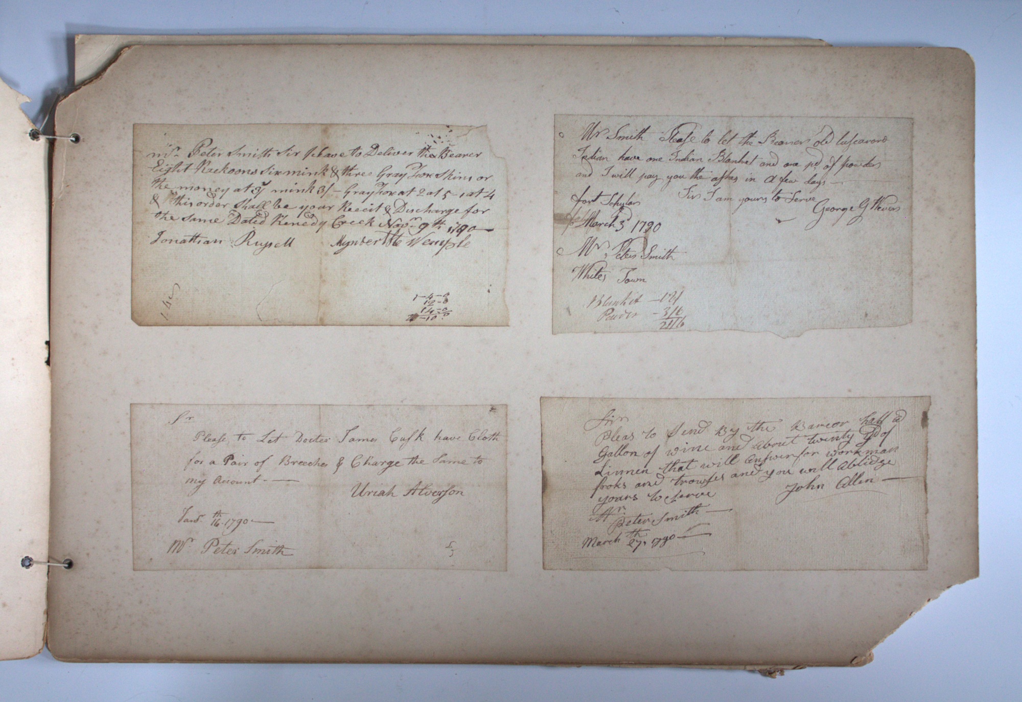 Portfolio containing a collection of 18th century documents, largely receipts and promissory notes written to Peter Smith (1768-1837), general store owner at Fort Schuyler, Utica, New York. Smith was a fur trapper and formed a close relationship with Chief Skenandoa of the Oneida people. Peter Smith's son was the famous abolitionist, Gerrit Smith.