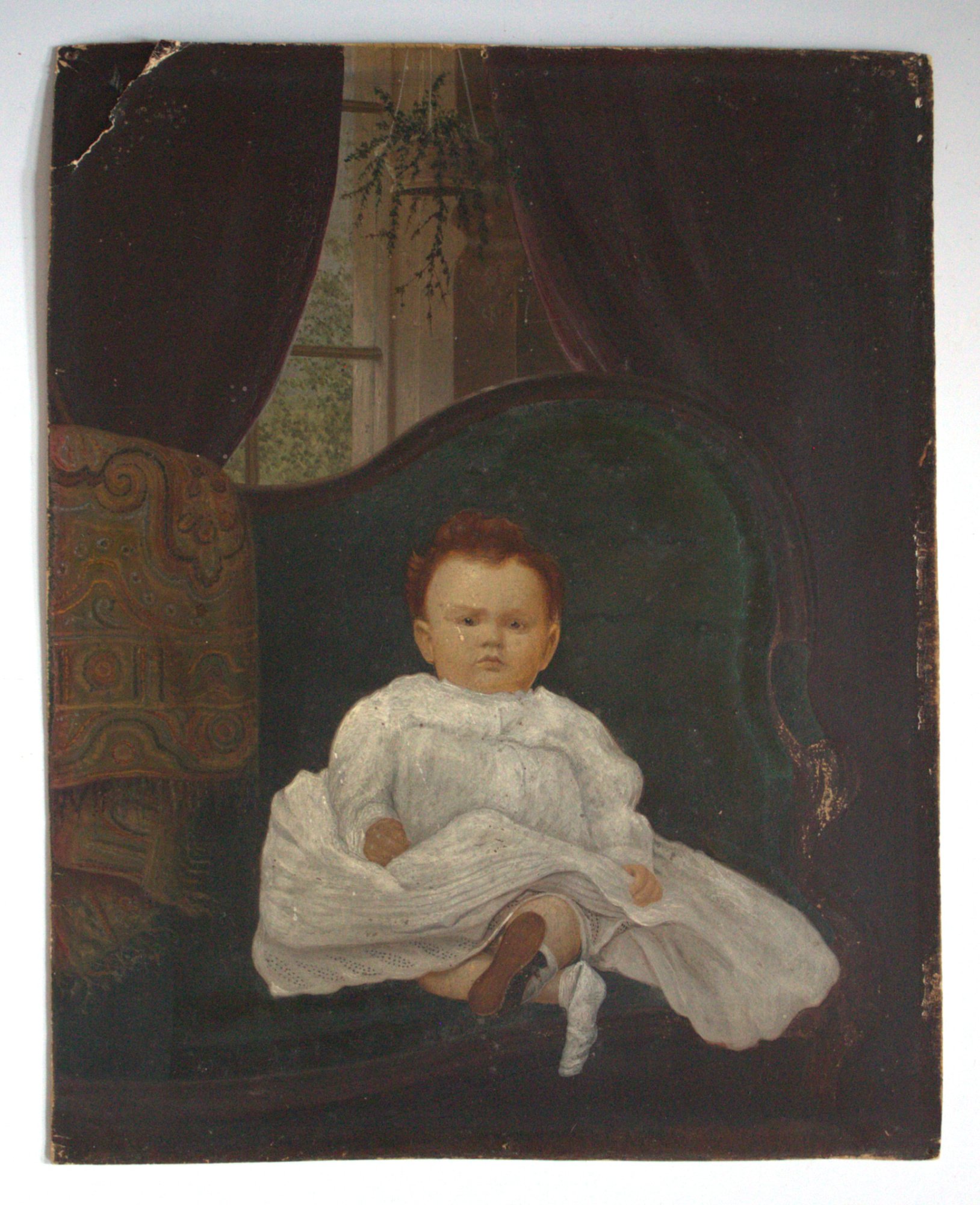 Hand-colored photograph depicting an unidentified baby sitting on a parlor settee with one shoe on and one sock falling off.