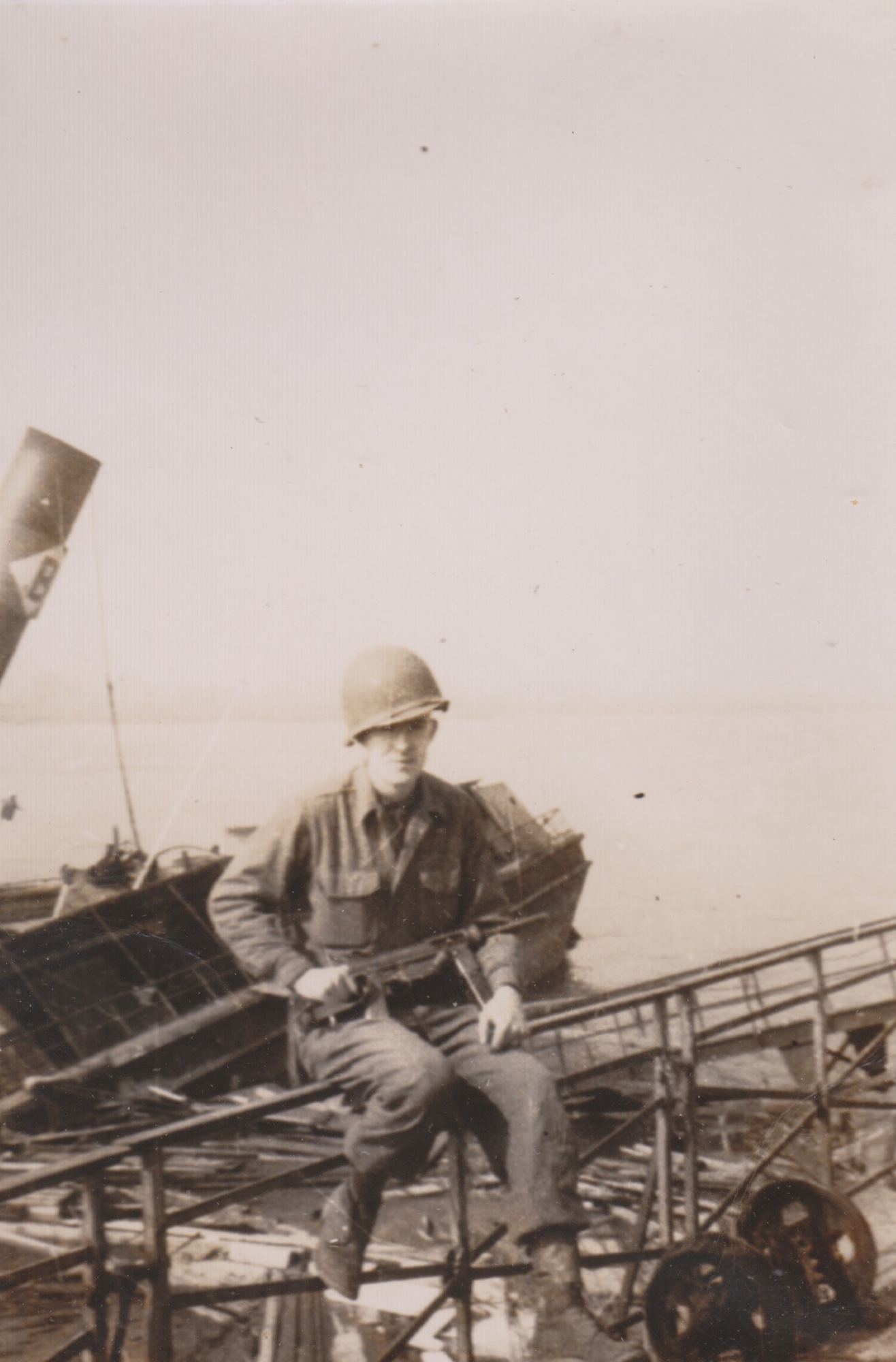 Depicts Myron Bellinger at the Rhine River, Neuwied, Germany.