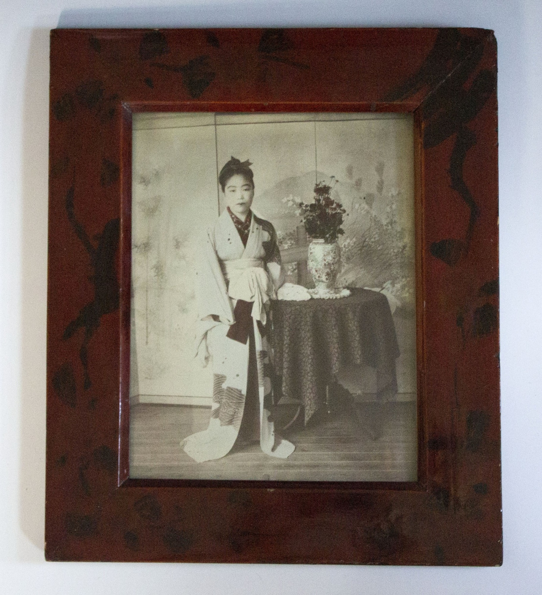 Portrait of a Japanese woman standing beside a table with vase of flowers. Displayed in its original lacquer frame from Bernstein’s Art Store, 307 Washington St., Portland, Oregon.