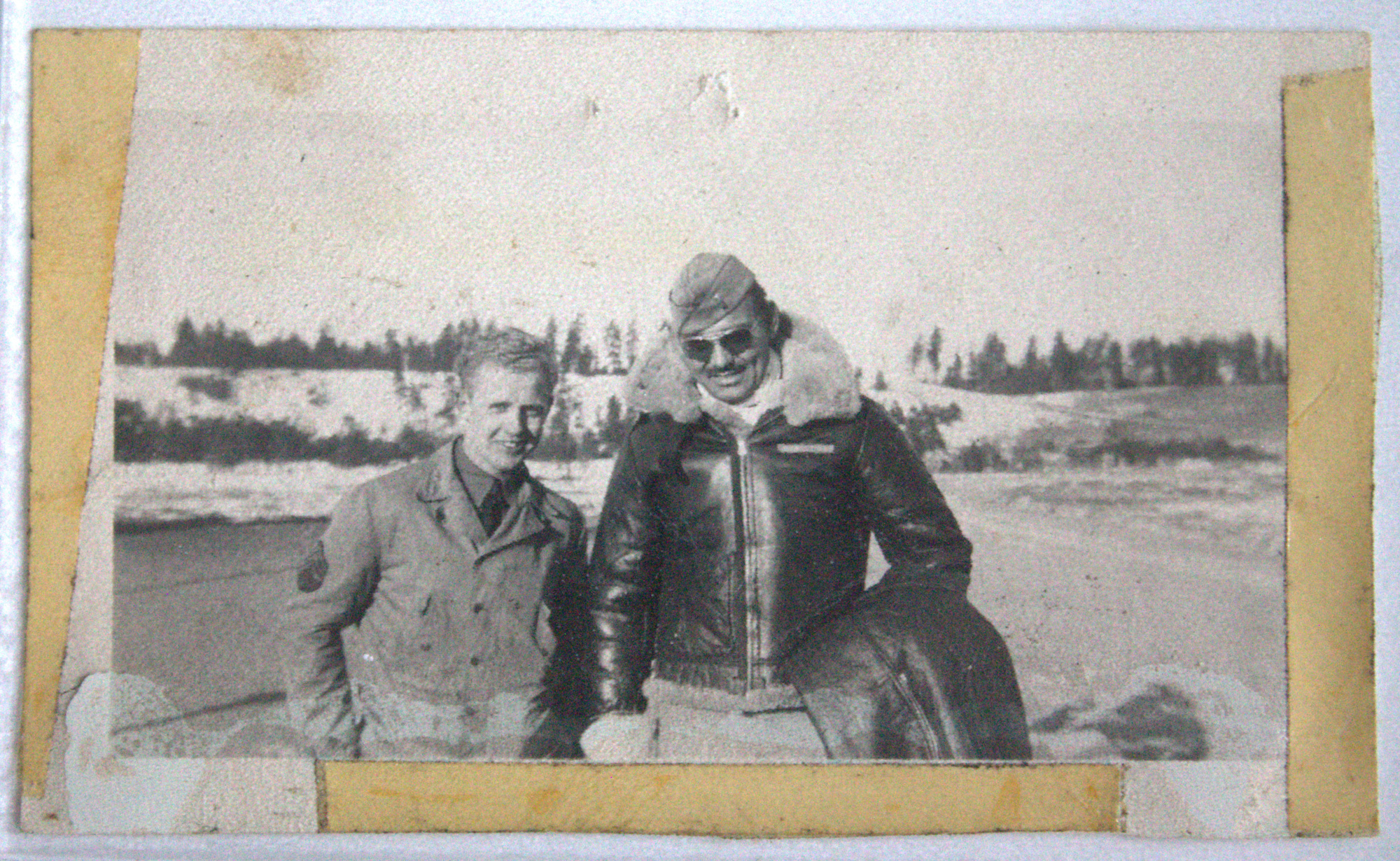 Depicts actor Clark Gable and an unidentified man at Camp Seven Mile, near Spokane, Washington.