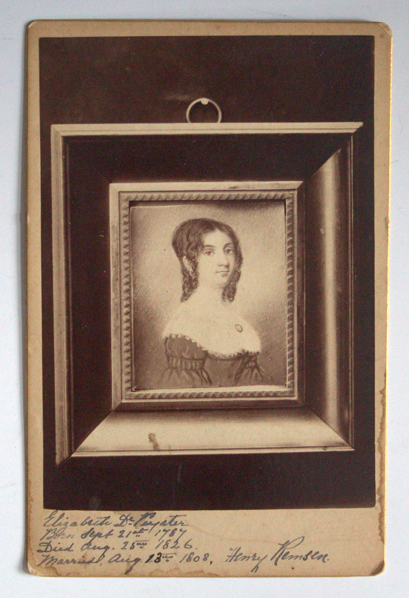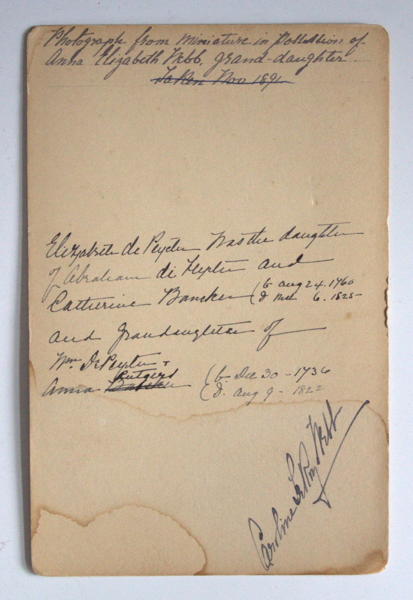 Cabinet card depicting a portrait miniature of Elizabeth DePeyster Remsen (1787-1826) of New York, New York. Inscribed by Elizabeth's granddaughter and great-granddaughter.