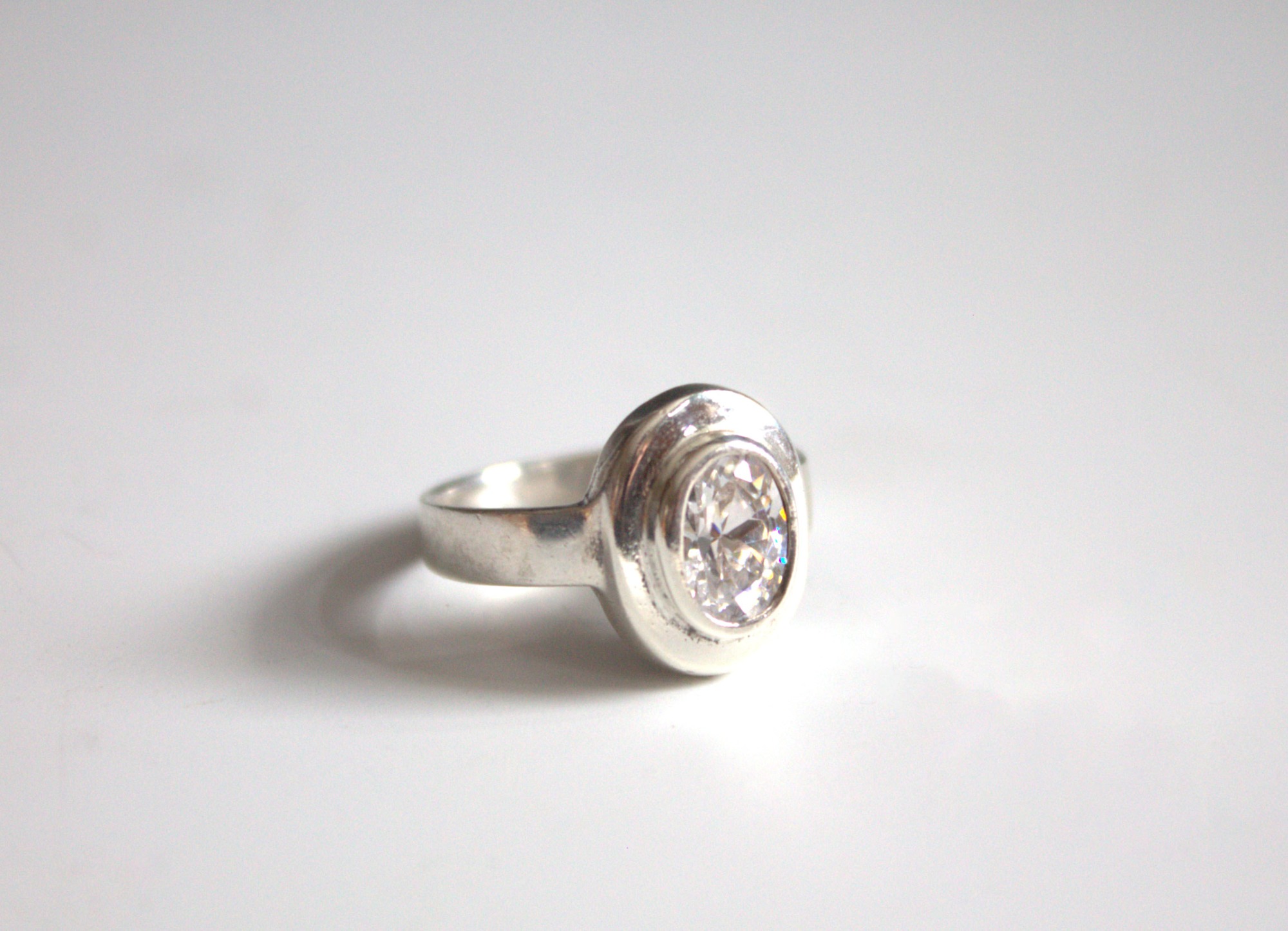 Brilliant cut oval cubic zirconia set in sterling silver.