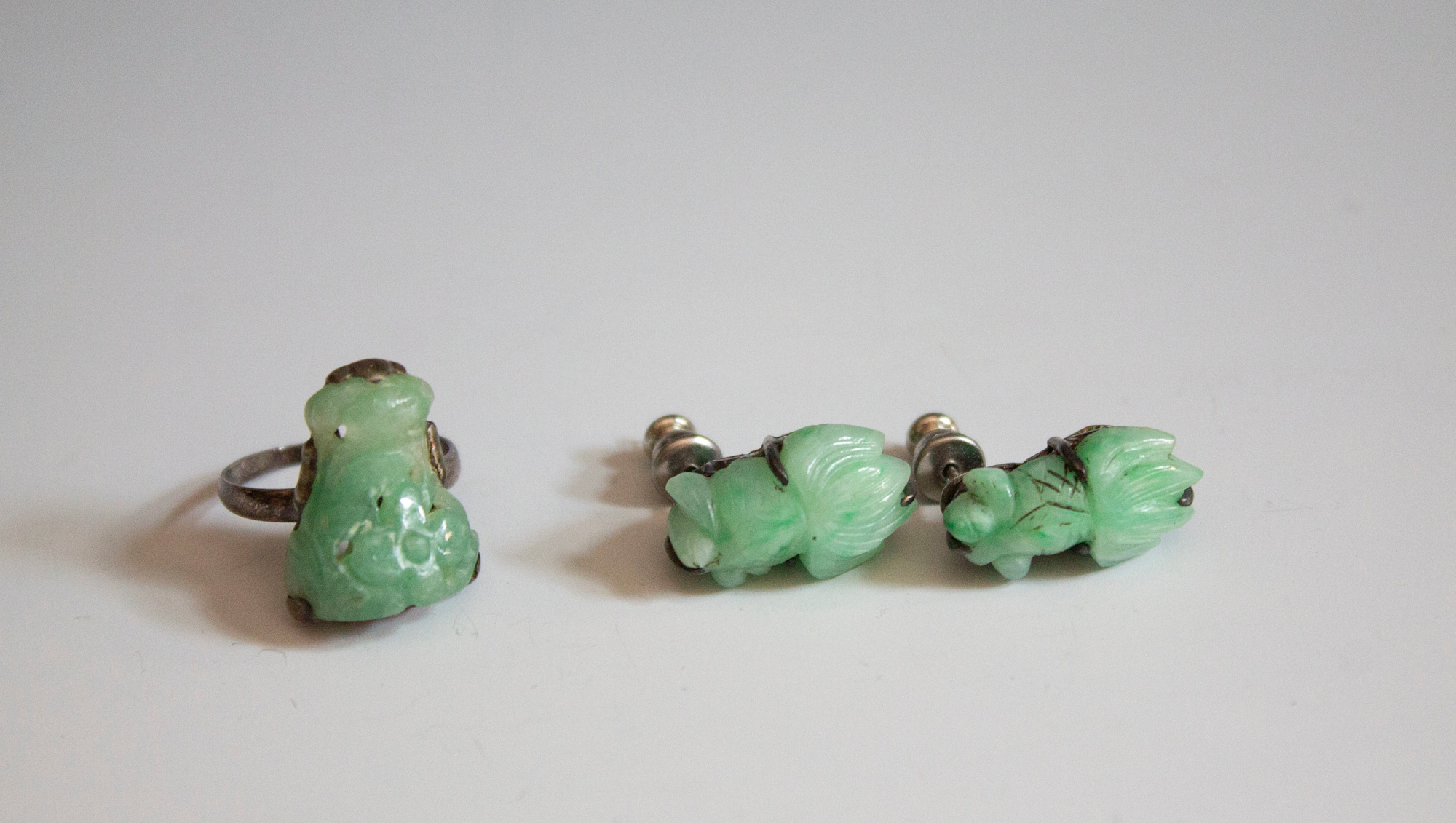 Jadeite and sterling ring and screw-back earrings with floral and koi fish motifs.