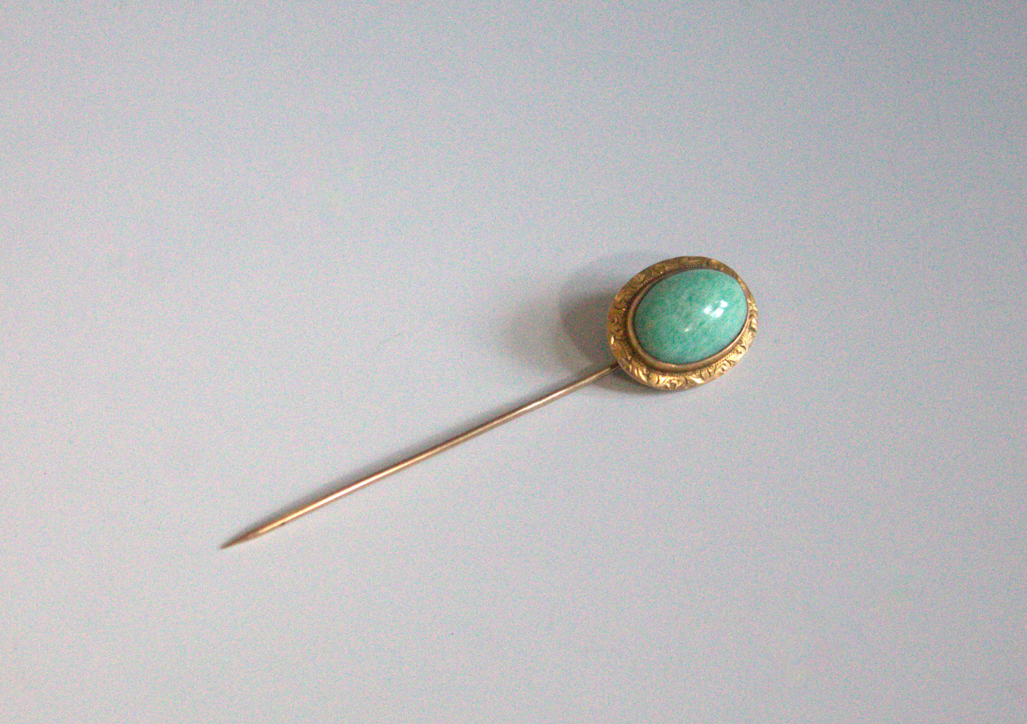 Stick pin with green mottled stone and 10k gold setting.