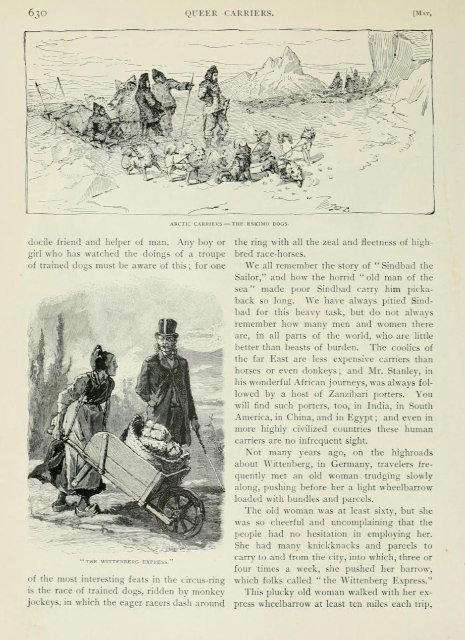 Scene depicting a woman with wooden clogs pushing a wheelbarrow full of parcels. A gentleman wearing a top hat accompanies her. Image appeared in the May 1905, volume 32 issue of St. Nicholas Magazine.
