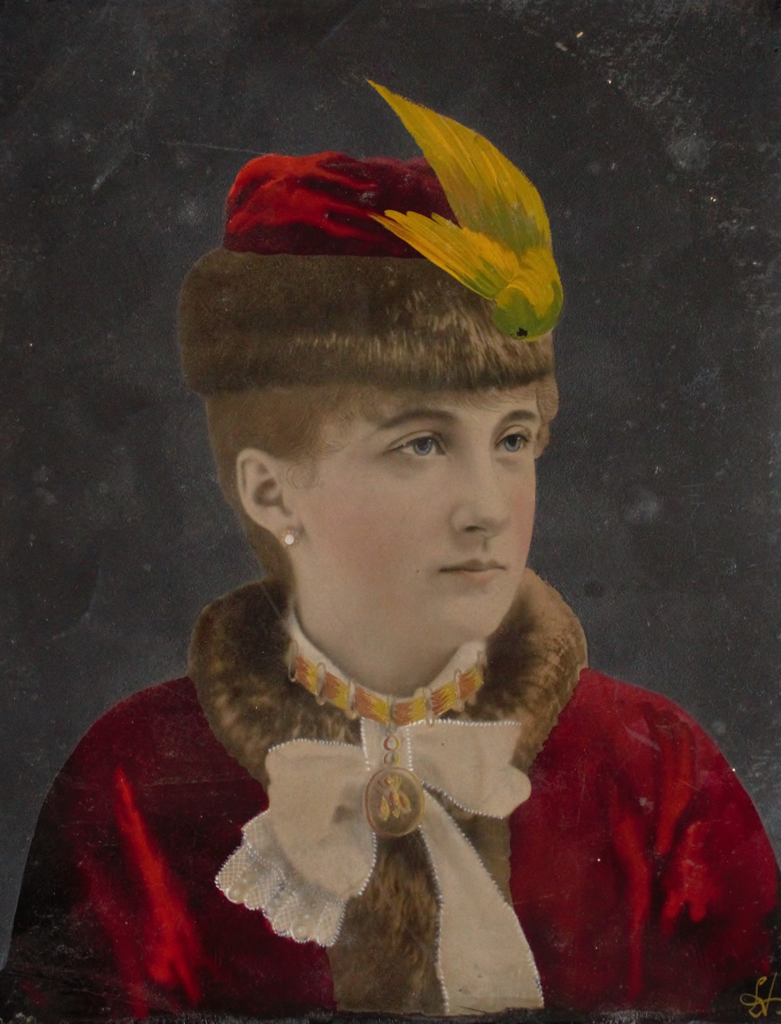 Full plate tintype of a woman with hand-colored details.