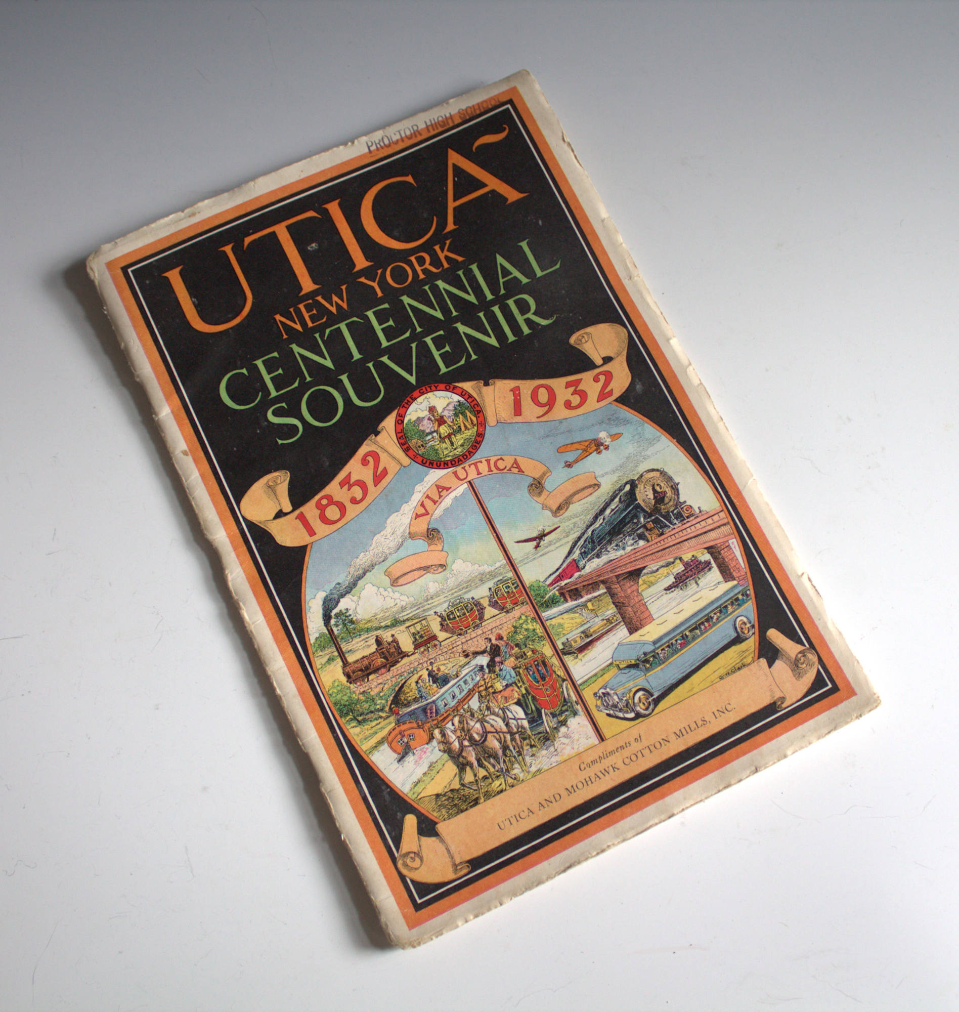 Souvenir booklet commemorating the city incorporation of Utica, New York. Many local businesses partnered to make the publication possible. This particular booklet was distributed by the Utica and Mohawk Cotton Mills, Inc.
