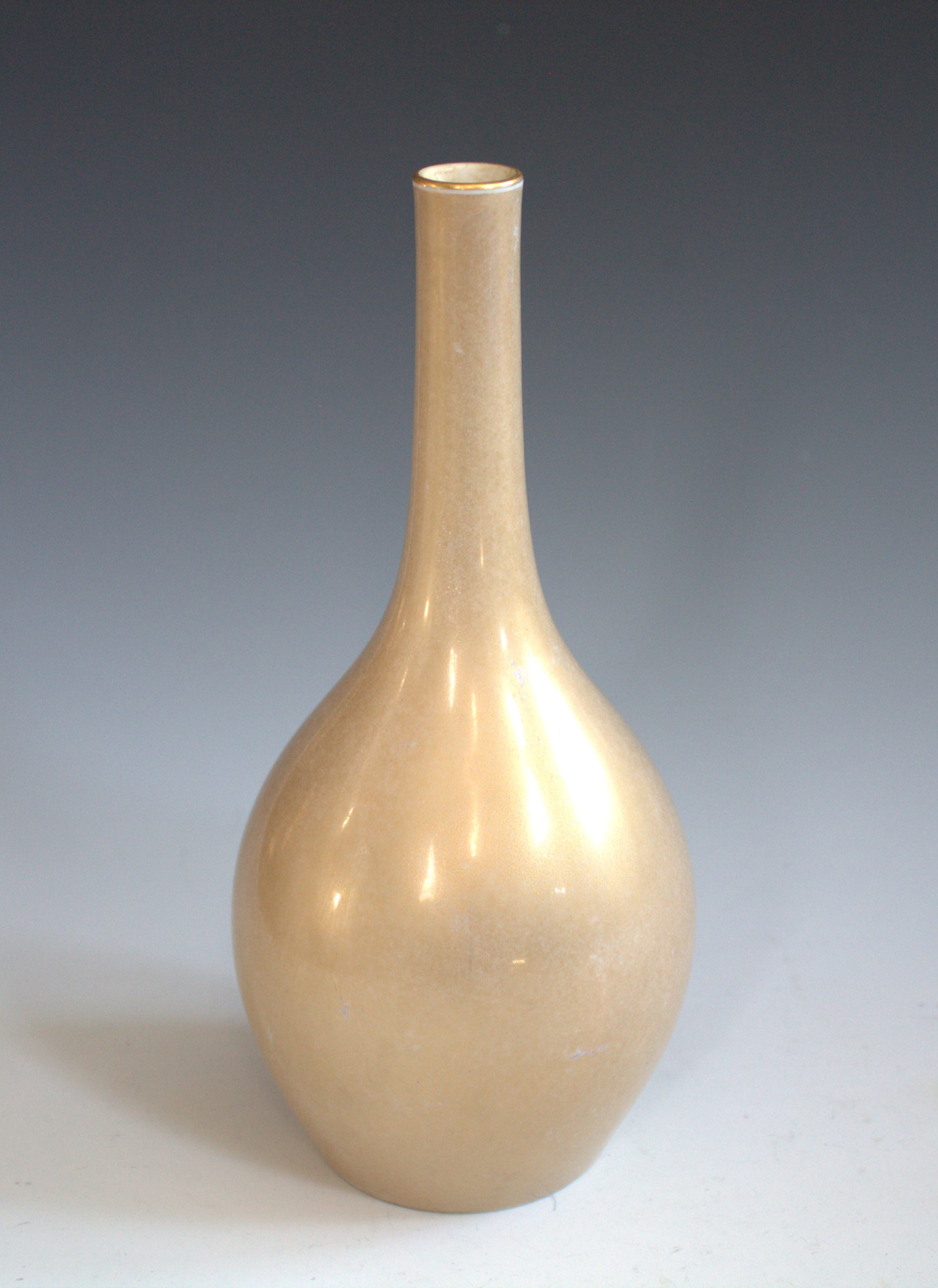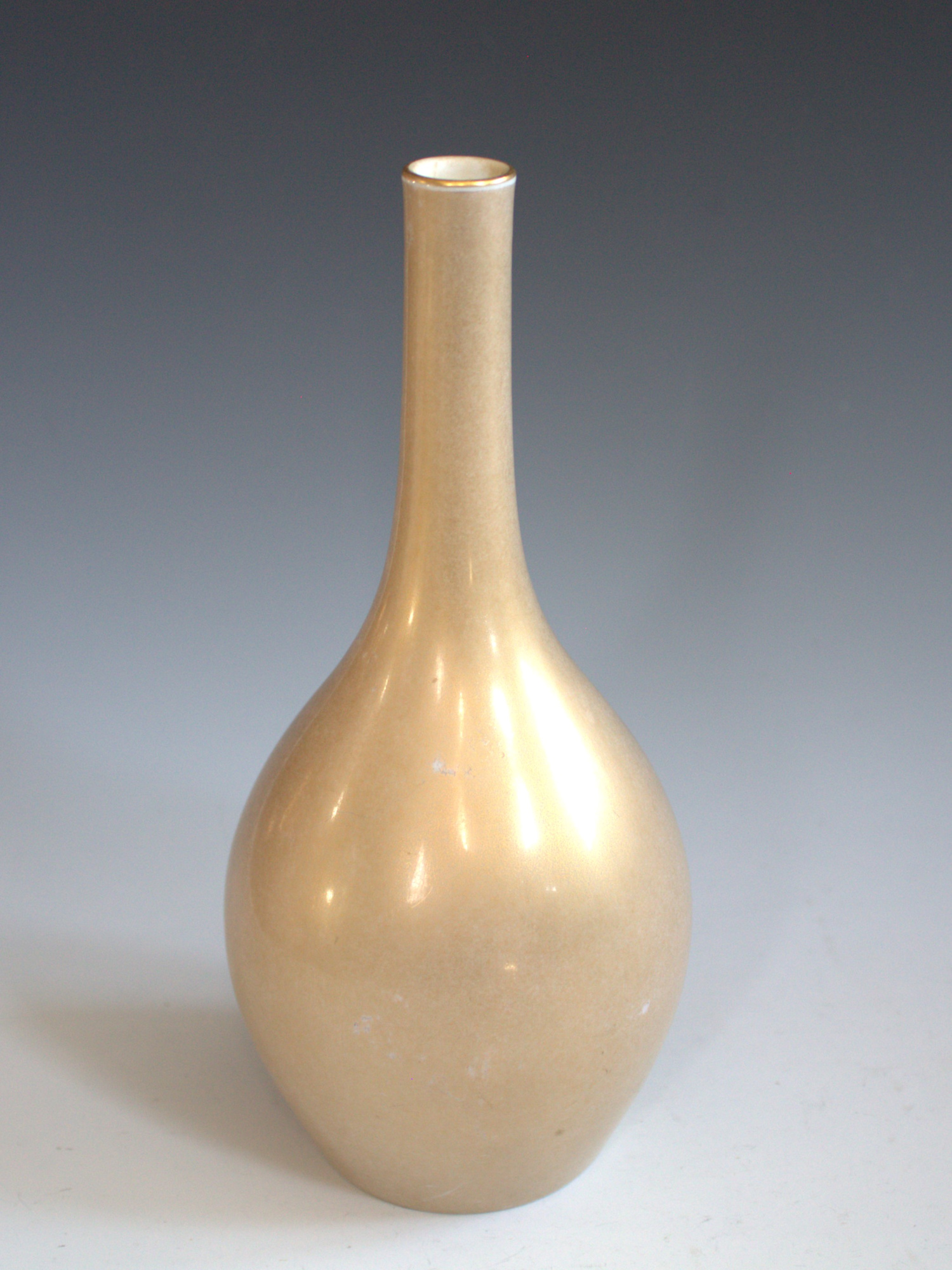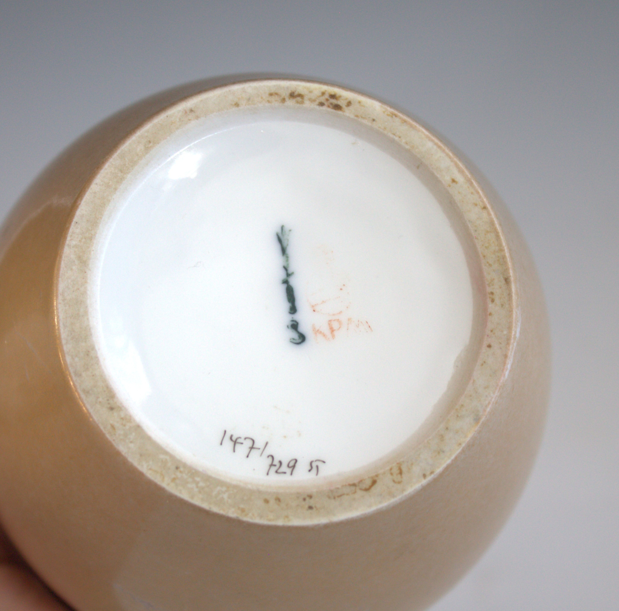 Mid-century modern vase with applied gilt decoration. This vase, in particular, is special as it appears to have been studio decorated with a gold airbrush technique. The underside of the vase is marked with the blue arrow with S beneath it, meaning it was made in-house prior to 1957, then outsourced. It also features a red KPM globe mark and black inscribed decorator's marks.
