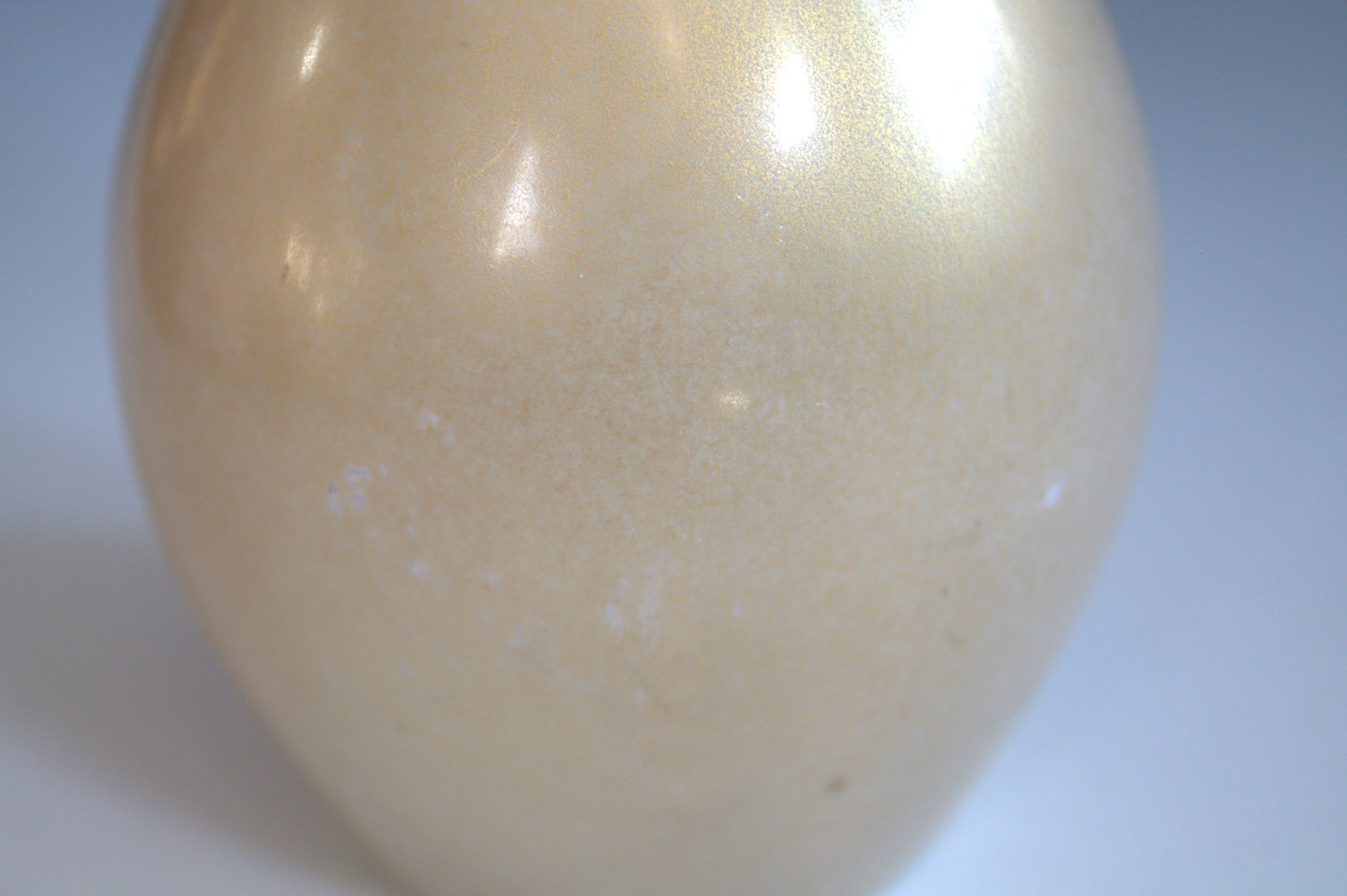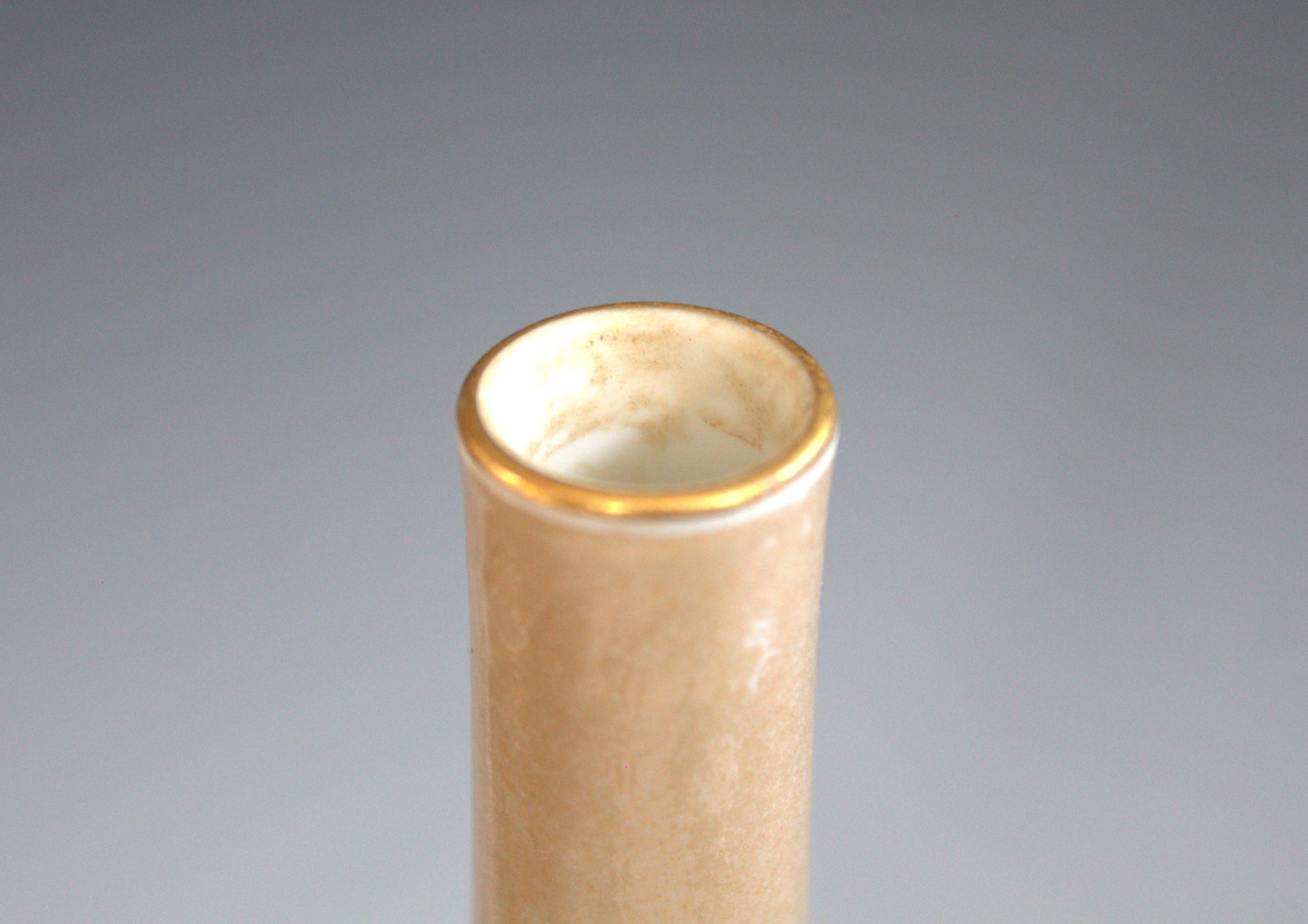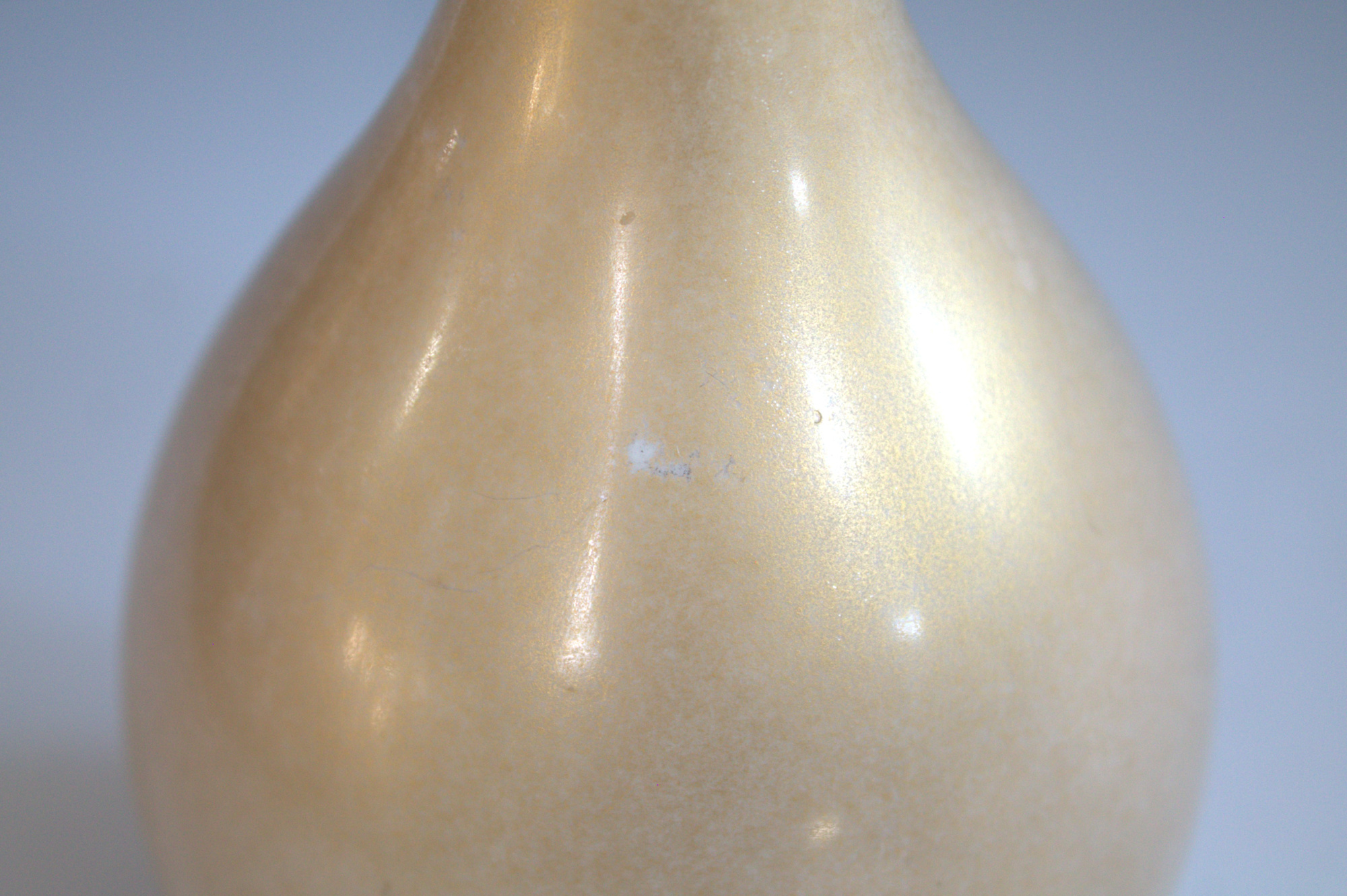 Mid-century modern vase with applied gilt decoration. This vase, in particular, is special as it appears to have been studio decorated with a gold airbrush technique. The underside of the vase is marked with the blue arrow with S beneath it, meaning it was made in-house prior to 1957, then outsourced. It also features a red KPM globe mark and black inscribed decorator's marks.