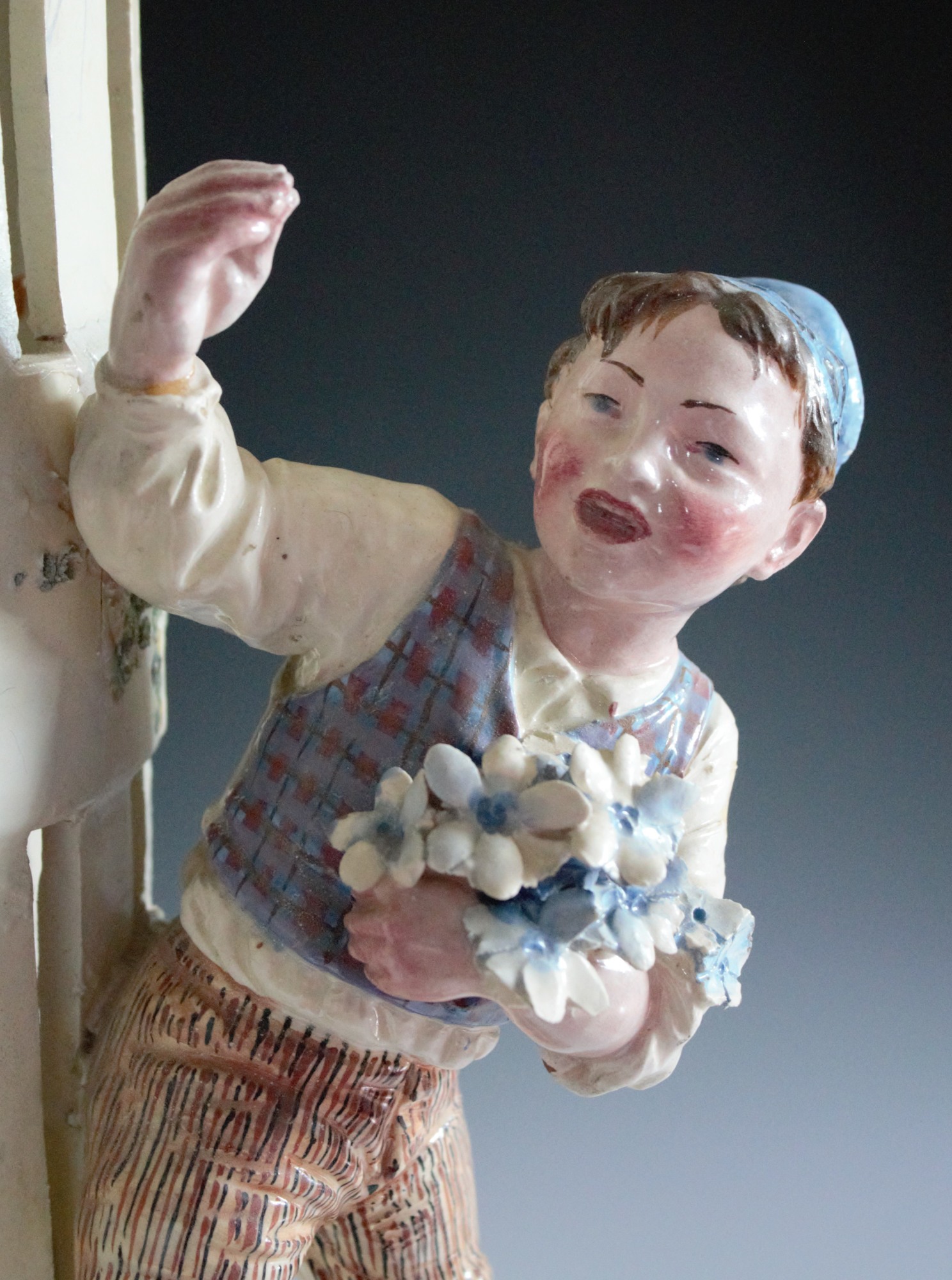 Oversized vase featuring three boys playing among forget-me-nots. The North Wind dots panels around the top border.
