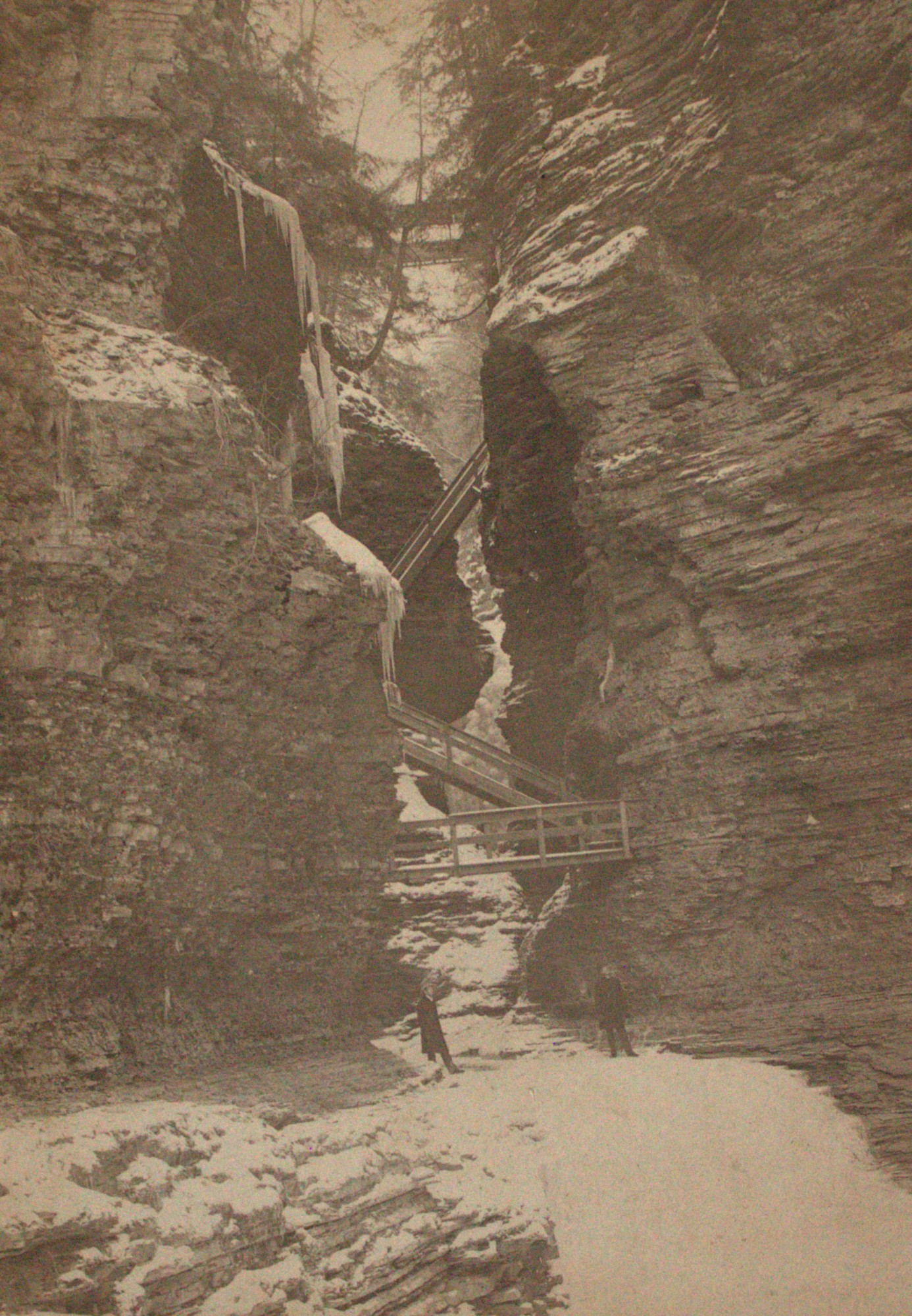Depicts men standing in front of a waterfall at Watkins Glen in winter.