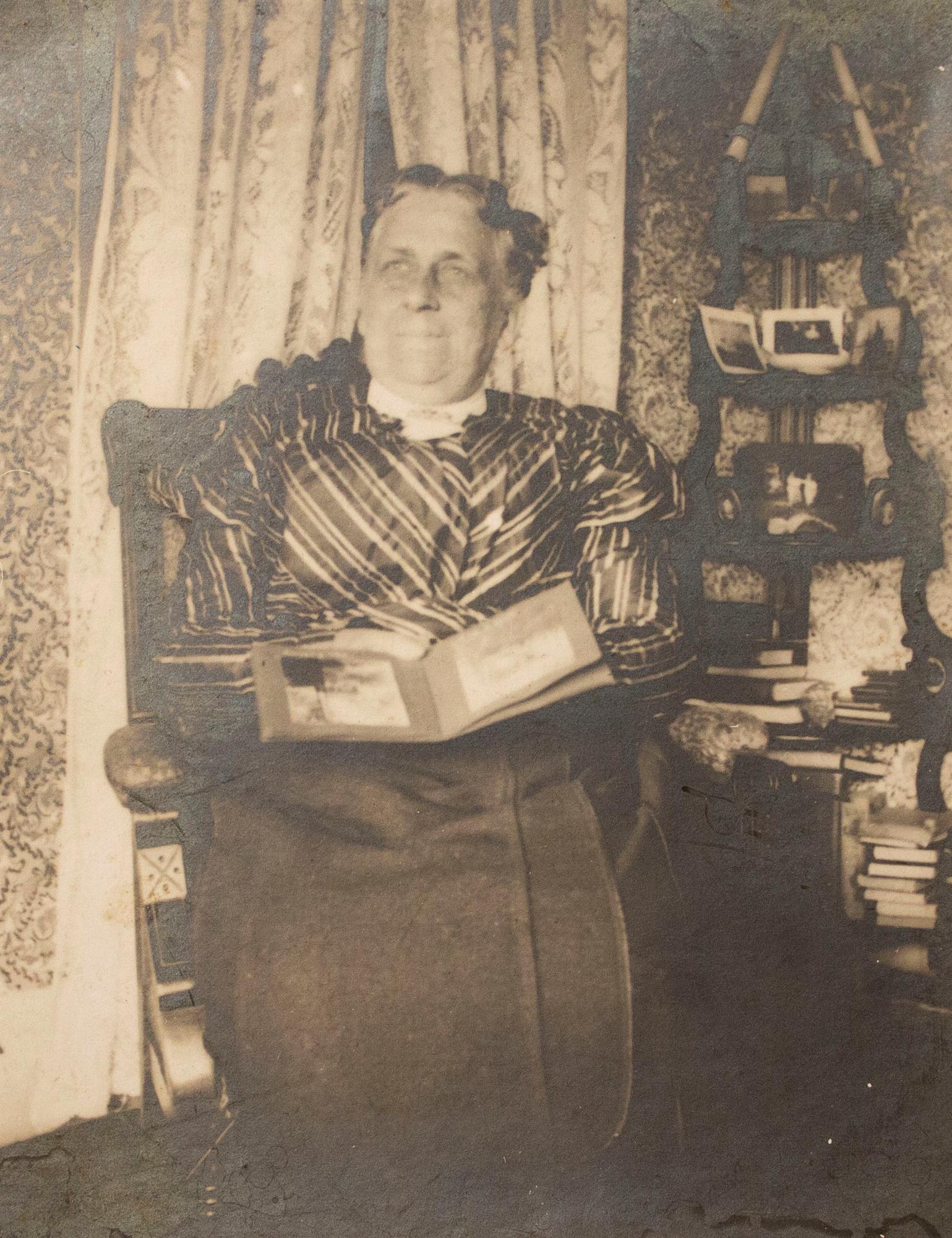 Portrait of a woman sitting in a parlor and holding a photo album.