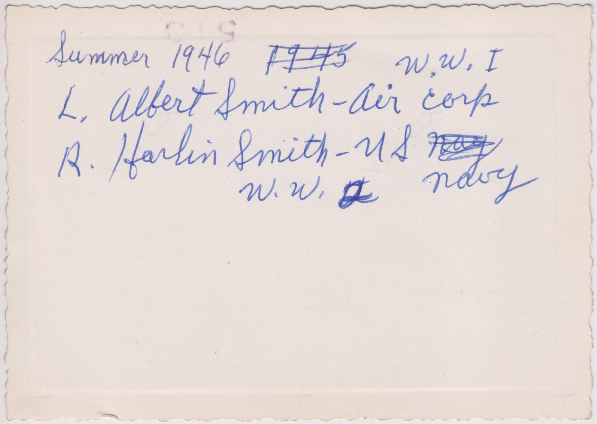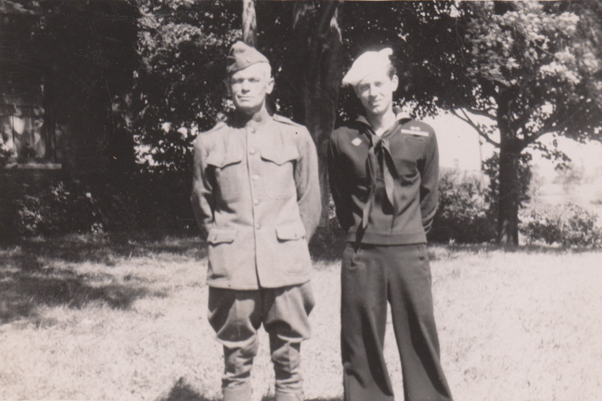 Depicts Albert Smith, a World War I veteran, standing next to World War II sailor Harlan Smith.