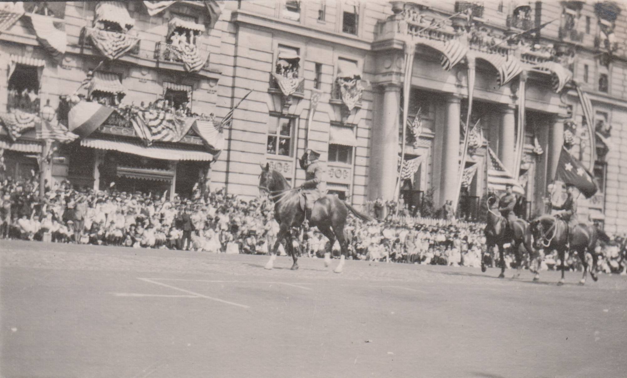 Photographs taken at the World War I victory parade in Washington, DC. One photograph depicts General Pershing riding a horse that was given to him as a gift shortly before the parade.