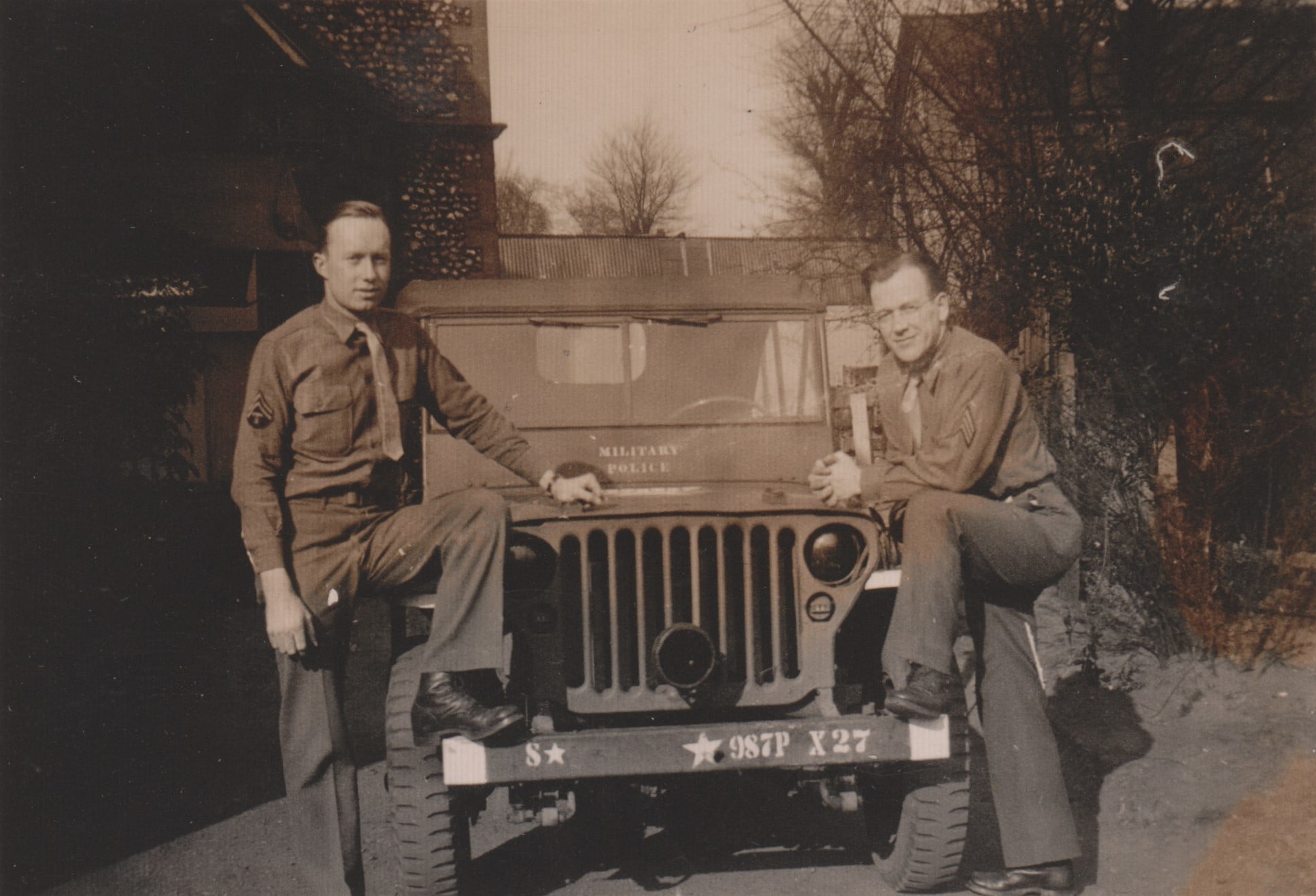 Depicts Army Air Force soldiers in England. The men are identified as Sergeant Jimmie Laing, Corporal Bob Theisen, Frank North, Sergeant Fayron Moore, and First Sergeant Joseph Fisher.