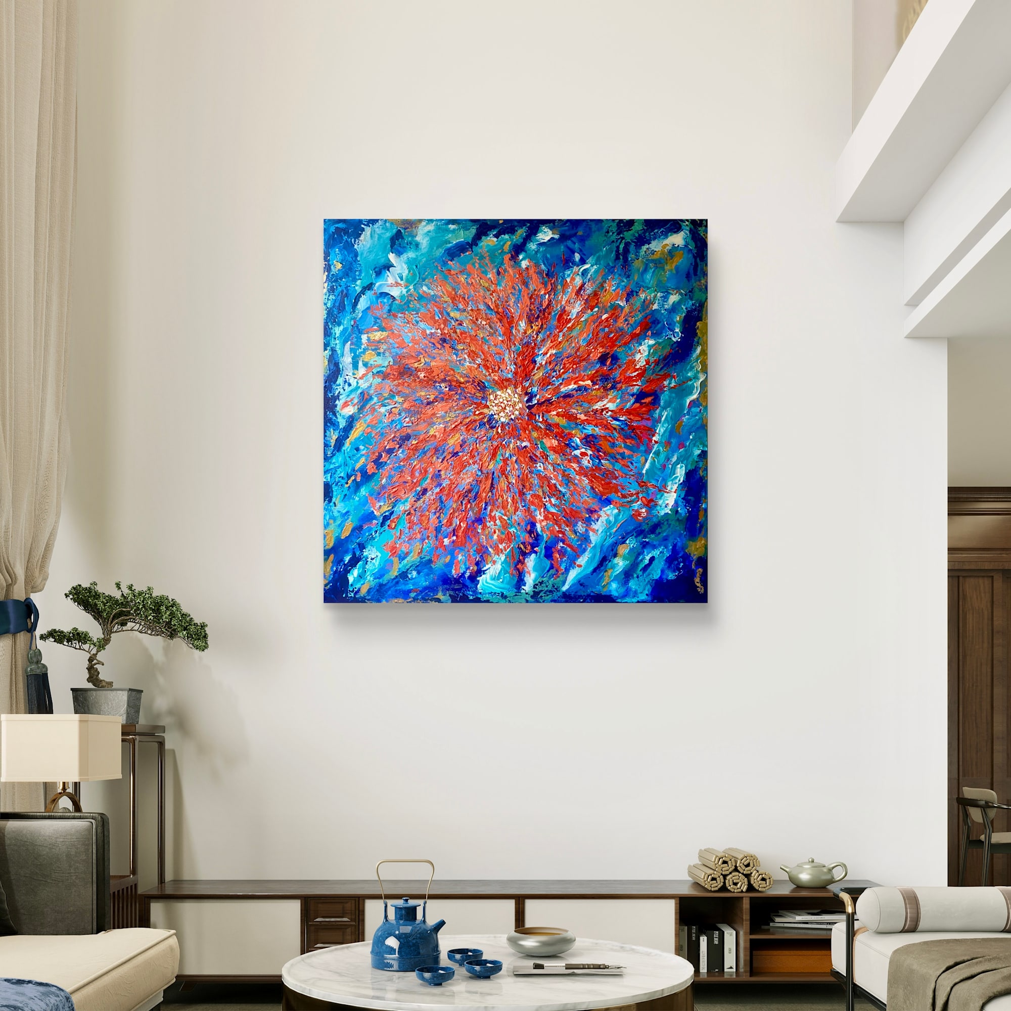Coral Bloom dances between deep blues and fiery corals, capturing that magical moment when your soul awakens.