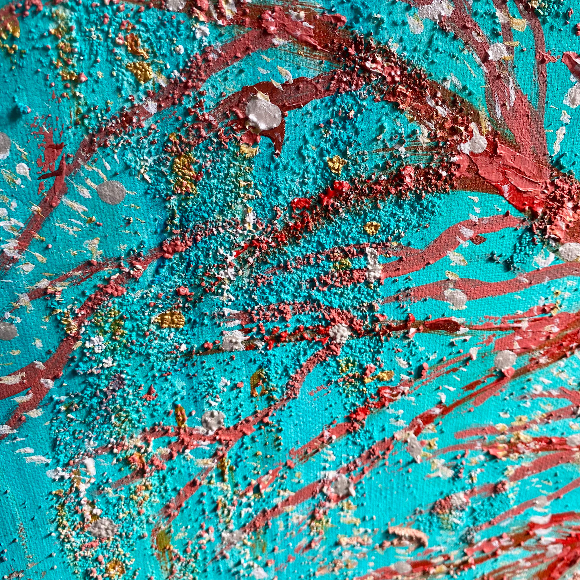 In this vibrant artwork, I intend to transport viewers into an evocative underwater realm, characterised by the striking contrast of deep green turquoise and radiant coral-red hues. The piece captures the essence of marine life, specifically the intricate beauty of coral formations that are often referred to as the "rainforests of the sea."