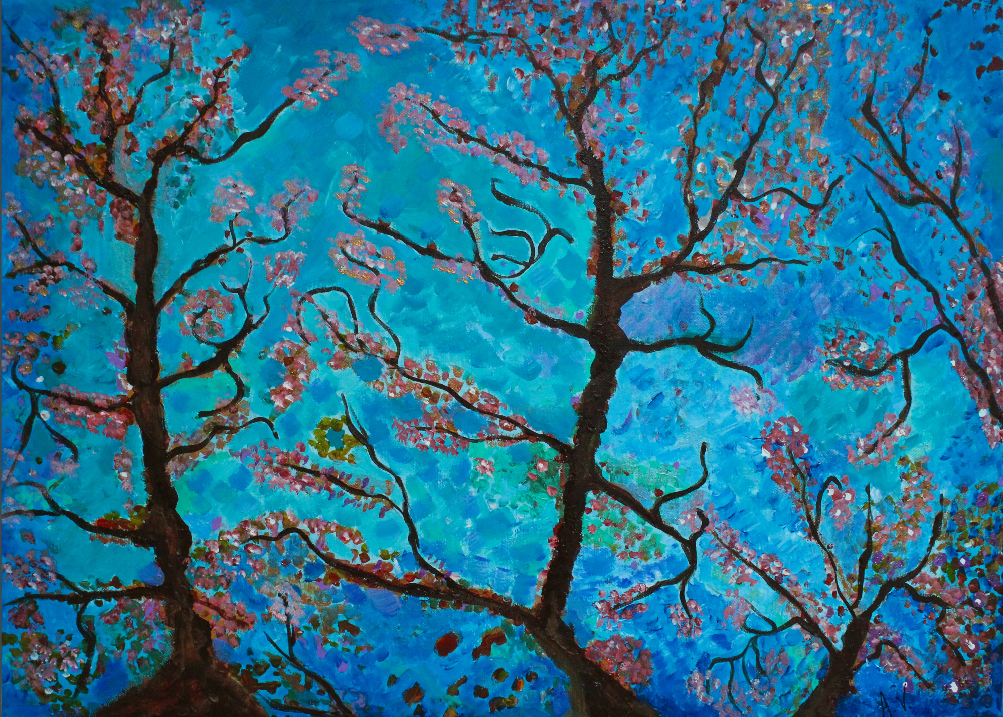 In this imaginative artwork, I feel as though I am diving into ocean waters where beautiful trees are blossoming underwater. The serene blend of blue and green colors in the painting fills me with a deep sense of calmness and peace. The trees, with their inner strength and ancient wisdom, speak to me in a silent language of nature's enduring beauty.