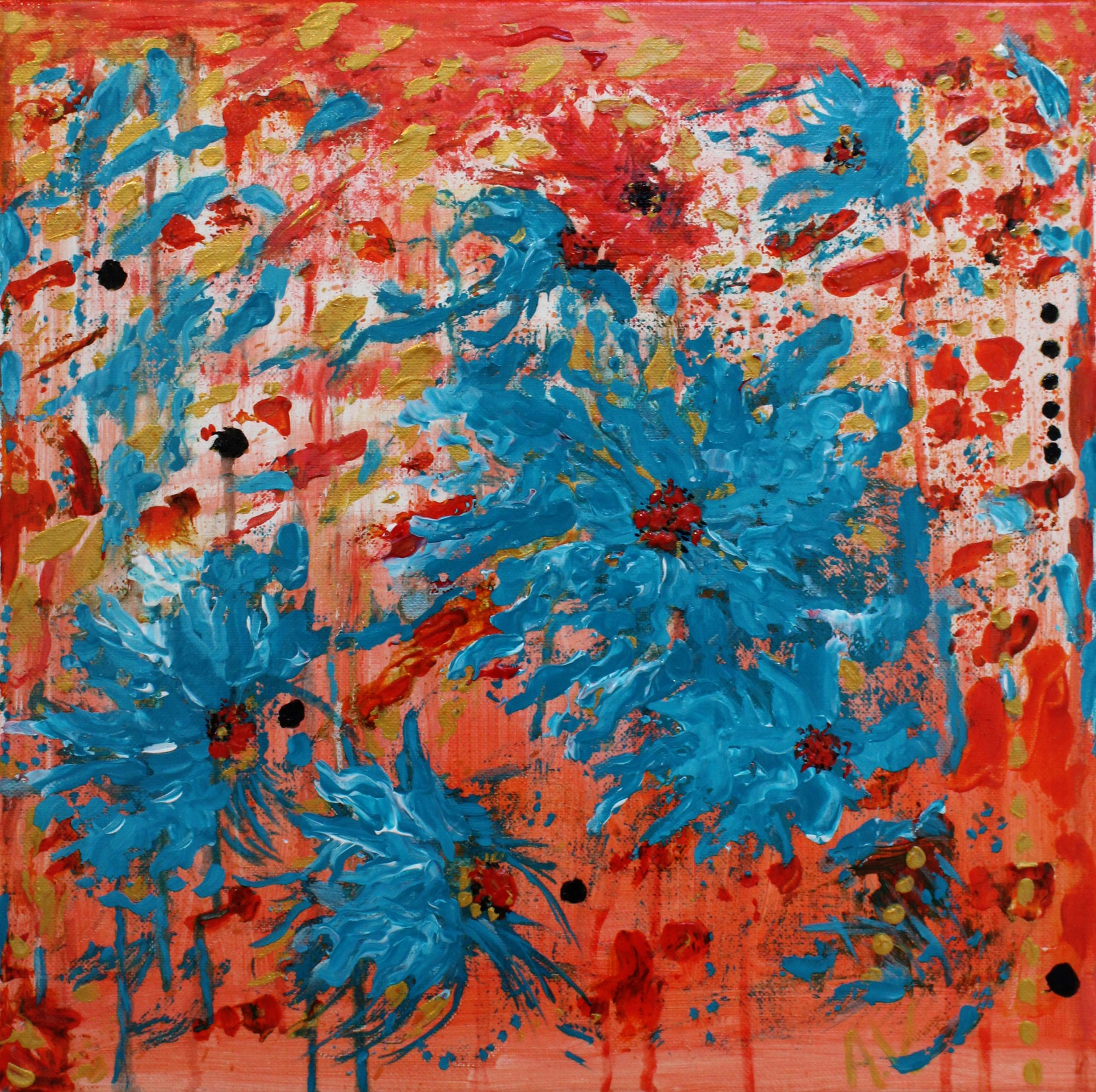 This vibrant abstract piece "Take Me With You" captures the passionate dance between longing and liberty. Bold turquoise blooms burst forth against a fiery coral backdrop. The azure petals seem to reach outward, their fluid movements suggesting both an invitation and a plea.