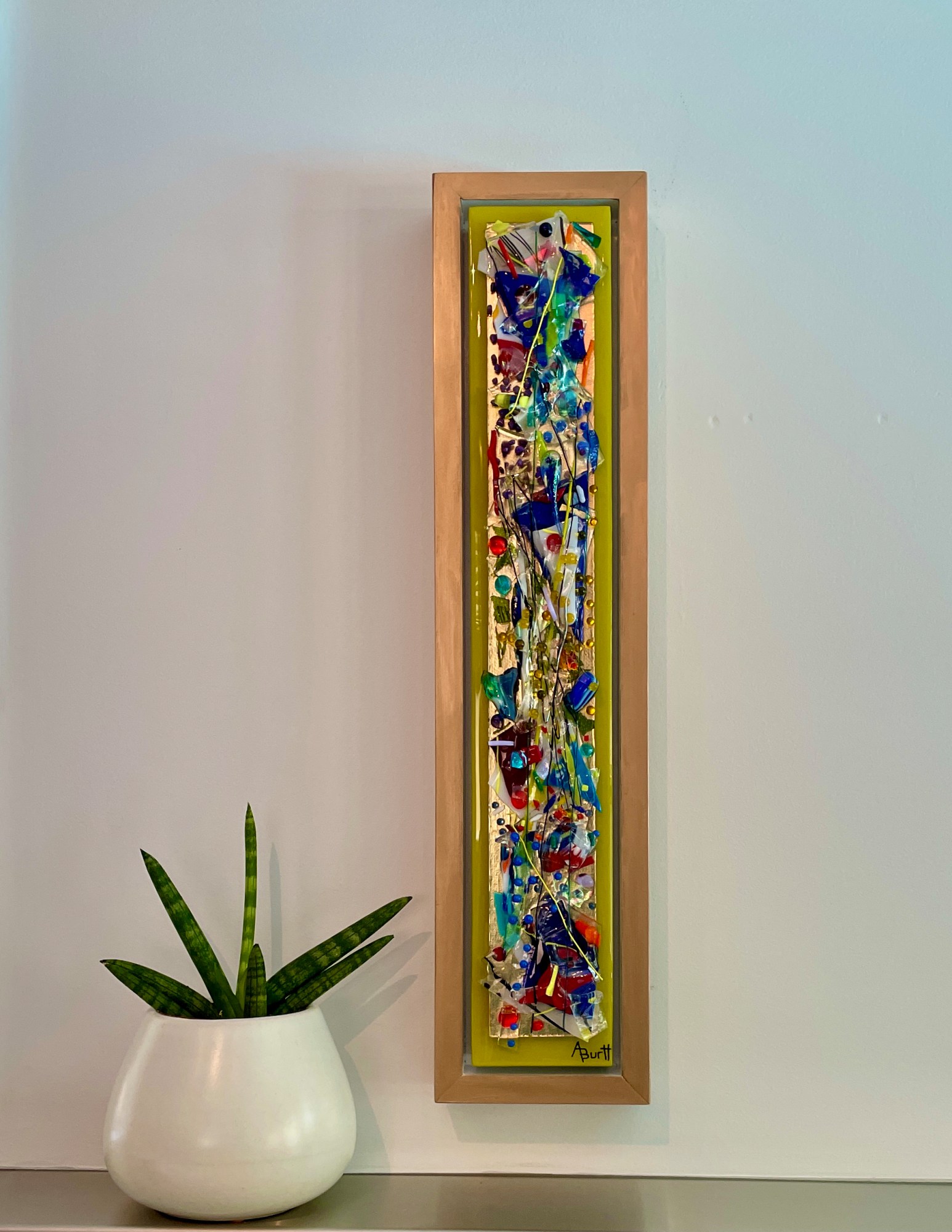 Introducing "A Whale of a Day" fused glass artwork, a stunning piece that combines thick layers of colorful glass with gold leaf to create depth and texture. Every inch of this contemporary art masterpiece features unique glass shapes and colors, making it just as interesting from the side as it is from the front. This eye-catching fused glass panel is mounted to a chartreuse painted wood panel and covered in a shiny resin coat, adding a touch of modern sophistication to any space. "A Whale of a Day" is the perfect addition to any art collection or home décor, sure to spark conversation and admiration.