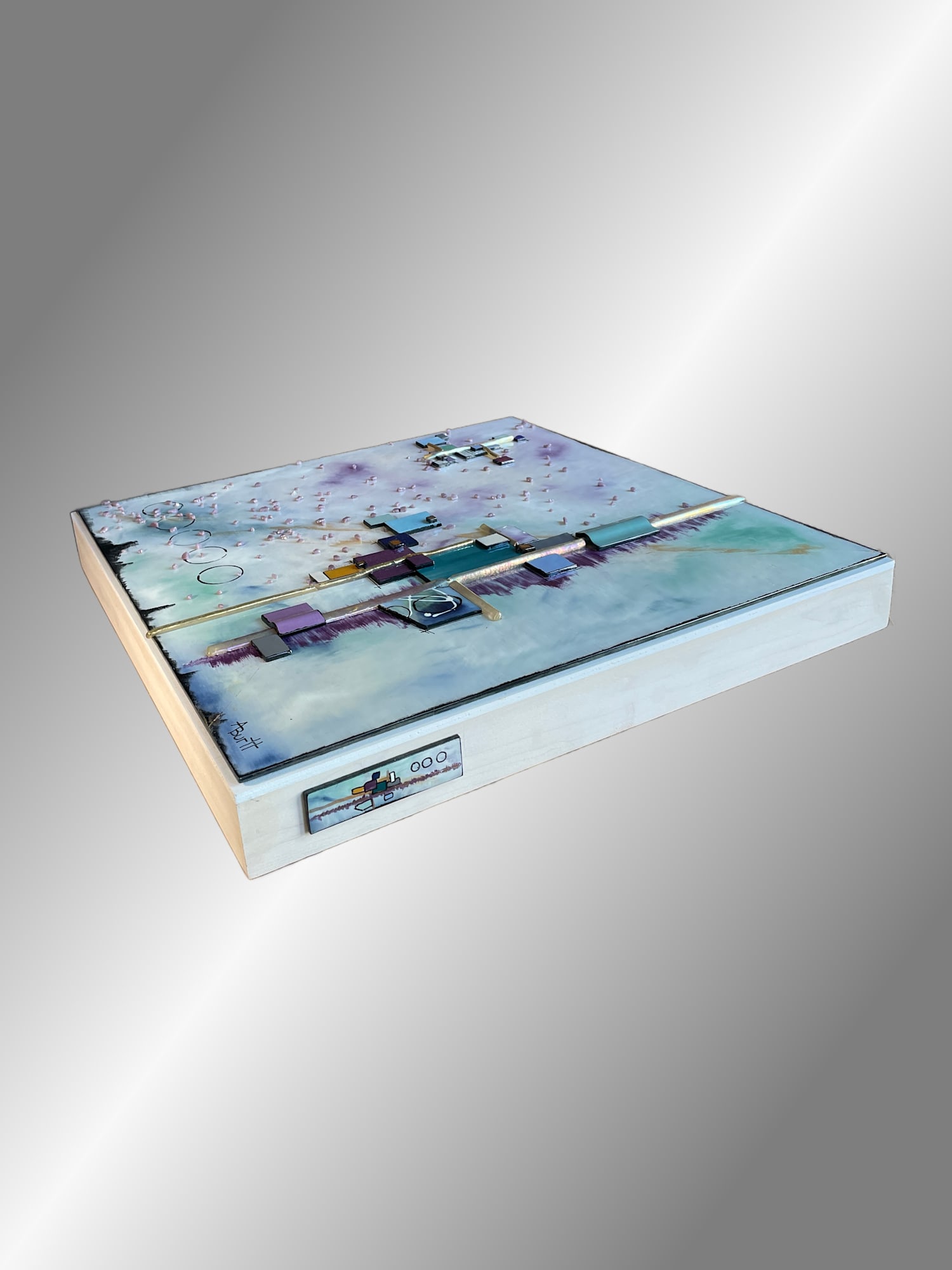 The fused glass artwork is mounted to a deep, 18"x18"x2" whitewashed wood panel and is wired and ready to hang. I also added my signature glass “tattoo” to the side of the panel. The tattoo design mimics the design on the front of the panel.