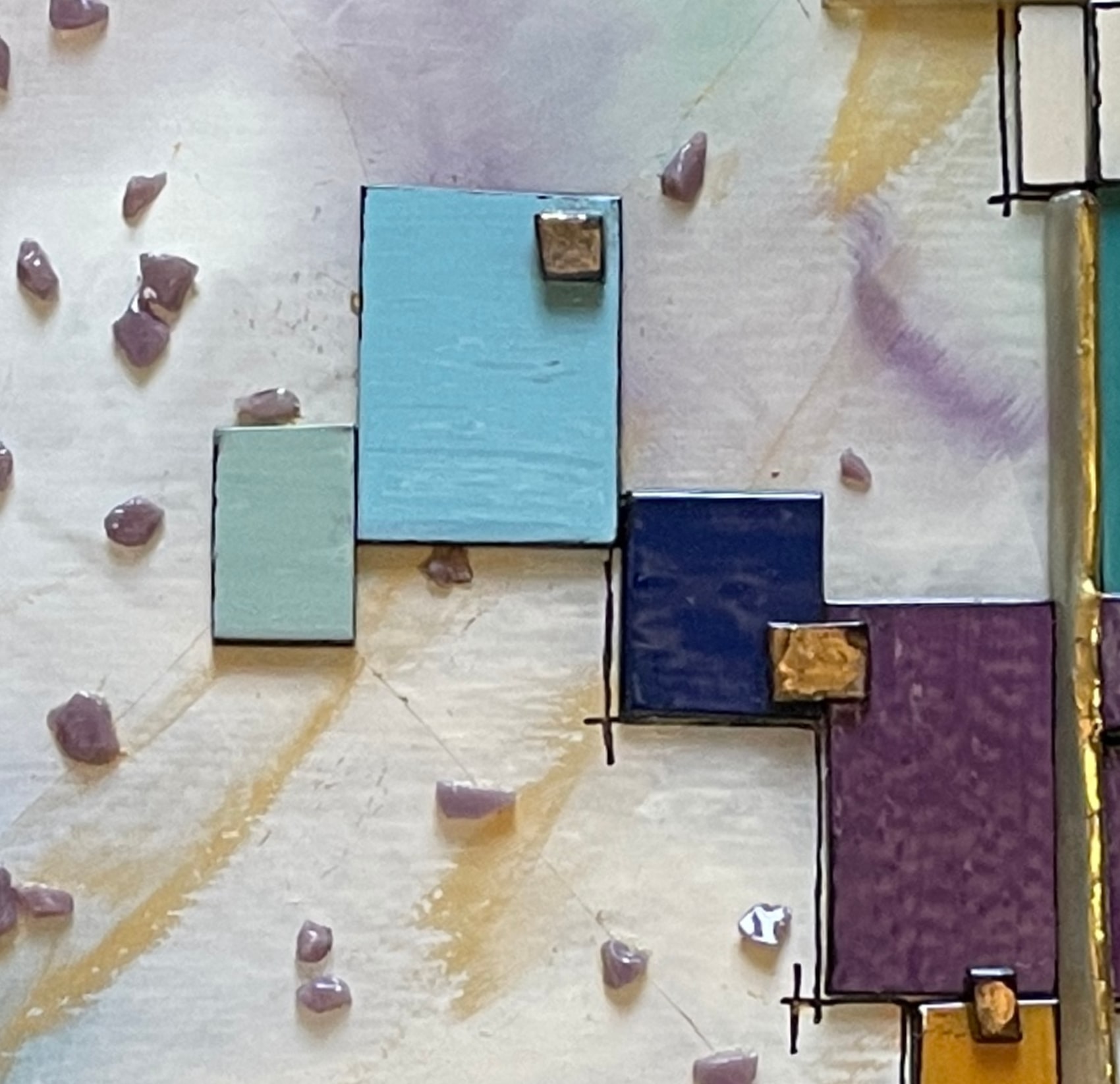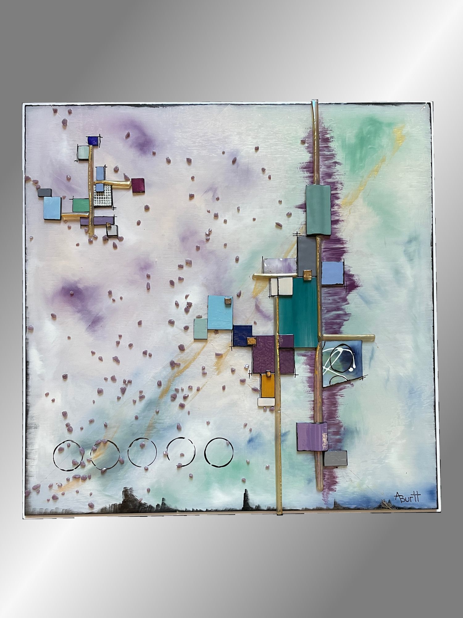 After the Rain is an abstract landscape in my Glasscapes series. This piece was created and sent to a gallery on the East Coast that represents me. Damage to the piece occured during shipment. There was several cracks to the surface and two places on the raised gold glass design were broken. Once returned to me I thought I might be able to complete enough repairs to hide most of the damage. I created two draped glass pieces to hide the damage to the raised golden pieces and that damage is completely hidden. All of the larger damaged places have been hidden with additional glass designs on the surface. However, you should know that it is not perfect and in the right light, and if closely examined, you can still see cracks in the glass surface.