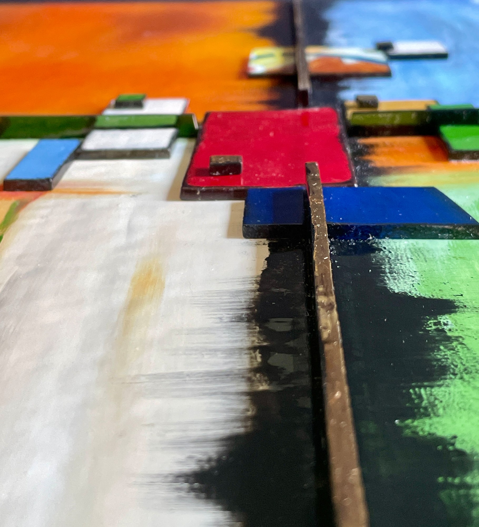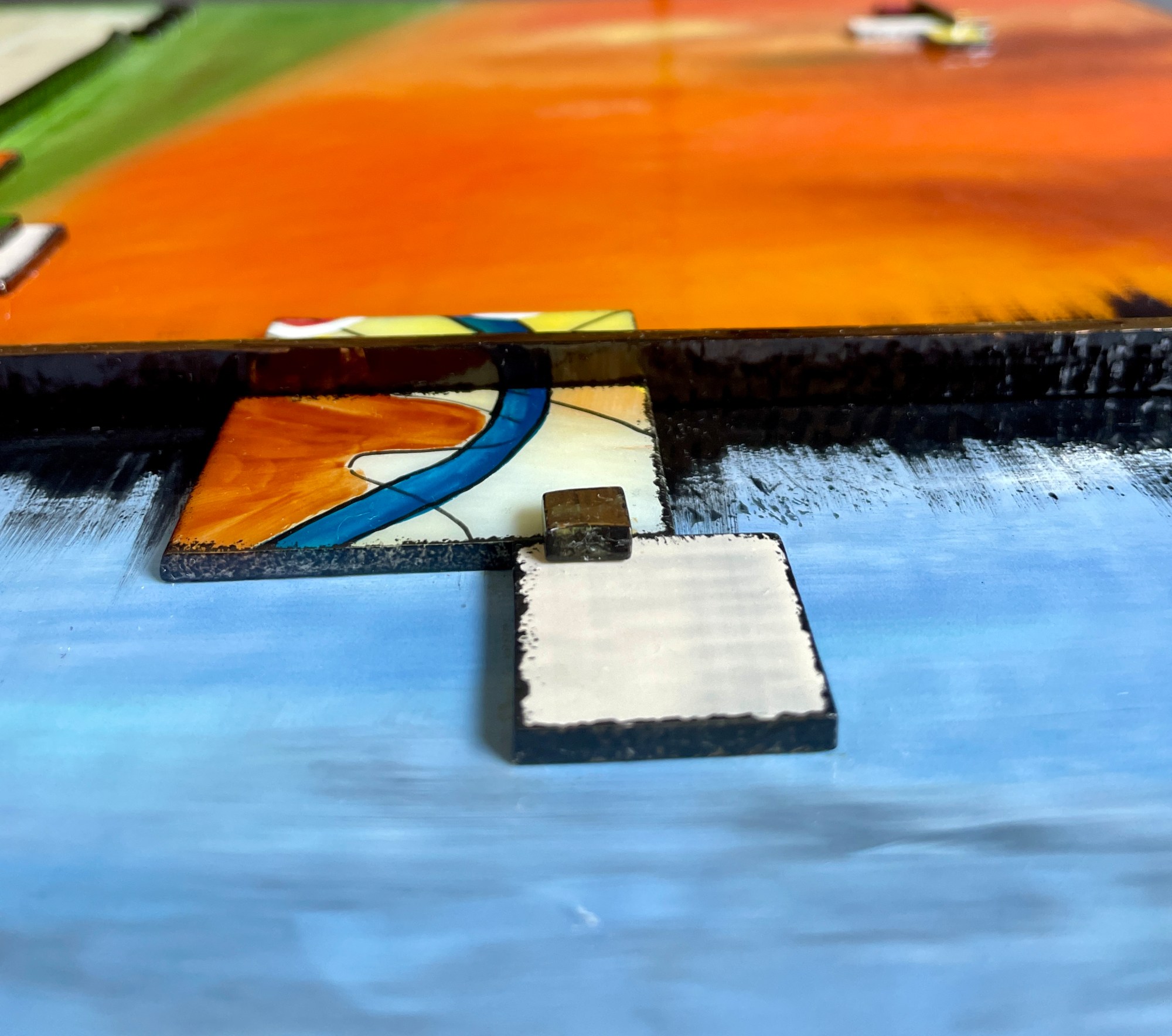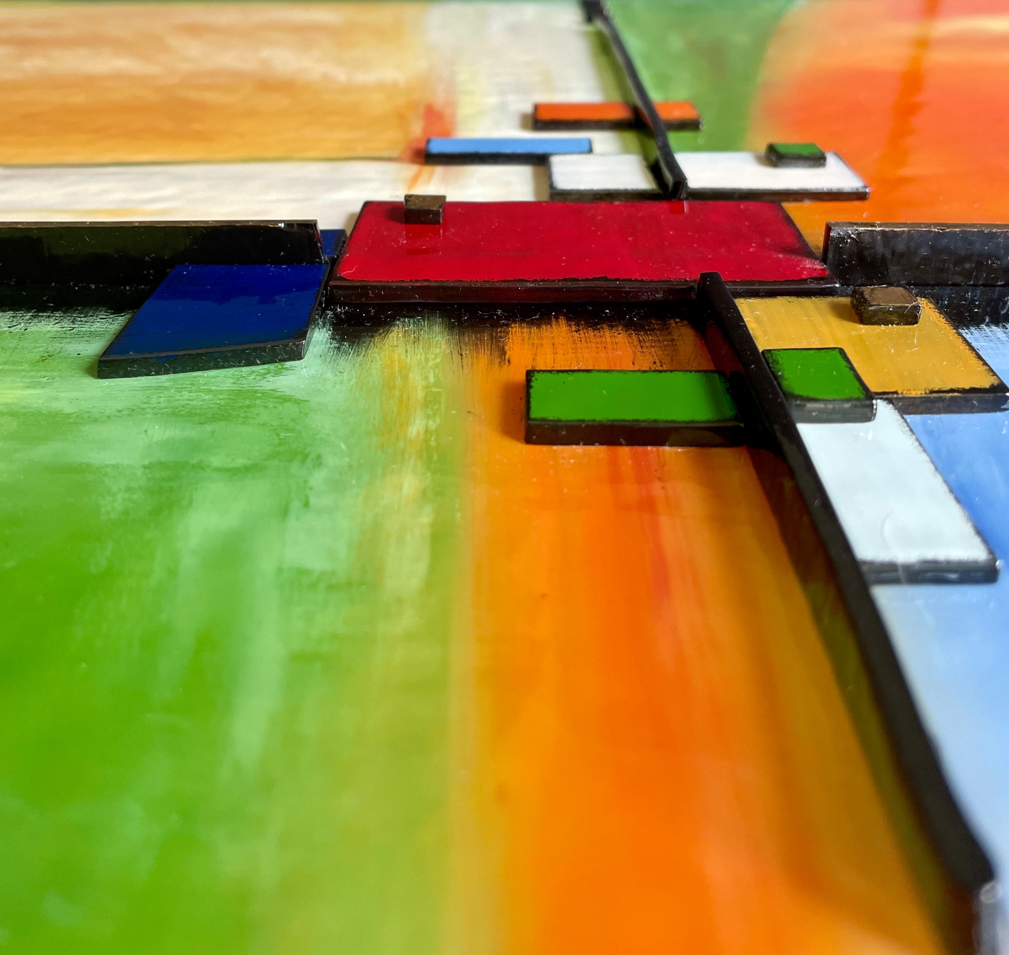 The fused glass artwork is mounted to a deep, 18"x24"x2" whitewashed wood panel and is wired and ready to hang. I also added my signature glass “Tattoo” to the side of the panel. The tattoo design mimics the design on the front of the panel.