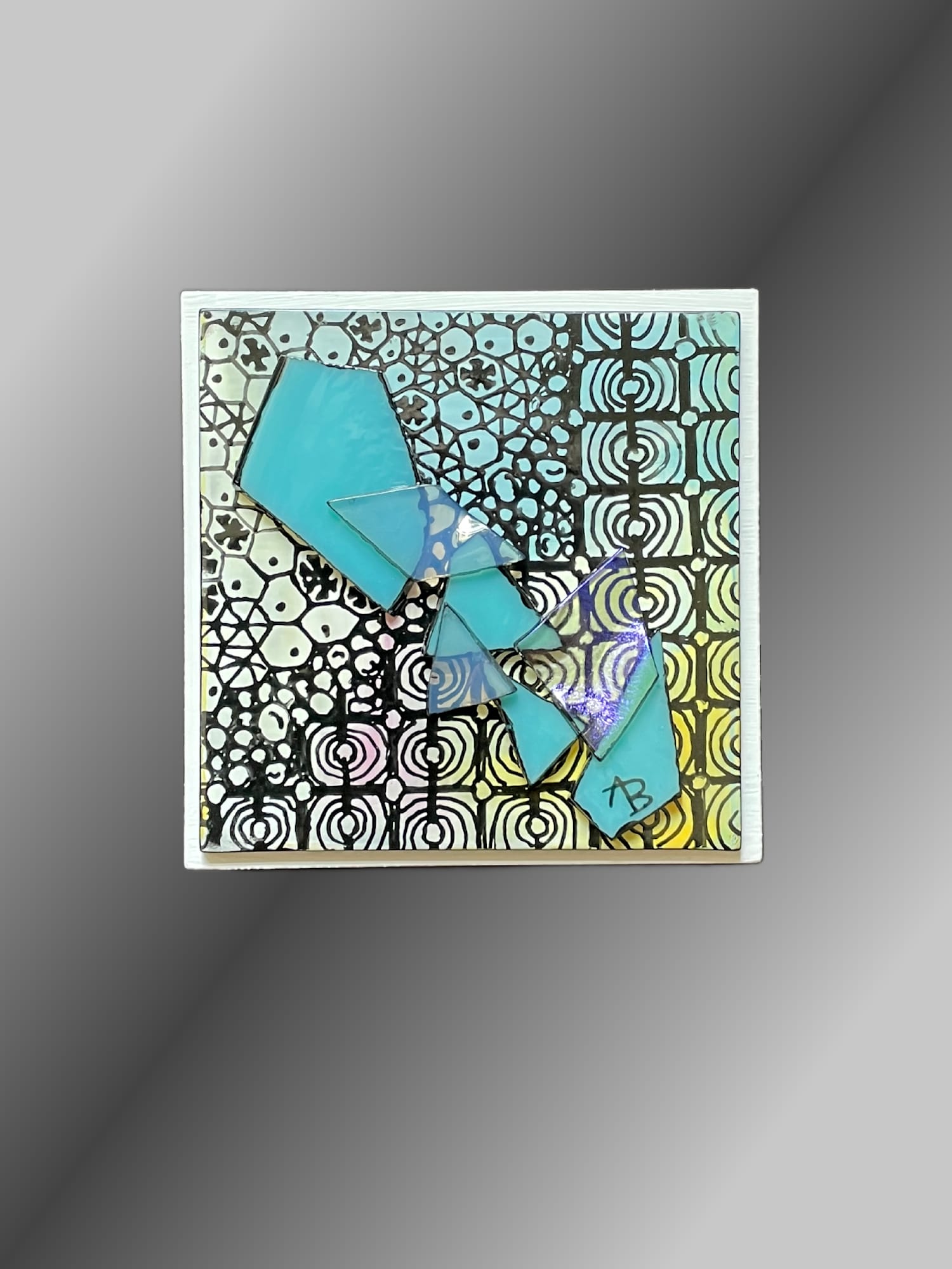This block is part of my new Nirvana collection. "Bliss" was created by painting with enamels on glass then fired in my kiln. A colorful yellow, pink, white and blue background creates interest, but the star of the show is the intricate surface design in black. On top of this design I layered light blue and clear glass pieces for texture. I really love the way this one came out. Although the surface designs are time consuming, there is a zen quality to them. It is very relaxing creating the designs. I added a painted glass design (tattoo) on the gold side of the block which mimics the front and adds interest.