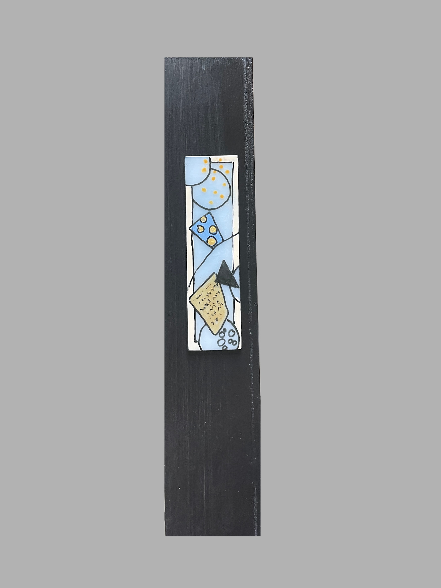 "Golden Fantasy" is a one-of-a-kind abstract Art Deco influenced layered fused glass artwork. This exquisite piece features a harmonious blend of blues, black and golds, accentuated with black highlights, creating a captivating visual experience. The artwork is intricately designed with lots of textural interest, adding depth and dimension to the composition. It is expertly raised mounted on a 24"x24"x2" wood panel painted gold, featuring different size black circles and black painted sides for a modern touch. Bring a touch of elegance and sophistication to any space with this mesmerizing fused glass art piece.