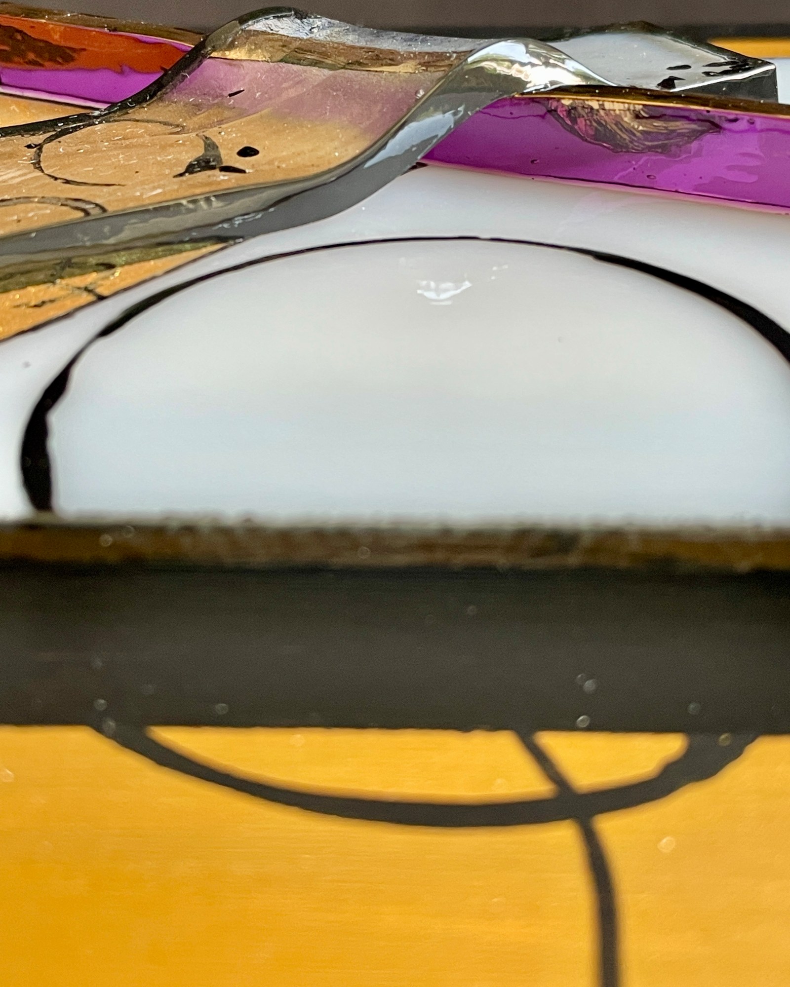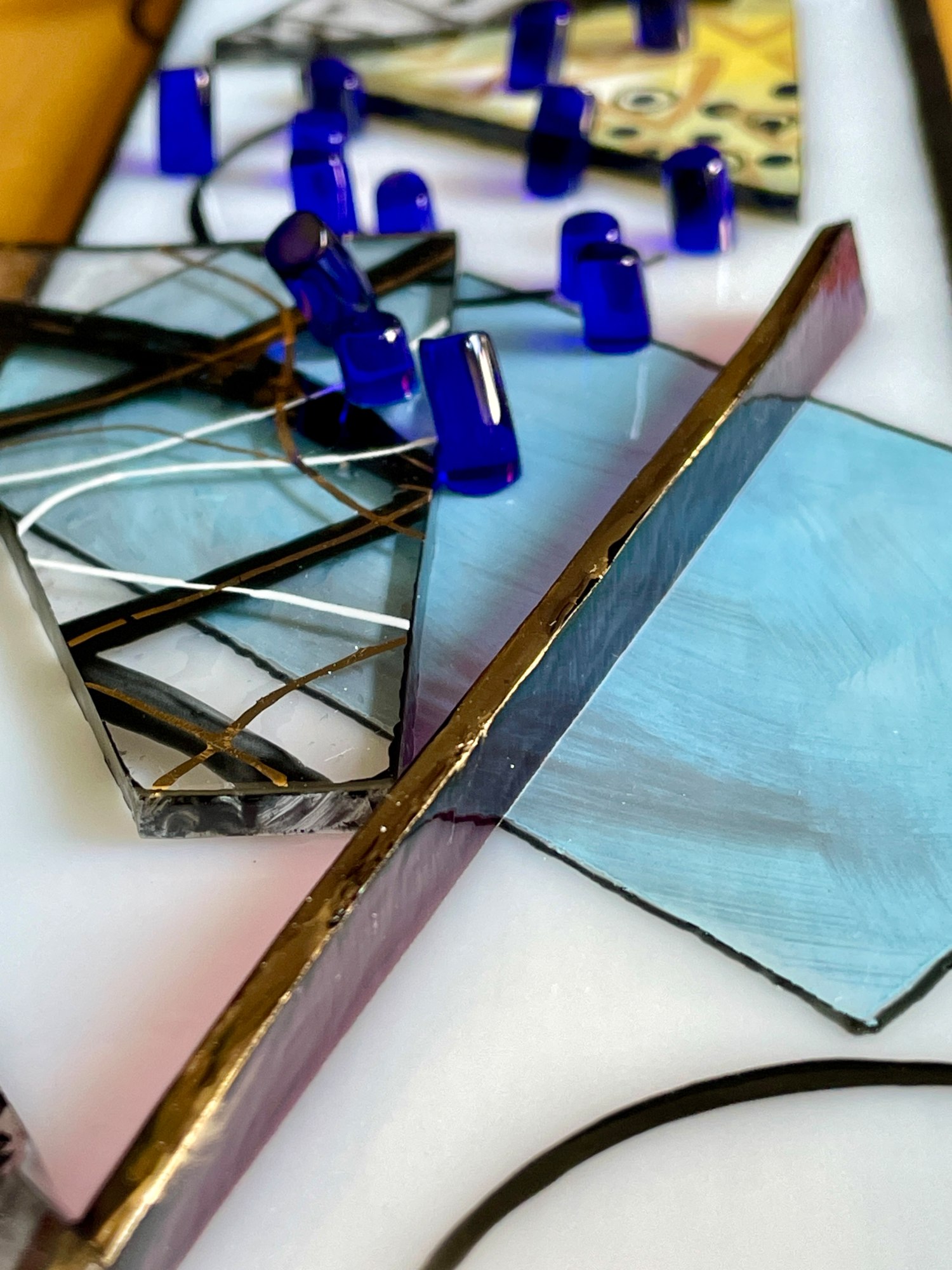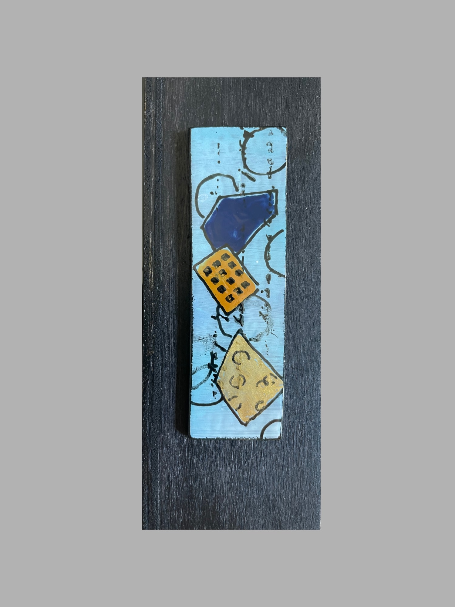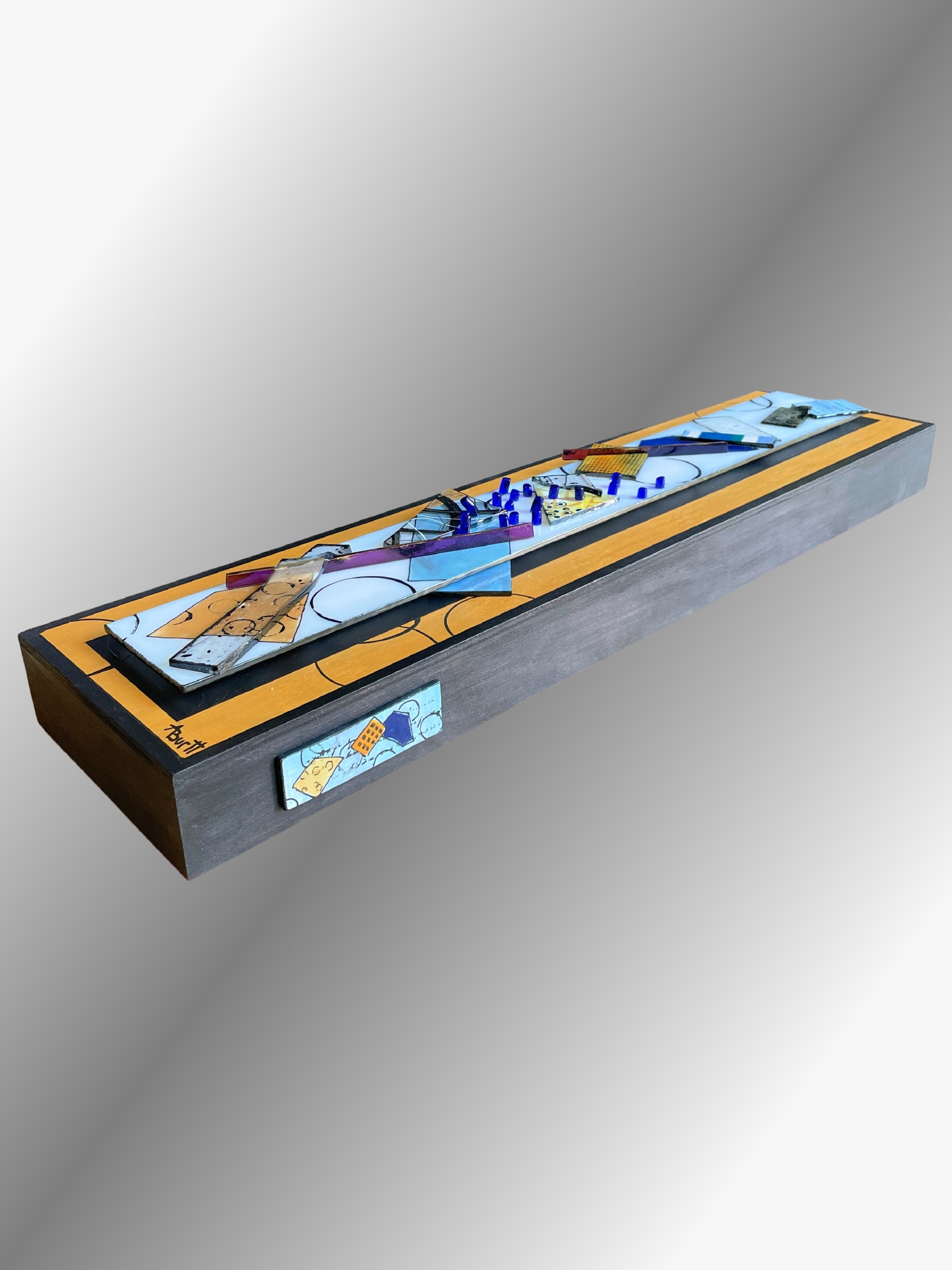 Golden Harmony is an alluring fused glass masterpiece. Its elongated, slender form captivates the senses, showcasing vibrant geometric shapes encased within a warm embrace. The heart of the piece is a design of rectangles, triangles, and polygons in striking blues, shimmering golds, and earthy hues, each enriched with intricate lines, patterns, and metallic highlights. Scattered blue glass dance across the scene, offering a mesmerizing contrast. The painted glass, lovingly set on a gold-painted wood panel with elegant black sides, creates a textured, visually enchanting experience. This dynamic, abstract creation invites viewers to lose themselves in its intricate, emotional layers.