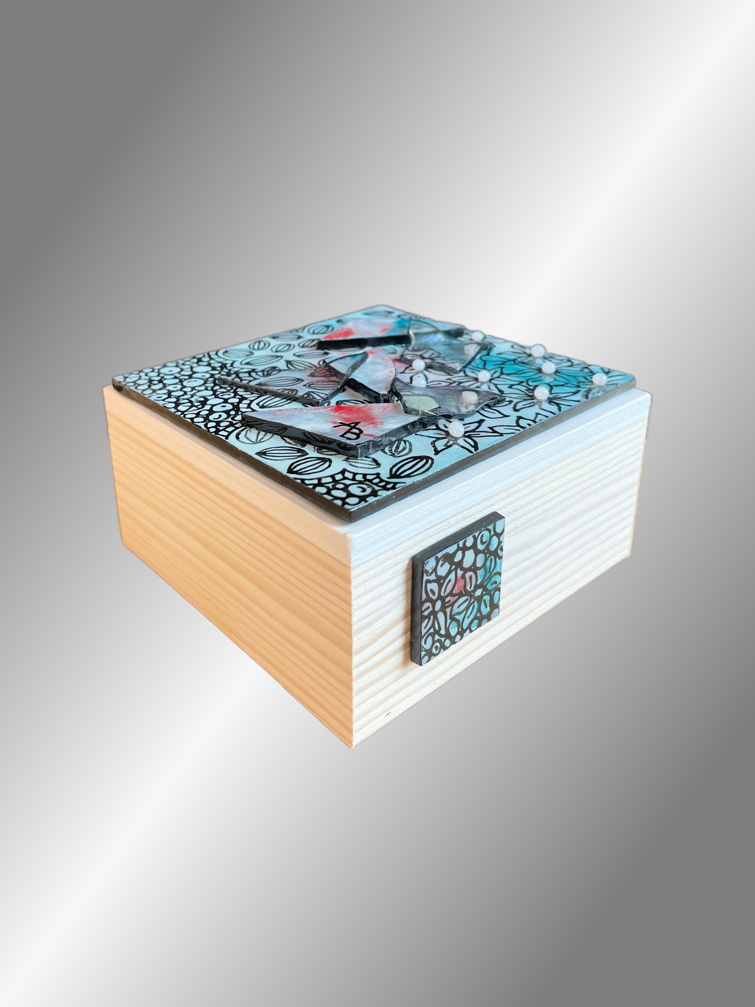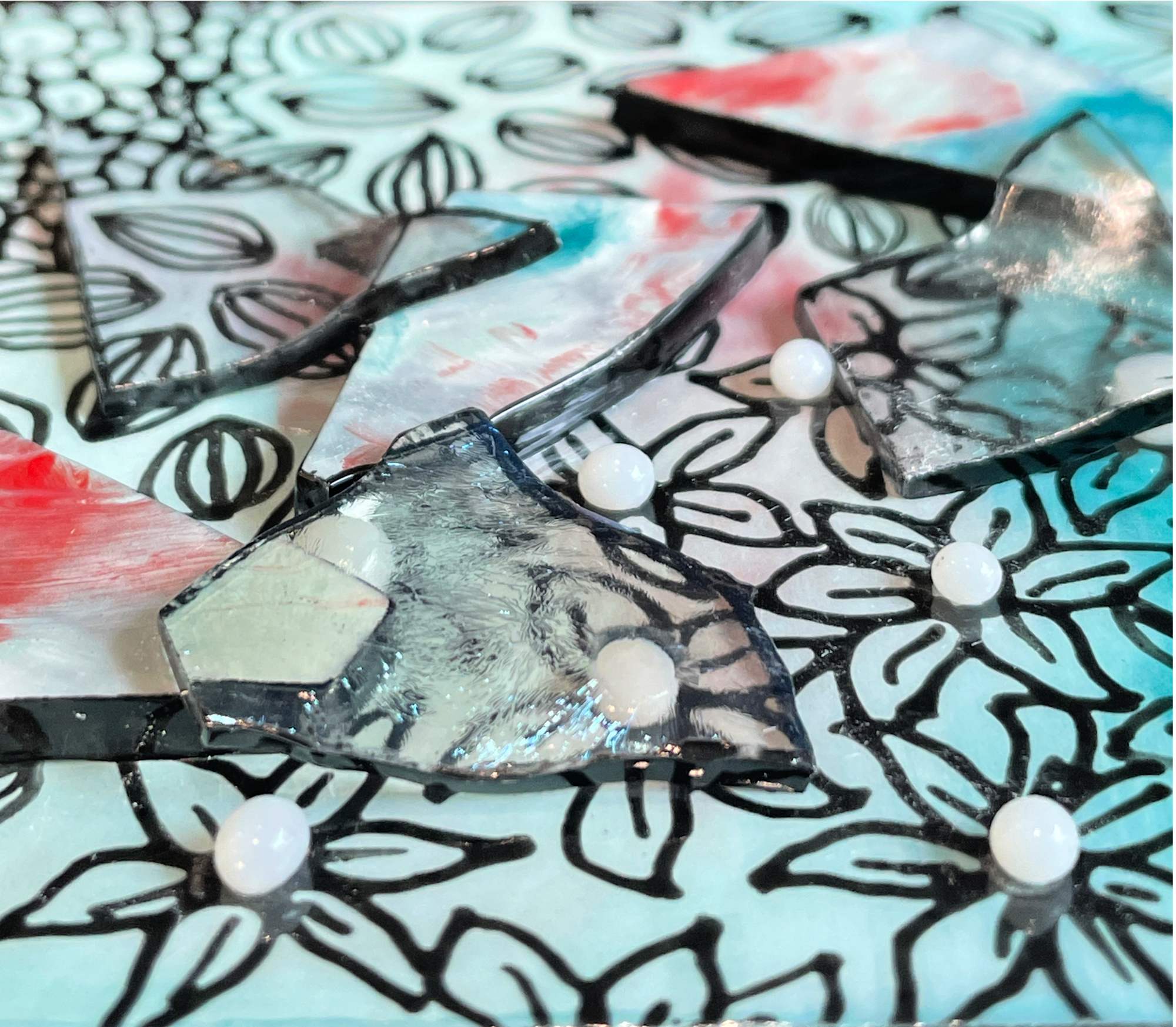 This block is part of my new Nirvana collection. "Gratitude" was created by painting with enamels on glass then fired in my kiln. A colorful turquoise and red background creates interest, but the star of the show is the intricate surface design in black. On top of this design I layered turquoise, red and clear glass pieces and small white glass dots for texture. I really love the way this one came out. Although the surface designs are time consuming, there is a zen quality to them. It is very relaxing creating the designs. I added a painted glass design (tattoo) on the side of the block which mimics the front and adds interest.