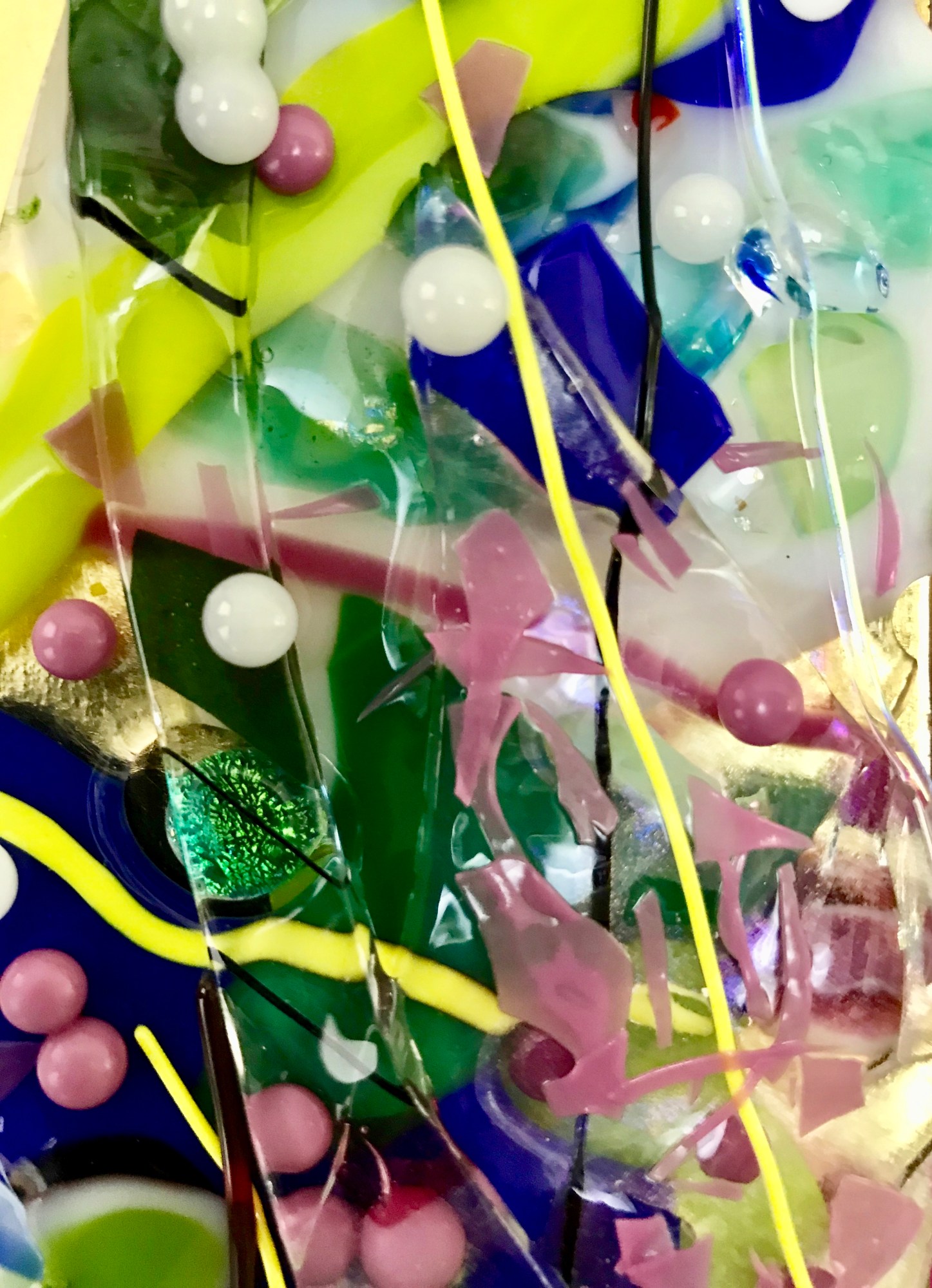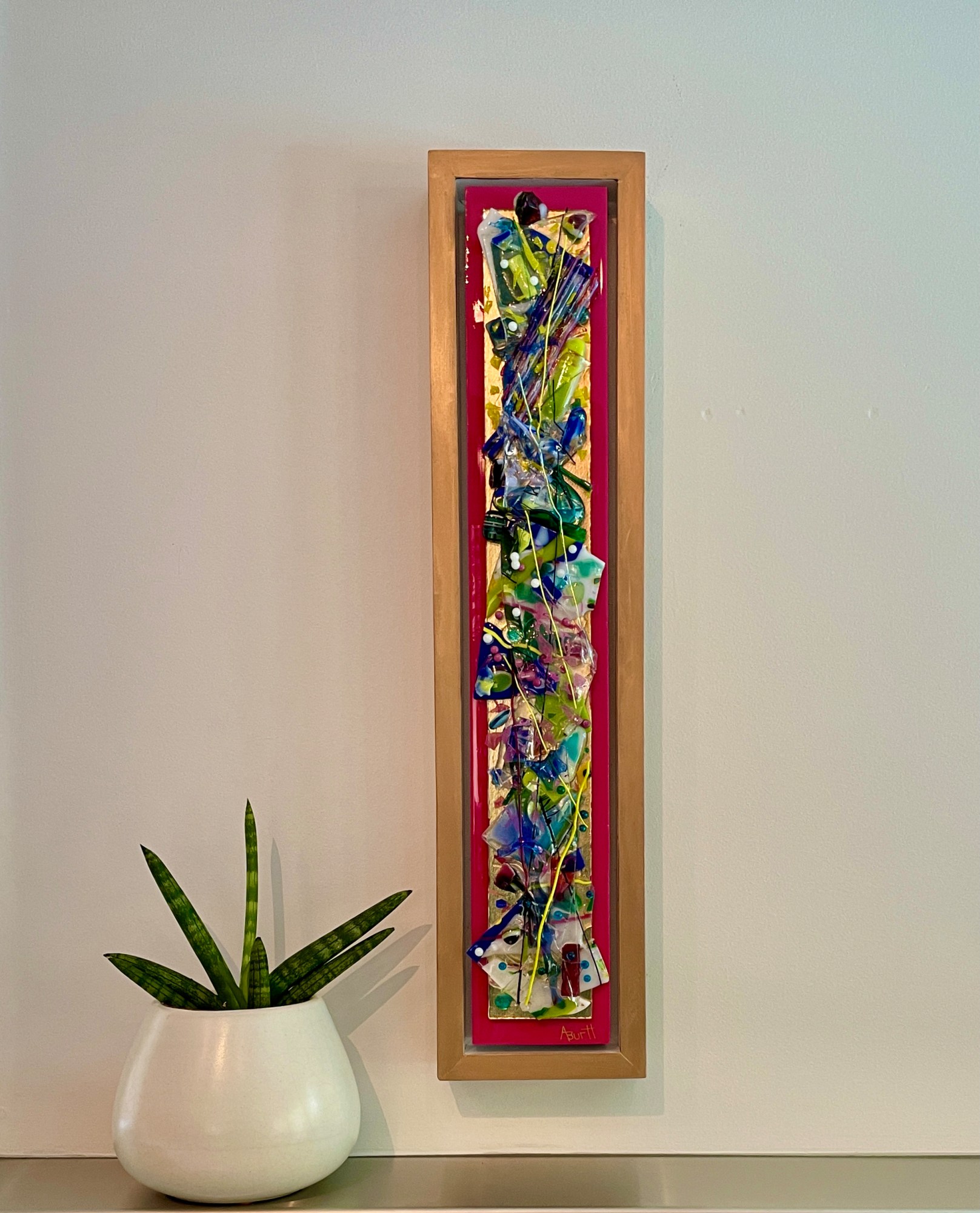 Introducing "Guilty Pleasure," a stunning piece of fused glass art that will add a pop of color and texture to any space! Thick layers of colorful fused glass, backed by gold leaf, create incredible depth and visual interest. This contemporary artwork incorporates unique glass shapes and colors, making it just as intriguing from the side as it is from the front. The fused glass panel is expertly mounted to a lipstick pink wood panel, covered in a shiny resin coat for a sleek and polished finish. "Guilty Pleasure" is the perfect statement piece for anyone looking to add a touch of modern art to their home or office.