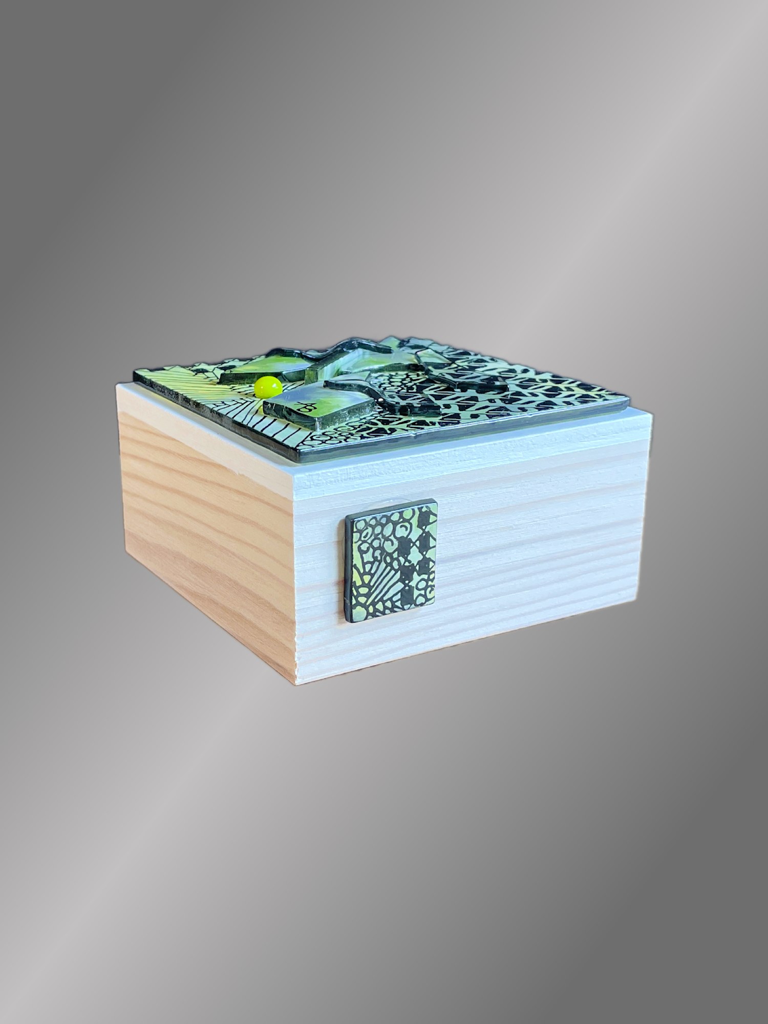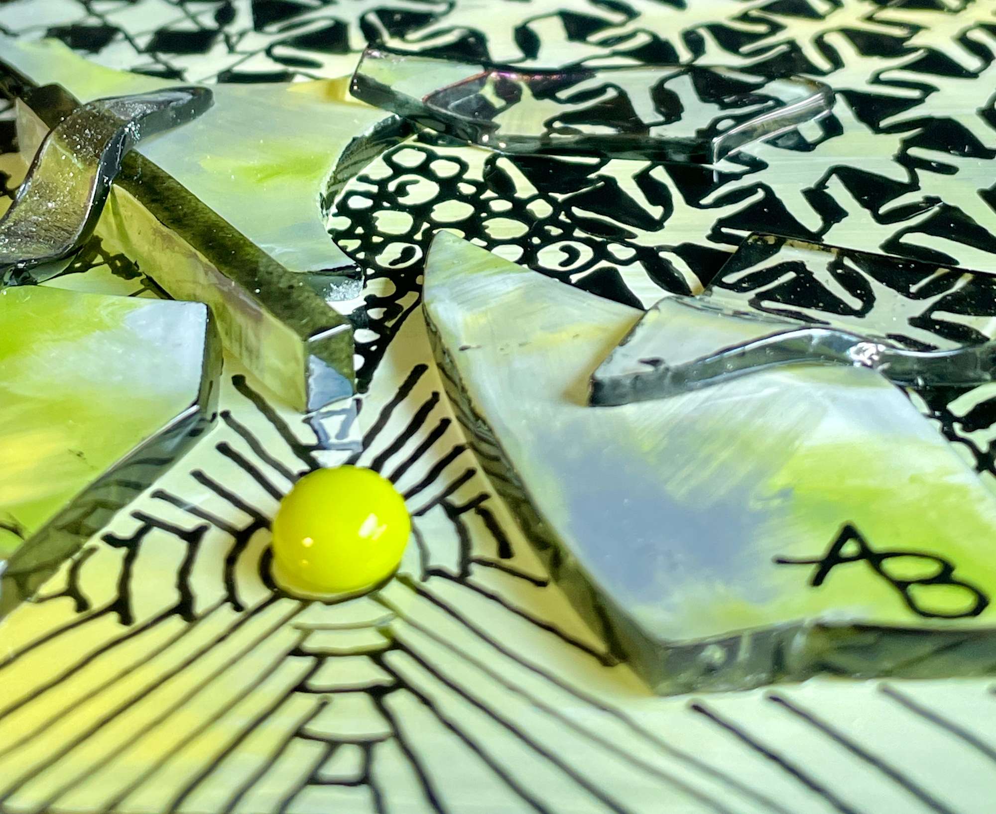 This block is part of my new Nirvana collection. "Happiness" was created by painting with enamels on glass then fired in my kiln. A colorful yellow and spring green background creates interest, but the star of the show is the intricate surface design in black. On top of this design I layered yellow, spring green and clear glass pieces for texture. I really love the way this one came out. Although the surface designs are time consuming, there is a zen quality to them. It is very relaxing creating the designs. I added a painted glass design (tattoo) on the gold side of the block which mimics the front and adds interest.
