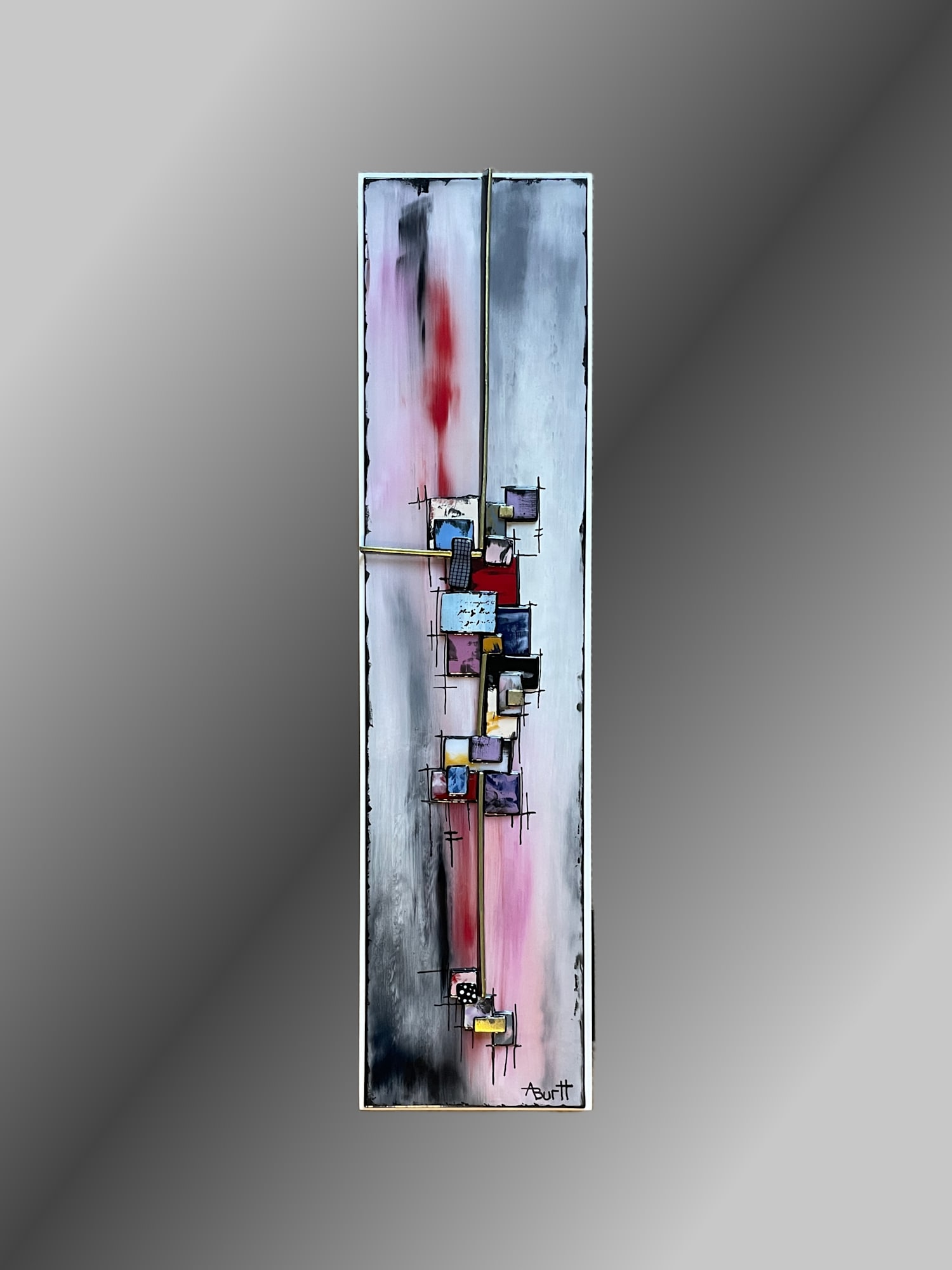The background shifts between soft grey, muted blush, and deep charcoal, with a concentrated lift of red moving upward through the center. Hand-cut glass components are kiln-fused in multiple firings to create depth, relief, and dimensional layering.