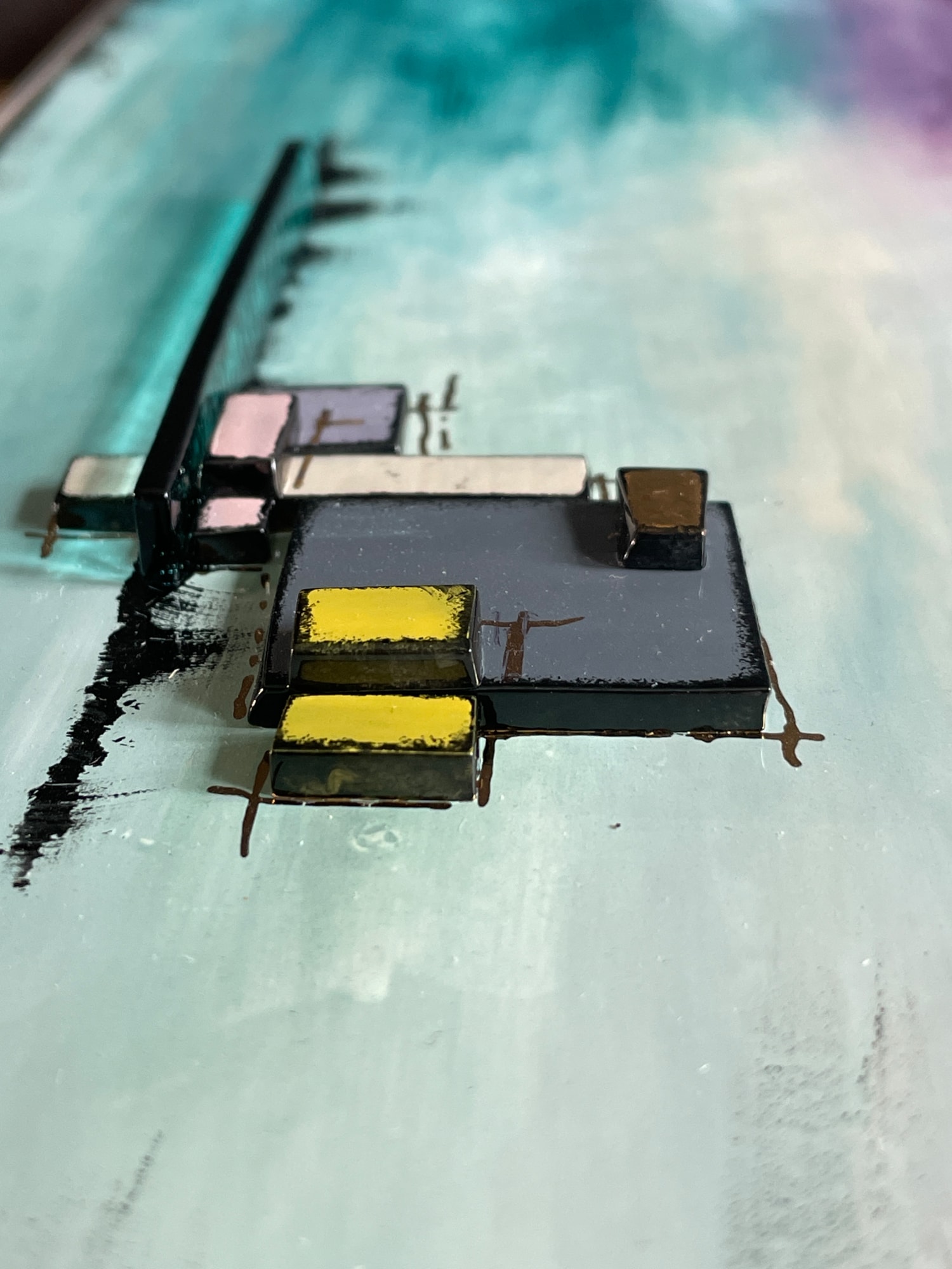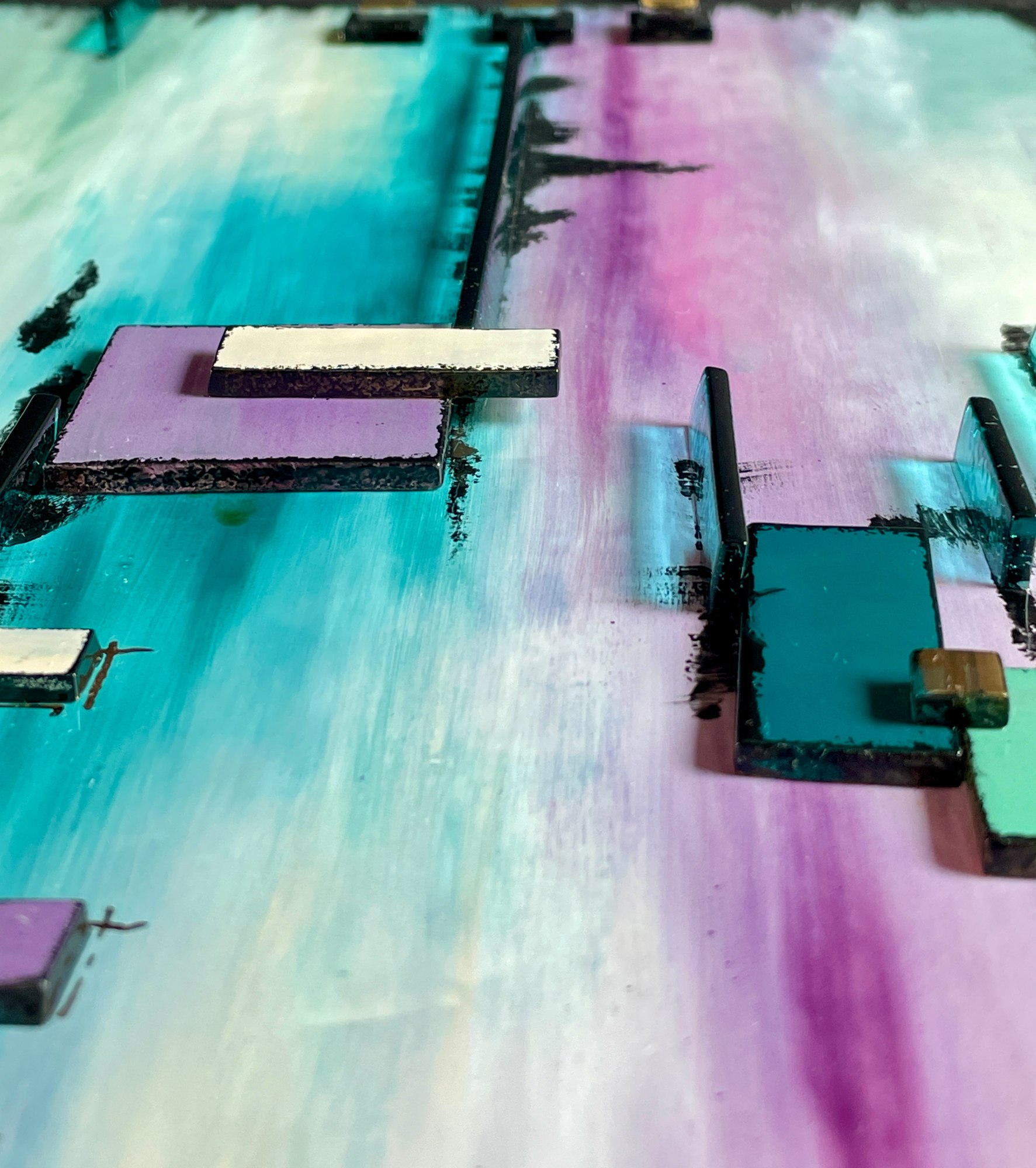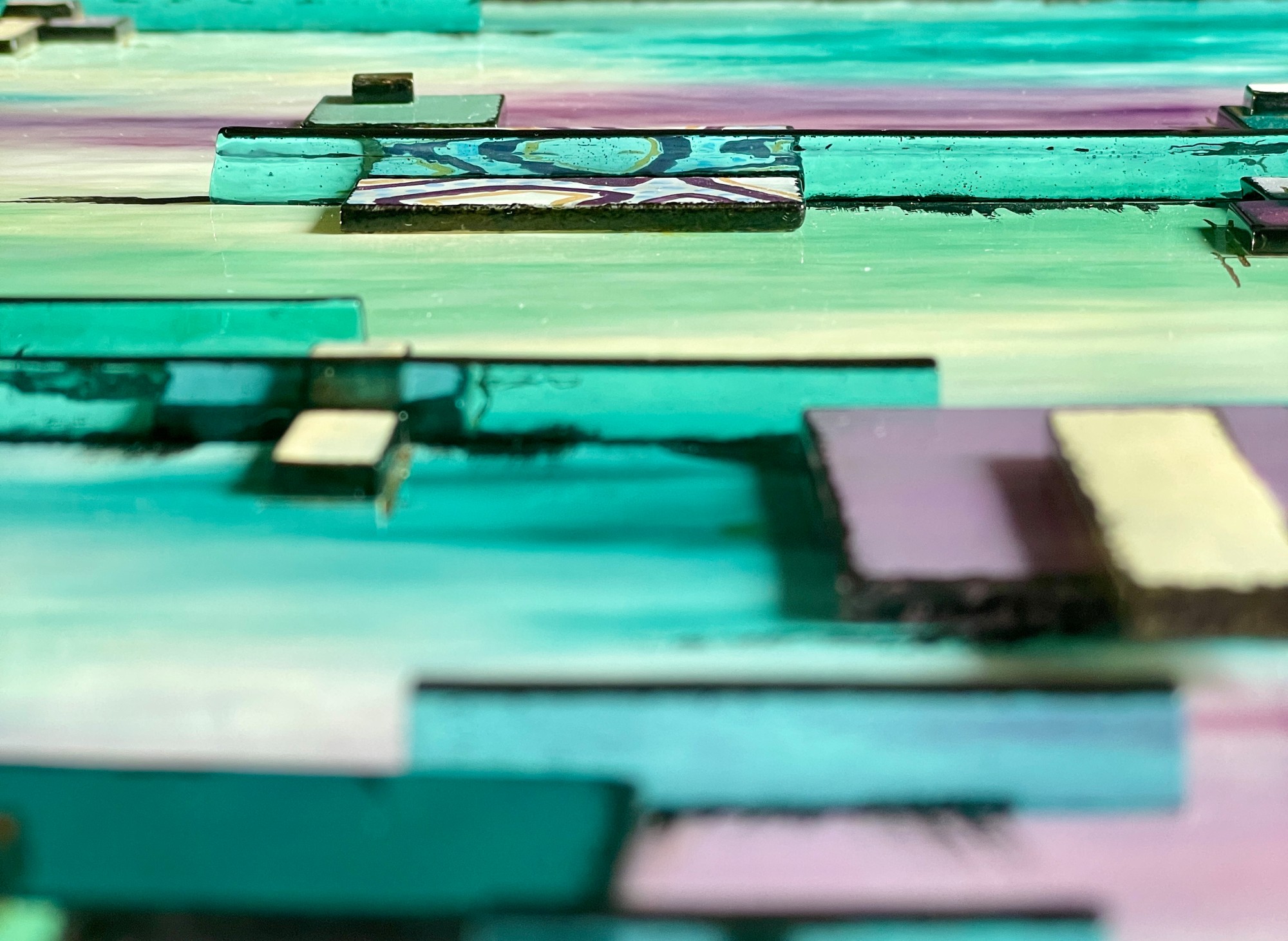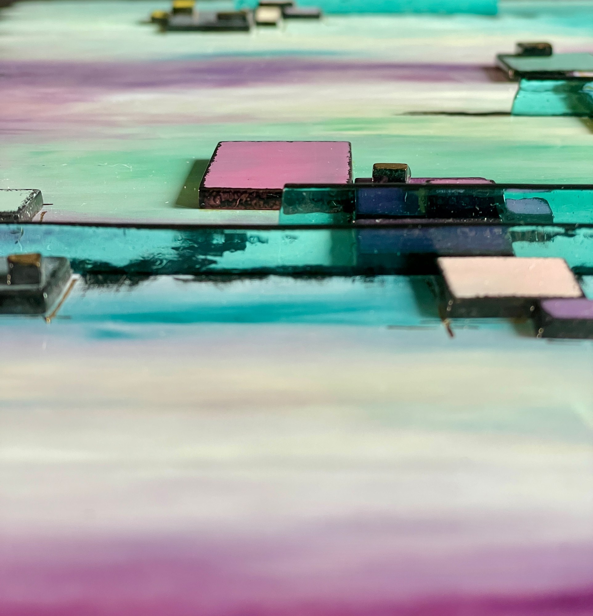 Introducing "Napa Nights," a stunning fused glass art piece that captures the essence of sipping wine in the enchanting Napa Valley. I meticulously painted the background design using enamels specially made for kiln fusing on art glass, blending turquoise, greens, and purples to evoke the serene beauty of the famous wine region. The piece features layers of small glass pieces and transparent light turquoise colored glass standing on edge, adding depth and texture to the artwork. Whether you're a wine enthusiast or simply appreciate the beauty of Napa Valley, "Napa Nights" is a unique and eye-catching addition to any art collection. Add a touch of elegance and sophistication to your space with this exquisite fused glass art.