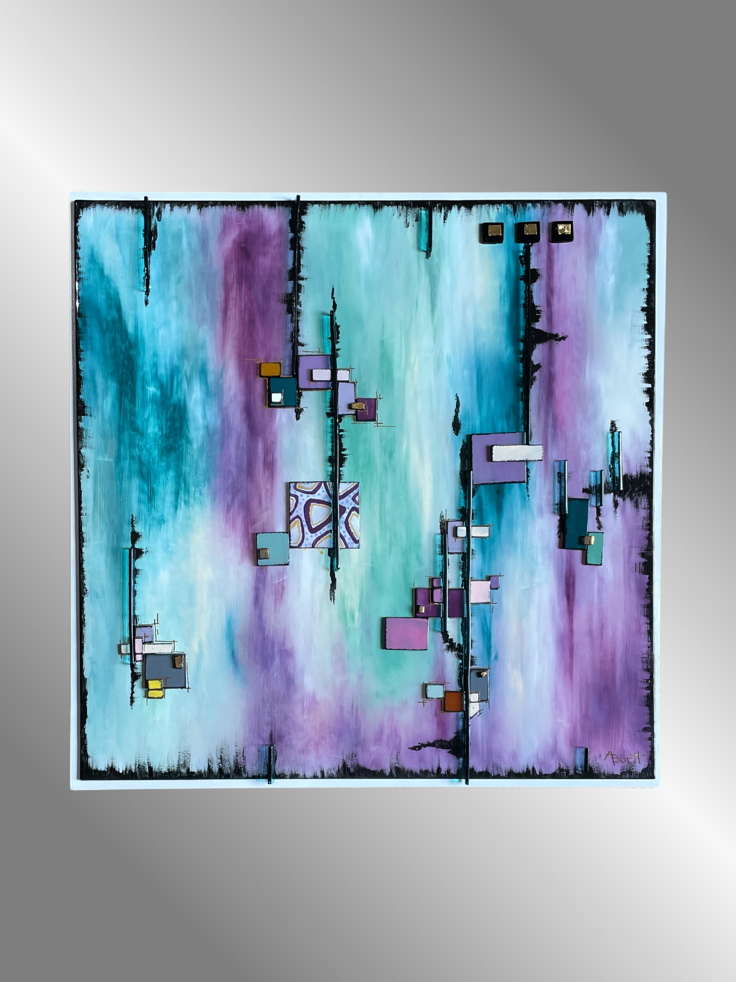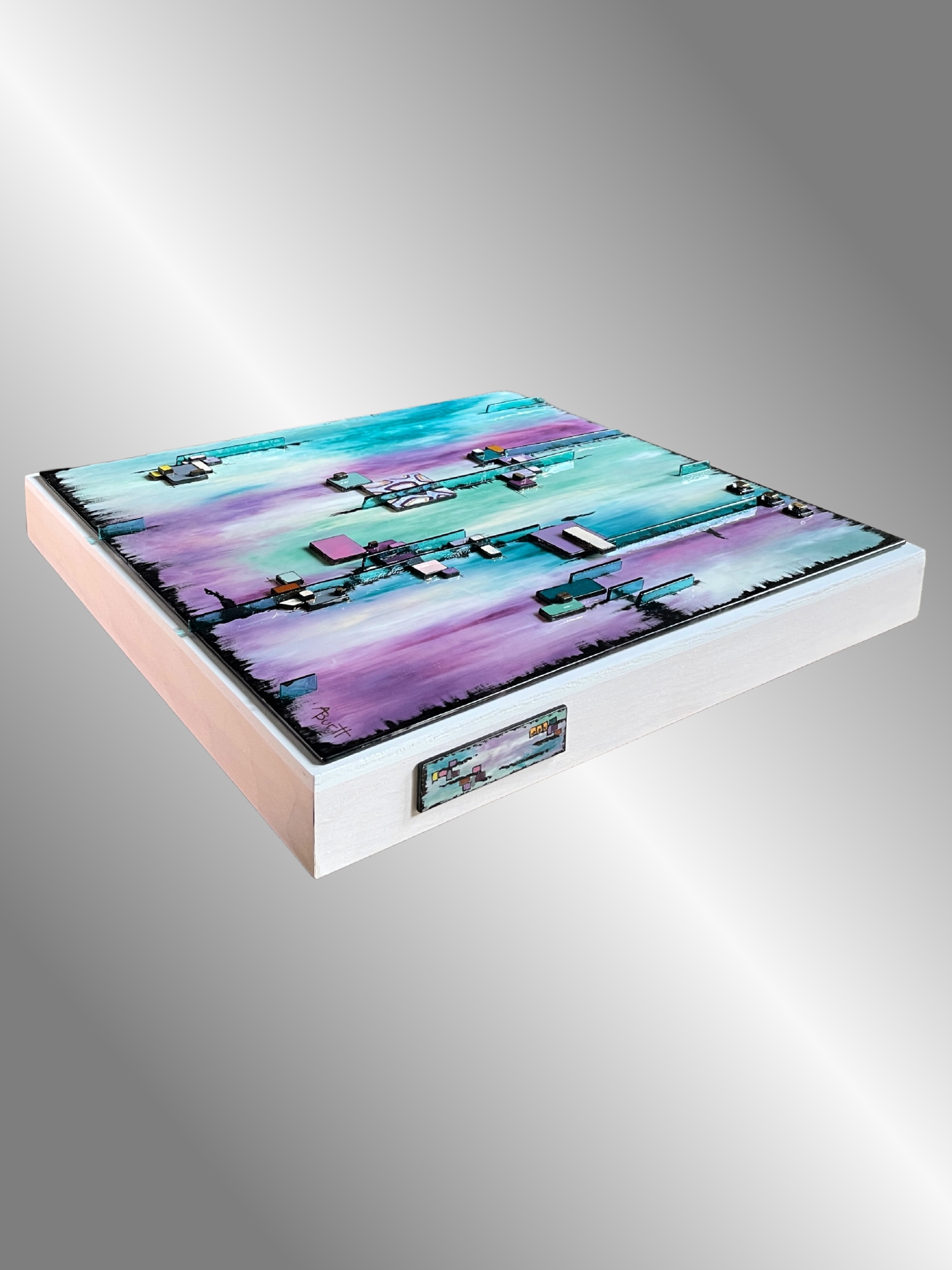 The fused glass artwork is mounted to a deep, 18"x18"x2" whitewashed wood panel and is wired and ready to hang. I also added my signature glass “tattoo” to the side of the panel. The tattoo design mimics the design on the front of the panel.