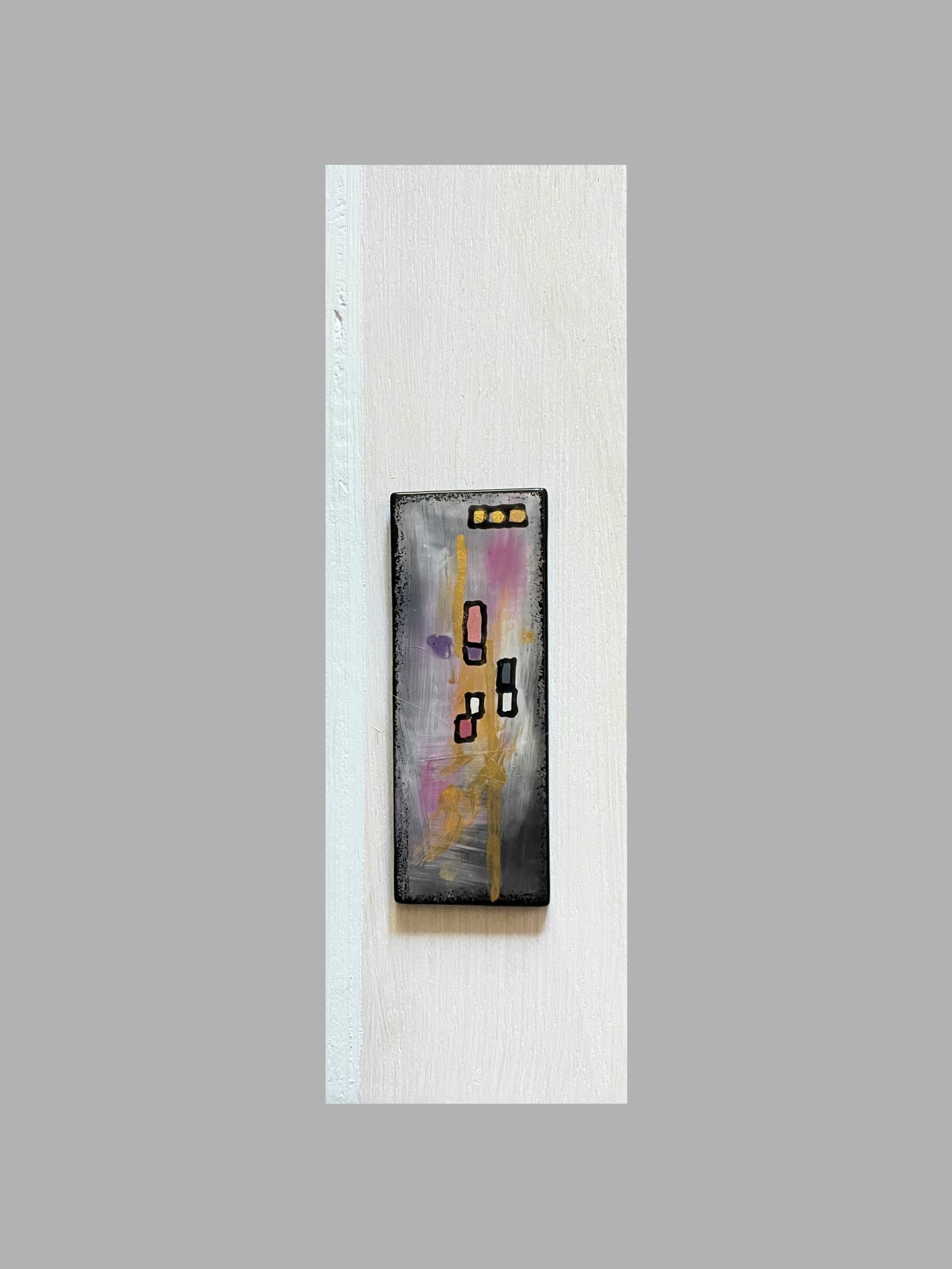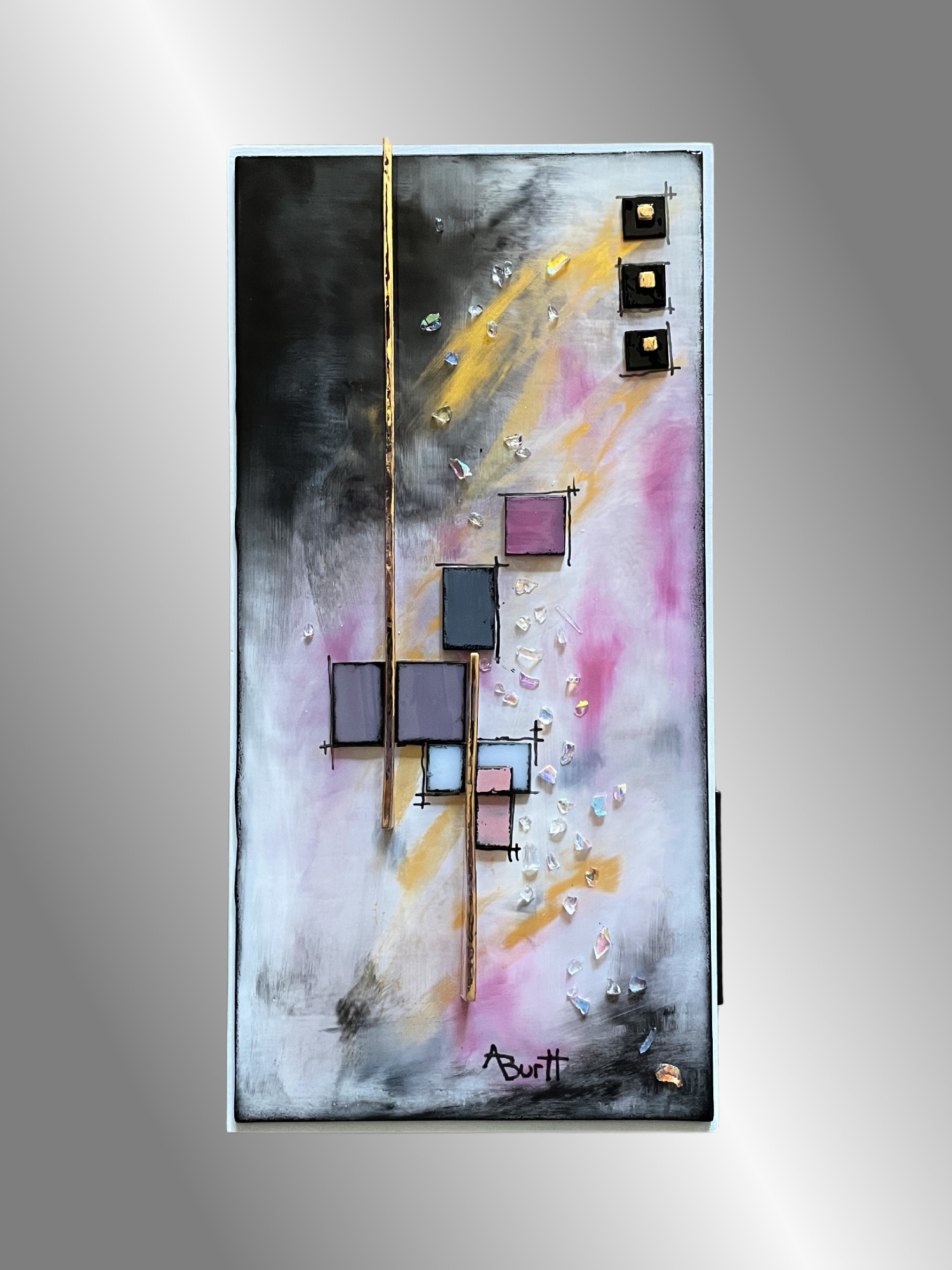 Bold pinks are the reason behind "Pink Party!" Moody gray and black enamels with gold highlights are painted on glass and fused in a kiln into an abstract design. This piece has several different design elements including transparent light pink glass strips on their side with gold painted on the edge. Additional painted glass pieces are added to the surface to give the design texture and definition. Finally, small dichroic glass pieces provide that "bling" every "Pink Party" needs! It is adhered to a 12"x6"x2" wood panel and ready to hang.