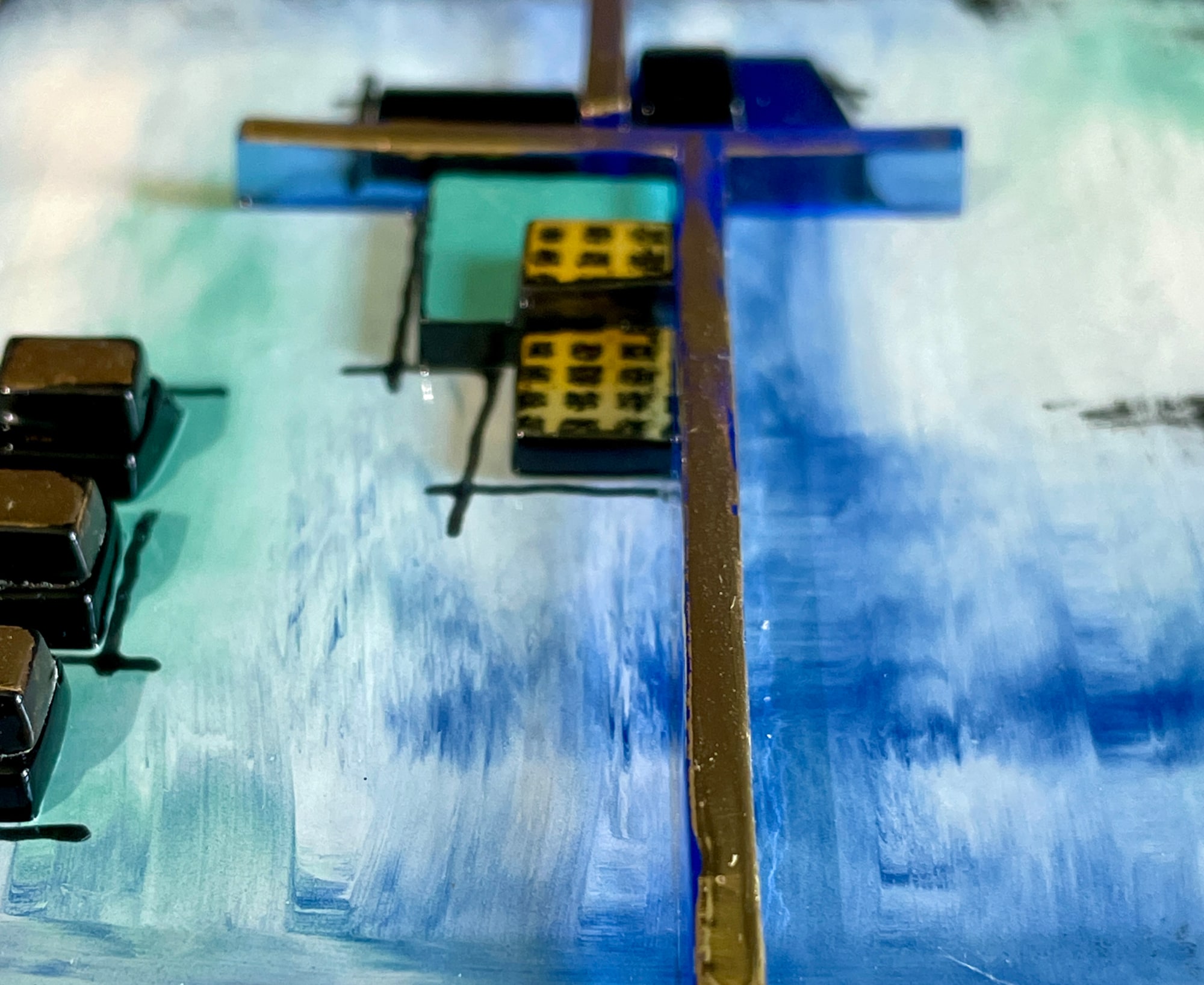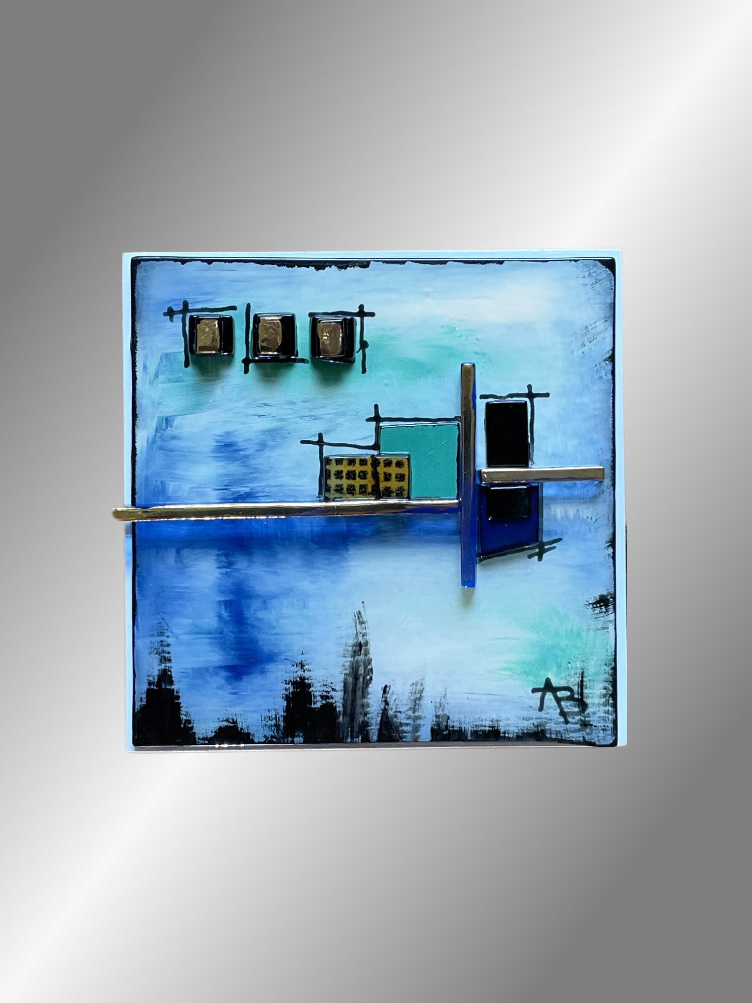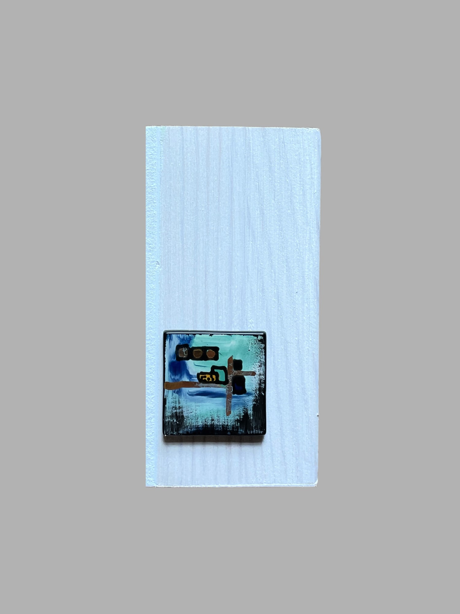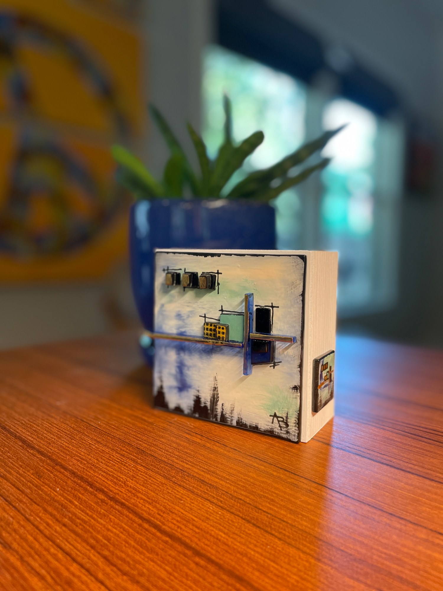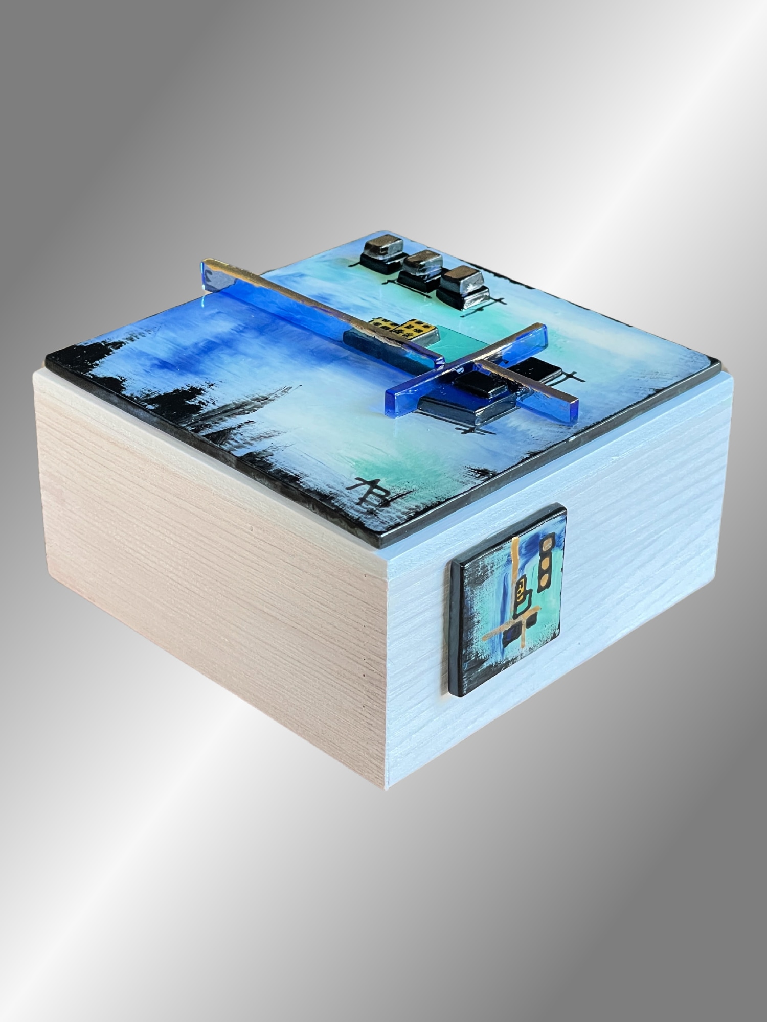Discover a world of color and texture with "Resonance." A dreamy blue background adorned with deep black, green, and striking gold accents draws you in. Bold gold lines divide the piece create dynamic energy. Crafted with textured brushstrokes and multiple glass layers, "Resonance" invites imagination and exploration. Immerse yourself in its layered elegance and playful charm. I added a painted glass design (tattoo) on the whitewashed side of the block which mimics the front and adds interest. The block is 4"x4"x2" with whitewashed sides.