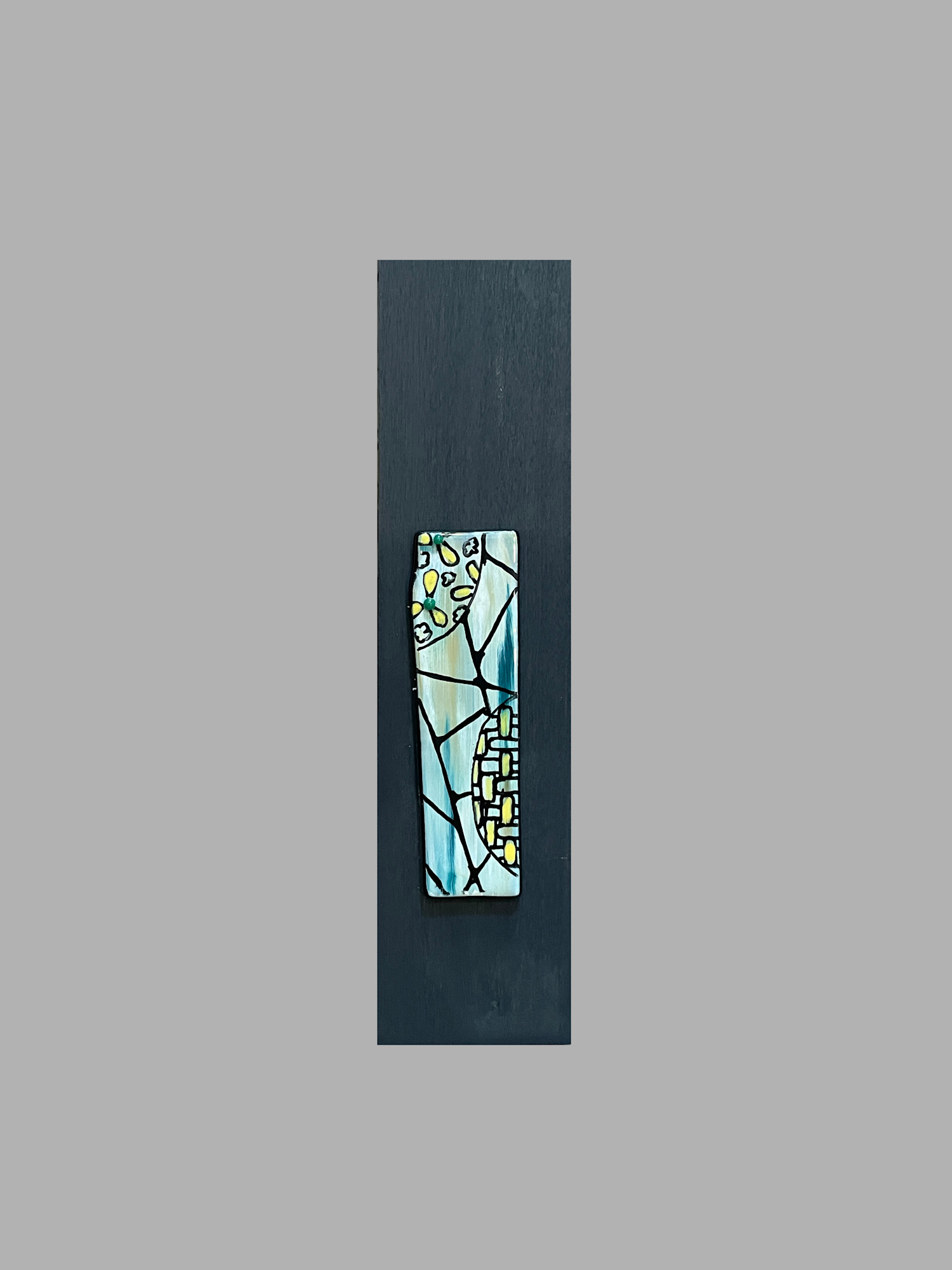 I added a glass "tattoo" design on the black painted side of the wood panel which mimics the front and adds interest. This fused glass artwork is 24" x 6"x 2"and is ready to hang.