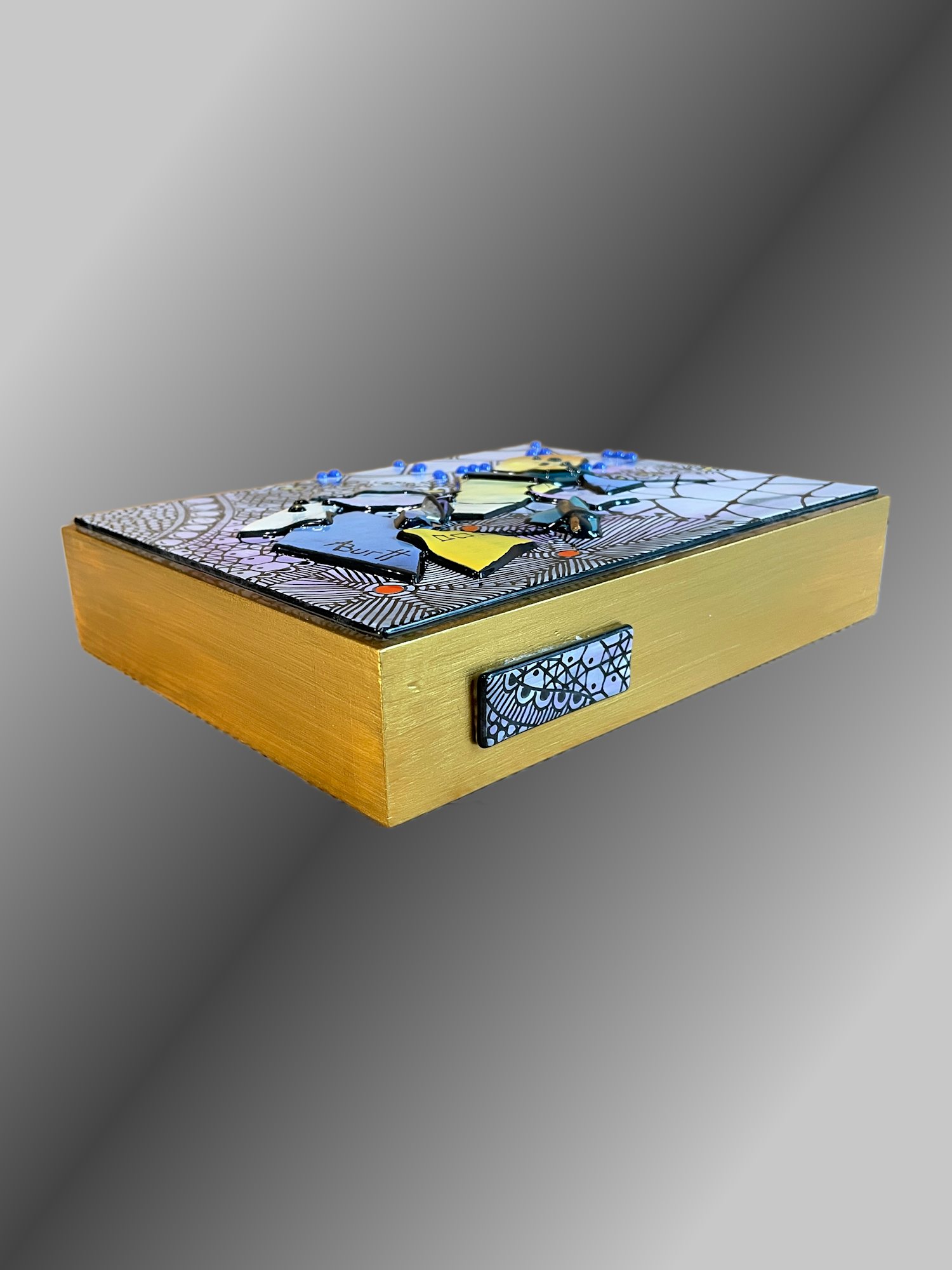 "Sticks and Stones" is adhered to a 10"x 8"x 2" wood panel painted a shiny gold and is ready to hang.