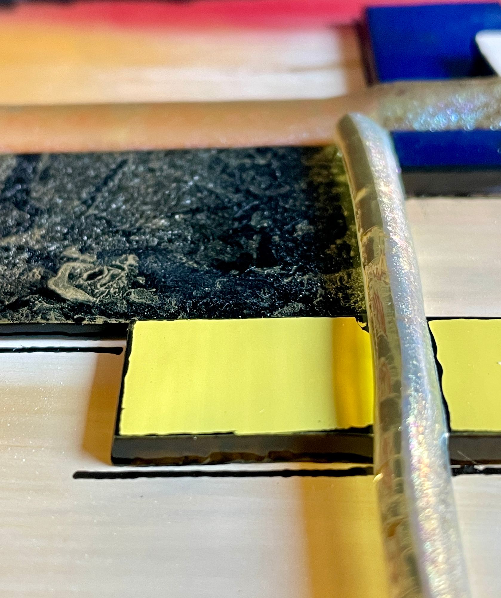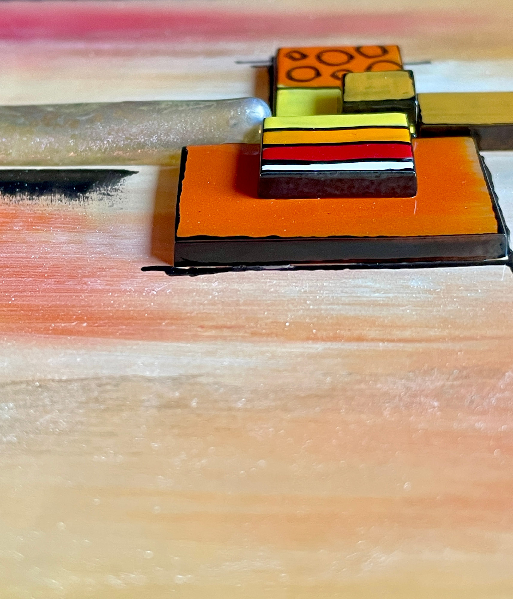 I painted the background design of “Summer in the City” using enamels created specifically for kiln fusing on art glass. Once I was satisfied with the background design, I began to add layers of small glass pieces to the surface, along with gold glass, standing on edge. All of these glass elements add texture and definition to this abstract design.